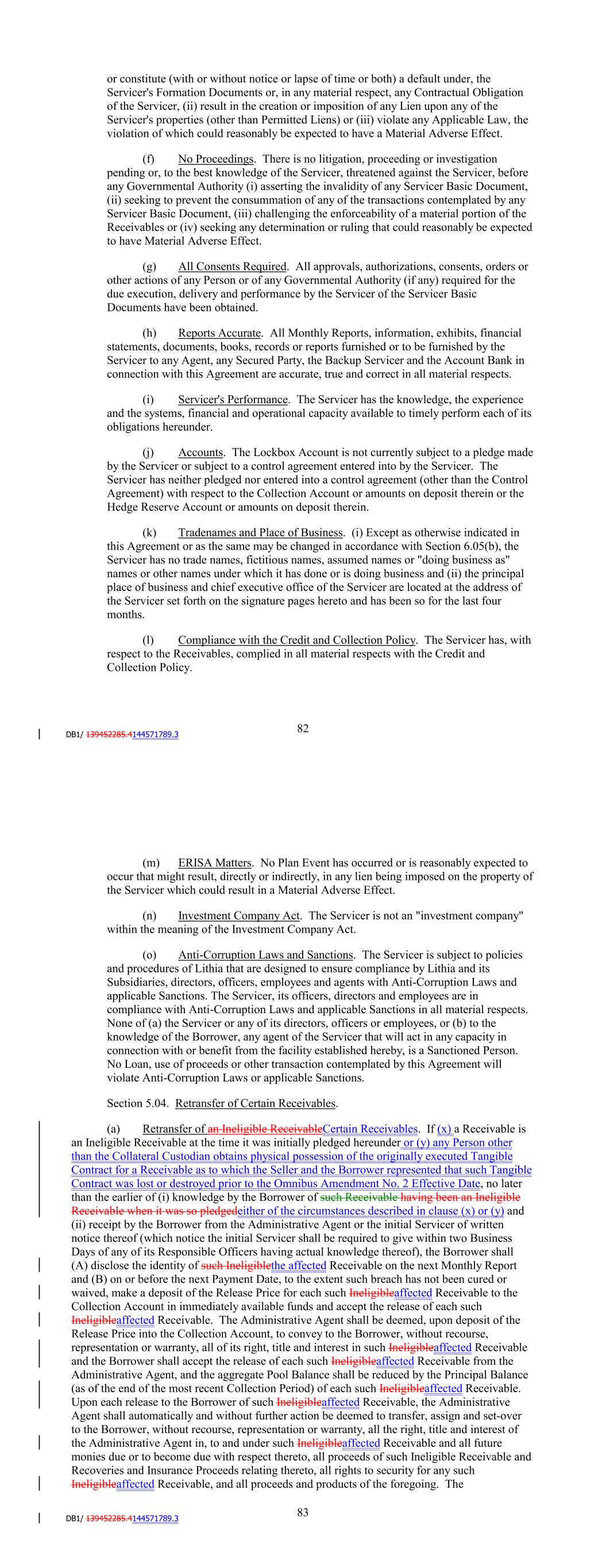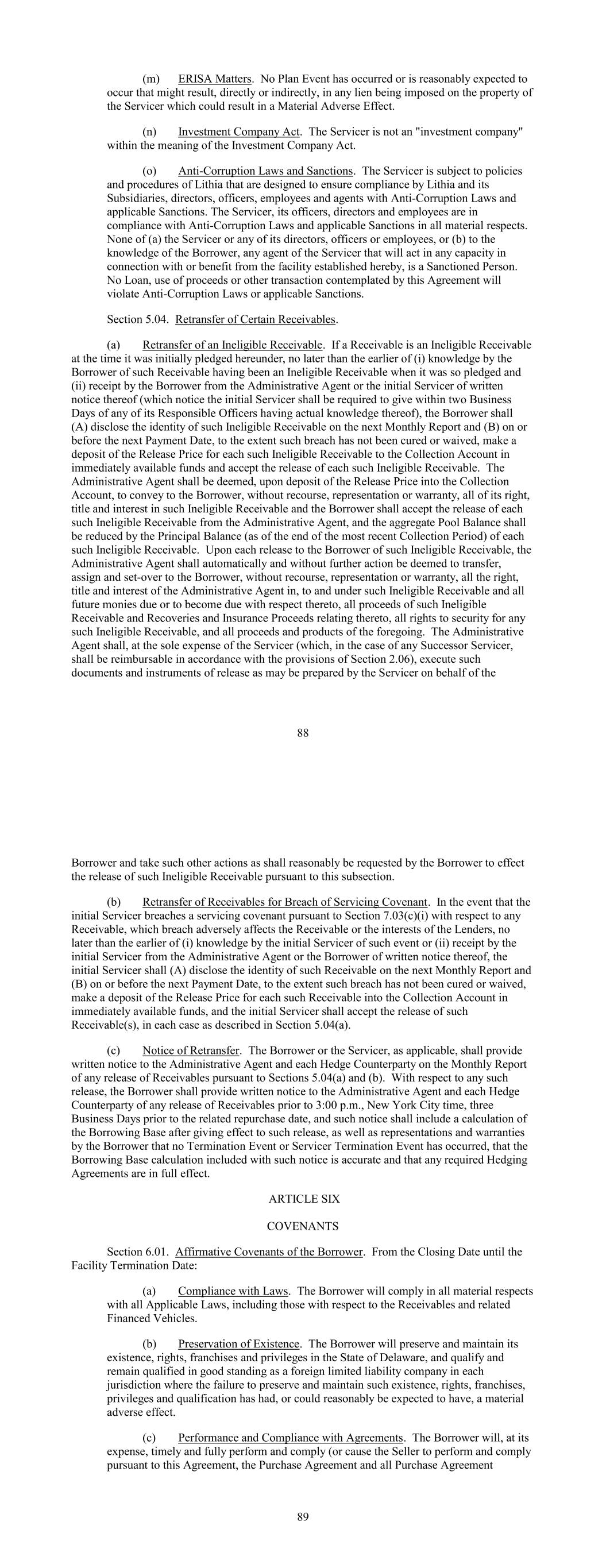 (m) ERISA Matters. No Plan Event has occurred or is reasonably expected to occur that might result, directly or indirectly, in any lien being imposed on the property of the Servicer which could result in a Material Adverse Effect. (n) Investment Company Act. The Servicer is not an "investment company" within the meaning of the Investment Company Act. (o) Anti-Corruption Laws and Sanctions. The Servicer is subject to policies and procedures of Lithia that are designed to ensure compliance by Lithia and its Subsidiaries, directors, officers, employees and agents with Anti-Corruption Laws and applicable Sanctions. The Servicer, its officers, directors and employees are in compliance with Anti-Corruption Laws and applicable Sanctions in all material respects. None of (a) the Servicer or any of its directors, officers or employees, or (b) to the knowledge of the Borrower, any agent of the Servicer that will act in any capacity in connection with or benefit from the facility established hereby, is a Sanctioned Person. No Loan, use of proceeds or other transaction contemplated by this Agreement will violate Anti-Corruption Laws or applicable Sanctions. Section 5.04. Retransfer of Certain Receivables. (a) Retransfer of an Ineligible Receivable. If a Receivable is an Ineligible Receivable at the time it was initially pledged hereunder, no later than the earlier of (i) knowledge by the Borrower of such Receivable having been an Ineligible Receivable when it was so pledged and (ii) receipt by the Borrower from the Administrative Agent or the initial Servicer of written notice thereof (which notice the initial Servicer shall be required to give within two Business Days of any of its Responsible Officers having actual knowledge thereof), the Borrower shall (A) disclose the identity of such Ineligible Receivable on the next Monthly Report and (B) on or before the next Payment Date, to the extent such breach has not been cured or waived, make a deposit of the Release Price for each such Ineligible Receivable to the Collection Account in immediately available funds and accept the release of each such Ineligible Receivable. The Administrative Agent shall be deemed, upon deposit of the Release Price into the Collection Account, to convey to the Borrower, without recourse, representation or warranty, all of its right, title and interest in such Ineligible Receivable and the Borrower shall accept the release of each such Ineligible Receivable from the Administrative Agent, and the aggregate Pool Balance shall be reduced by the Principal Balance (as of the end of the most recent Collection Period) of each such Ineligible Receivable. Upon each release to the Borrower of such Ineligible Receivable, the Administrative Agent shall automatically and without further action be deemed to transfer, assign and set-over to the Borrower, without recourse, representation or warranty, all the right, title and interest of the Administrative Agent in, to and under such Ineligible Receivable and all future monies due or to become due with respect thereto, all proceeds of such Ineligible Receivable and Recoveries and Insurance Proceeds relating thereto, all rights to security for any such Ineligible Receivable, and all proceeds and products of the foregoing. The Administrative Agent shall, at the sole expense of the Servicer (which, in the case of any Successor Servicer, shall be reimbursable in accordance with the provisions of Section 2.06), execute such documents and instruments of release as may be prepared by the Servicer on behalf of the 88 Borrower and take such other actions as shall reasonably be requested by the Borrower to effect the release of such Ineligible Receivable pursuant to this subsection. (b) Retransfer of Receivables for Breach of Servicing Covenant. In the event that the initial Servicer breaches a servicing covenant pursuant to Section 7.03(c)(i) with respect to any Receivable, which breach adversely affects the Receivable or the interests of the Lenders, no later than the earlier of (i) knowledge by the initial Servicer of such event or (ii) receipt by the initial Servicer from the Administrative Agent or the Borrower of written notice thereof, the initial Servicer shall (A) disclose the identity of such Receivable on the next Monthly Report and (B) on or before the next Payment Date, to the extent such breach has not been cured or waived, make a deposit of the Release Price for each such Receivable into the Collection Account in immediately available funds, and the initial Servicer shall accept the release of such Receivable(s), in each case as described in Section 5.04(a). (c) Notice of Retransfer. The Borrower or the Servicer, as applicable, shall provide written notice to the Administrative Agent and each Hedge Counterparty on the Monthly Report of any release of Receivables pursuant to Sections 5.04(a) and (b). With respect to any such release, the Borrower shall provide written notice to the Administrative Agent and each Hedge Counterparty of any release of Receivables prior to 3:00 p.m., New York City time, three Business Days prior to the related repurchase date, and such notice shall include a calculation of the Borrowing Base after giving effect to such release, as well as representations and warranties by the Borrower that no Termination Event or Servicer Termination Event has occurred, that the Borrowing Base calculation included with such notice is accurate and that any required Hedging Agreements are in full effect. ARTICLE SIX COVENANTS Section 6.01. Affirmative Covenants of the Borrower. From the Closing Date until the Facility Termination Date: (a) Compliance with Laws. The Borrower will comply in all material respects with all Applicable Laws, including those with respect to the Receivables and related Financed Vehicles. (b) Preservation of Existence. The Borrower will preserve and maintain its existence, rights, franchises and privileges in the State of Delaware, and qualify and re