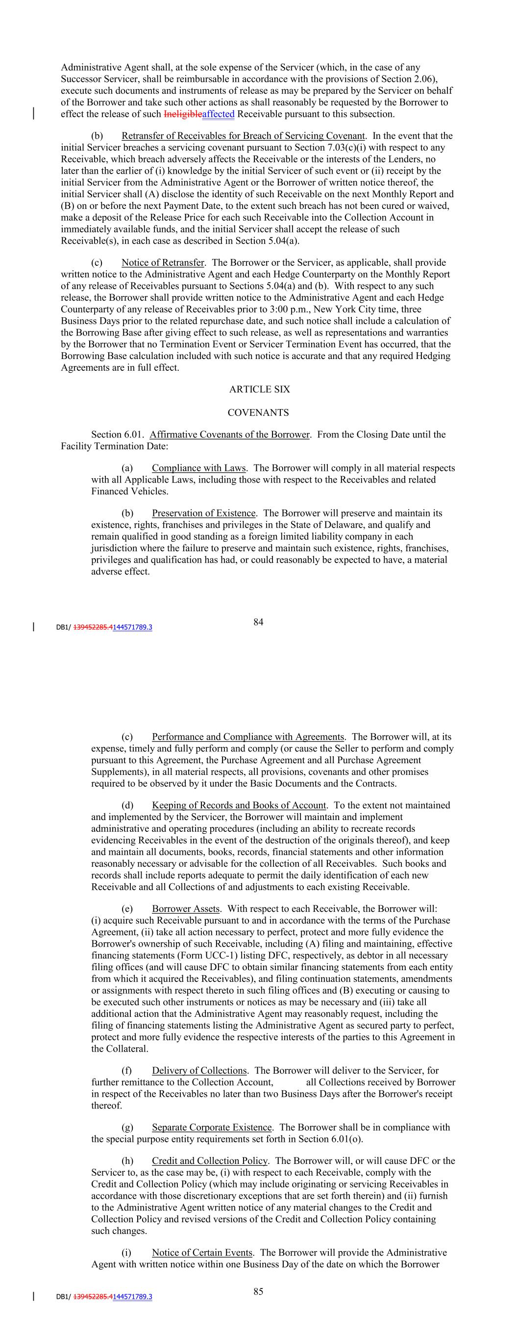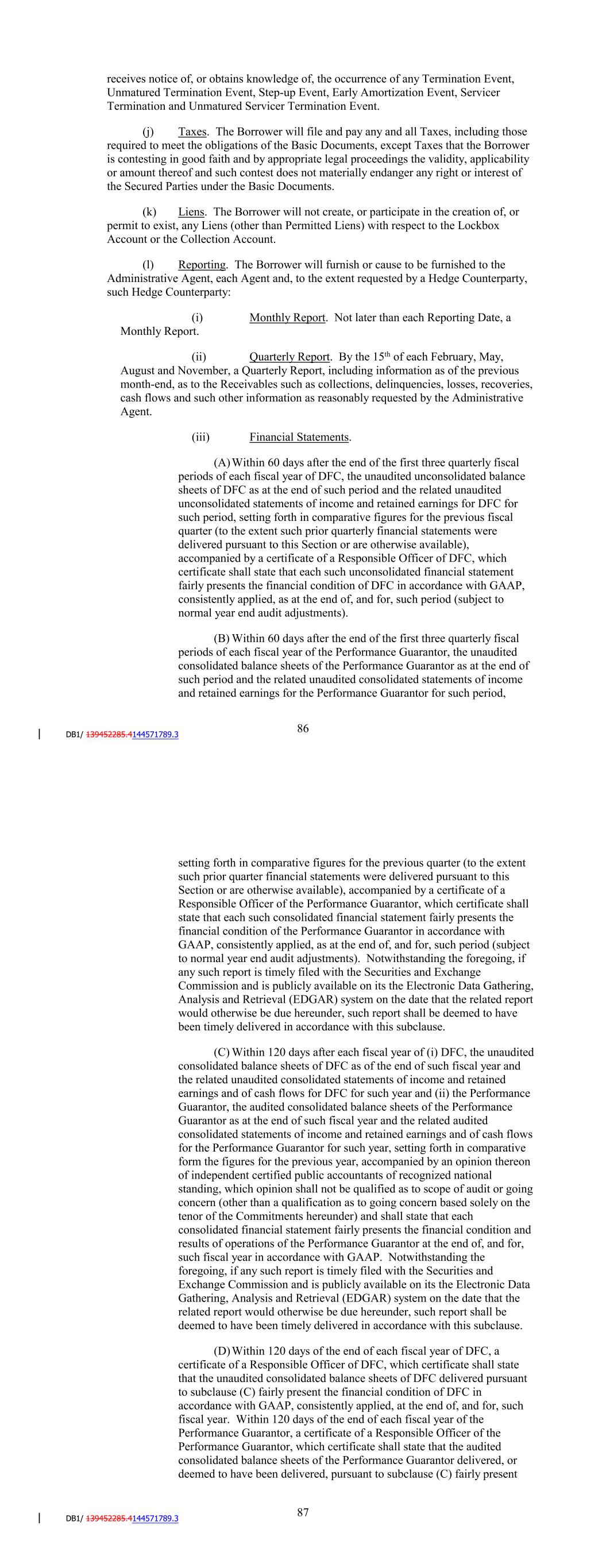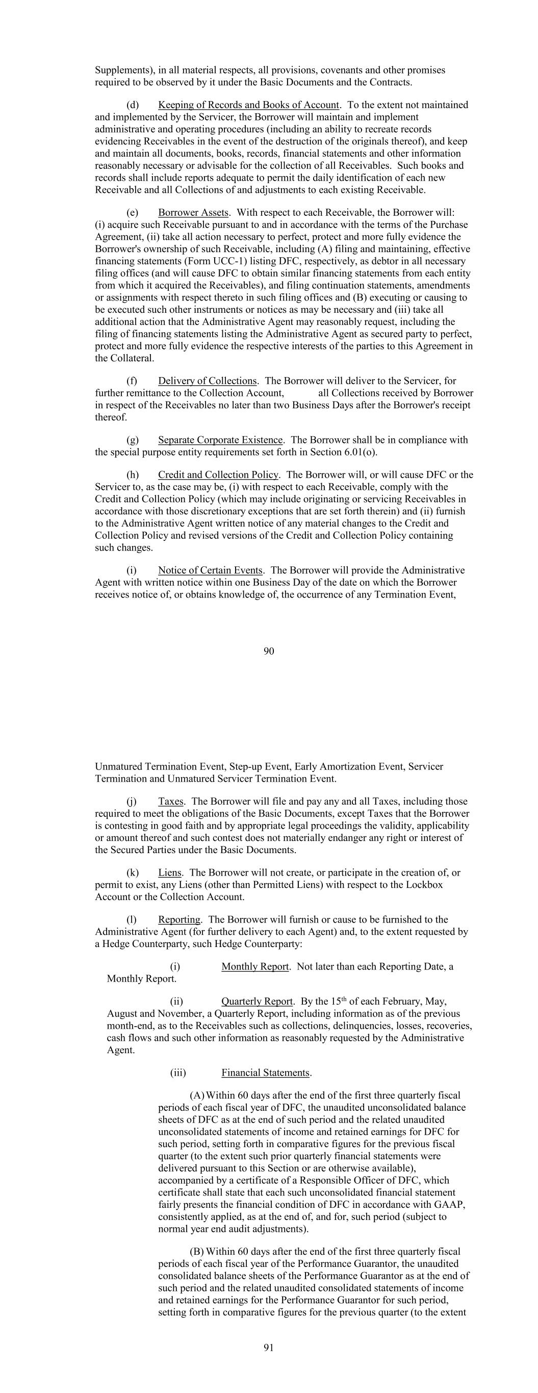 Supplements), in all material respects, all provisions, covenants and other promises required to be observed by it under the Basic Documents and the Contracts. (d) Keeping of Records and Books of Account. To the extent not maintained and implemented by the Servicer, the Borrower will maintain and implement administrative and operating procedures (including an ability to recreate records evidencing Receivables in the event of the destruction of the originals thereof), and keep and maintain all documents, books, records, financial statements and other information reasonably necessary or advisable for the collection of all Receivables. Such books and records shall include reports adequate to permit the daily identification of each new Receivable and all Collections of and adjustments to each existing Receivable. (e) Borrower Assets. With respect to each Receivable, the Borrower will: (i) acquire such Receivable pursuant to and in accordance with the terms of the Purchase Agreement, (ii) take all action necessary to perfect, protect and more fully evidence the Borrower's ownership of such Receivable, including (A) filing and maintaining, effective financing statements (Form UCC-1) listing DFC, respectively, as debtor in all necessary filing offices (and will cause DFC to obtain similar financing statements from each entity from which it acquired the Receivables), and filing continuation statements, amendments or assignments with respect thereto in such filing offices and (B) executing or causing to be executed such other instruments or notices as may be necessary and (iii) take all additional action that the Administrative Agent may reasonably request, including the filing of financing statements listing the Administrative Agent as secured party to perfect, protect and more fully evidence the respective interests of the parties to this Agreement in the Collateral. (f) Delivery of Collections. The Borrower will deliver to the Servicer, for further remittance to the Collection Account, all Collections received by Borrower in respect of the Receivables no later than two Business Days after the Borrower's receipt thereof. (g) Separate Corporate Existence. The Borrower shall be in compliance with the special purpose entity requirements set forth in Section 6.01(o). (h) Credit and Collection Policy. The Borrower will, or will cause DFC or the Servicer to, as the case may be, (i) with respect to each Receivable, comply with the Credit and Collection Policy (which may include originating or servicing Receivables in accordance with those discretionary exceptions that are set forth therein) and (ii) furnish to the Administrative Agent written notice of any material changes to the Credit and Collection Policy and revised versions of the Credit and Collection Policy containing such changes. (i) Notice of Certain Events. The Borrower will provide the Administrative Agent with written notice within one Business Day of the date on which the Borrower receives notice of, or obtains knowledge of, the occurrence of any Termination Event, 90 Unmatured Termination Event, Step-up Event, Early Amortization Event, Servicer Termination and Unmatured Servicer Termination Event. (j) Taxes. The Borrower will file and pay any and all Taxes, including those required to meet the obligations of the Basic Documents, except Taxes that the Borrower is contesting in good faith and by appropriate legal proceedings the validity, applicability or amount thereof and such contest does not materially endanger any right or interest of the Secured Parties under the Basic Documents. (k) Liens. The Borrower will not create, or participate in the creation of, or permit to exist, any Liens (other than Permitted Liens) with respect to the Lockbox Account or the Collection Account. (l) Reporting. The Borrower will furnish or cause to be furnished to the Administrative Agent (for further delivery to each Agent) and, to the extent requested by a Hedge Counterparty, such Hedge Counterparty: (i) Monthly Report. Not later than each Reporting Date, a Monthly Report. (ii) Quarterly Report. By the 15th of each February, May, August and November, a Quarterly Report, including information as of the previous month-end, as to the Receivables such as collections, delinquencies, losses, recoveries, cash flows and such other information as reasonably requested by the Administrative Agent. (iii) Financial Statements. (A)Within 60 days after the end of the first three quarterly fiscal periods of each fiscal year of DFC, the unaudited unconsolidated balance sheets of DFC as at the end of such period and the related unaudited unconsolidated statements of income and retained earnings for DFC for such period, setting forth in comparative figures for the previous fiscal quarter (to the extent such prior quarterly financial statements were delivered pursuant to this Section or are otherwise available), accompanied by a certificate of a Responsible Officer of DFC, which certificate shall state that each such unconsolidated financial statement fairly presents the financial condition of DFC in accordance with GAAP, consistently applied, as at the end of, and for, such period (subject to normal year end audit adjustments). (B) Within 60 days after the end of the first three quarterly fiscal periods of each fiscal year of the Performance Guarantor, the unaudited consolidated balance sheets of the Performance Guarantor as at the end of such period and the related unaudited consolidated statements of income and retained earnings for the Performance Guarantor for such period, setting forth in comparative figures for the previous quarter (to the extent 91