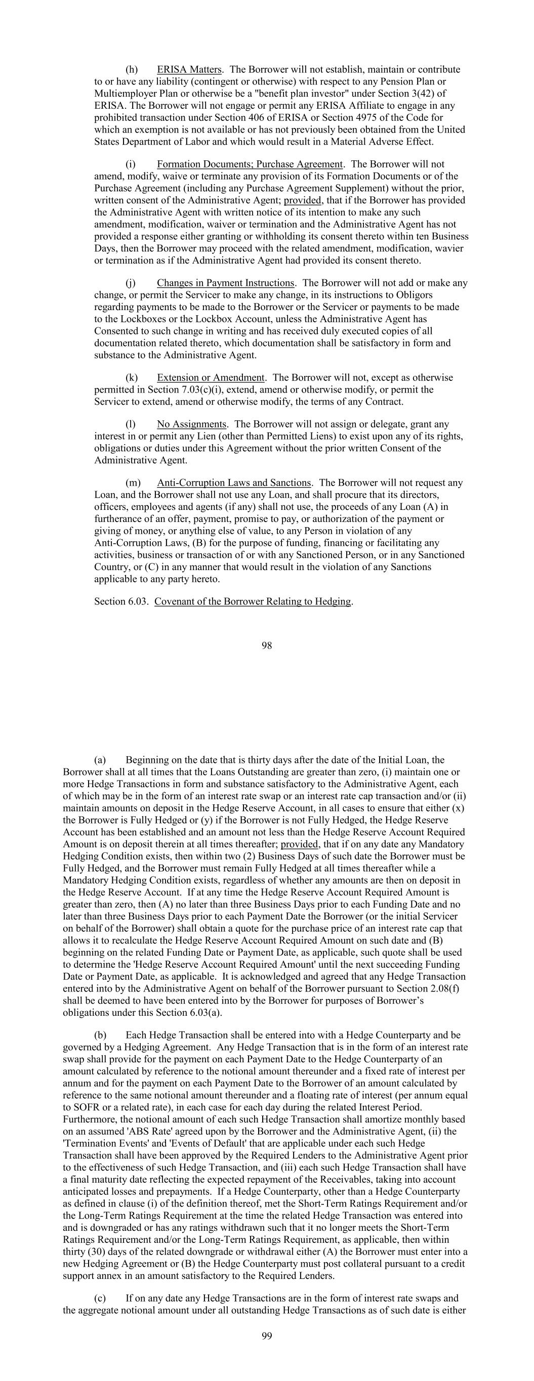 (h) ERISA Matters. The Borrower will not establish, maintain or contribute to or have any liability (contingent or otherwise) with respect to any Pension Plan or Multiemployer Plan or otherwise be a "benefit plan investor" under Section 3(42) of ERISA. The Borrower will not engage or permit any ERISA Affiliate to engage in any prohibited transaction under Section 406 of ERISA or Section 4975 of the Code for which an exemption is not available or has not previously been obtained from the United States Department of Labor and which would result in a Material Adverse Effect. (i) Formation Documents; Purchase Agreement. The Borrower will not amend, modify, waive or terminate any provision of its Formation Documents or of the Purchase Agreement (including any Purchase Agreement Supplement) without the prior, written consent of the Administrative Agent; provided, that if the Borrower has provided the Administrative Agent with written notice of its intention to make any such amendment, modification, waiver or termination and the Administrative Agent has not provided a response either granting or withholding its consent thereto within ten Business Days, then the Borrower may proceed with the related amendment, modification, wavier or termination as if the Administrative Agent had provided its consent thereto. (j) Changes in Payment Instructions. The Borrower will not add or make any change, or permit the Servicer to make any change, in its instructions to Obligors regarding payments to be made to the Borrower or the Servicer or payments to be made to the Lockboxes or the Lockbox Account, unless the Administrative Agent has Consented to such change in writing and has received duly executed copies of all documentation related thereto, which documentation shall be satisfactory in form and substance to the Administrative Agent. (k) Extension or Amendment. The Borrower will not, except as otherwise permitted in Section 7.03(c)(i), extend, amend or otherwise modify, or permit the Servicer to extend, amend or otherwise modify, the terms of any Contract. (l) No Assignments. The Borrower will not assign or delegate, grant any interest in or permit any Lien (other than Permitted Liens) to exist upon any of its rights, obligations or duties under this Agreement without the prior written Consent of the Administrative Agent. (m) Anti-Corruption Laws and Sanctions. The Borrower will not request any Loan, and the Borrower shall not use any Loan, and shall procure that its directors, officers, employees and agents (if any) shall not use, the proceeds of any Loan (A) in furtherance of an offer, payment, promise to pay, or authorization of the payment or giving of money, or anything else of value, to any Person in violation of any Anti-Corruption Laws, (B) for the purpose of funding, financing or facilitating any activities, business or transaction of or with any Sanctioned Person, or in any Sanctioned Country, or (C) in any manner that would result in the violation of any Sanctions applicable to any party hereto. Section 6.03. Covenant of the Borrower Relating to Hedging. 98 (a) Beginning on the date that is thirty days after the date of the Initial Loan, the Borrower shall at all times that the Loans Outstanding are greater than zero, (i) maintain one or more Hedge Transactions in form and substance satisfactory to the Administrative Agent, each of which may be in the form of an interest rate swap or an interest rate cap transaction and/or (ii) maintain amounts on deposit in the Hedge Reserve Account, in all cases to ensure that either (x) the Borrower is Fully Hedged or (y) if the Borrower is not Fully Hedged, the Hedge Reserve Account has been established and an amount not less than the Hedge Reserve Account Required Amount is on deposit therein at all times thereafter; provided, that if on any date any Mandatory Hedging Condition exists, then within two (2) Business Days of such date the Borrower must be Fully Hedged, and the Borrower must remain Fully Hedged at all times thereafter while a Mandatory Hedging Condition exists, regardless of whether any amounts are then on deposit in the Hedge Reserve Account. If at any time the Hedge Reserve Account Required Amount is greater than zero, then (A) no later than three Business Days prior to each Funding Date and no later than three Business Days prior to each Payment Date the Borrower (or the initial Servicer on behalf of the Borrower) shall obtain a quote for the purchase price of an interest rate cap that allows it to recalculate the Hedge Reserve Account Required Amount on such date and (B) beginning on the related Funding Date or Payment Date, as applicable, such quote shall be used to determine the 'Hedge Reserve Account Required Amount' until the next succeeding Funding Date or Payment Date, as applicable. It is acknowledged and agreed that any Hedge Transaction entered into by the Administrative Agent on behalf of the Borrower pursuant to Section 2.08(f) shall be deemed to have been entered into by the Borrower for purposes of Borrower’s obligations under this Section 6.03(a). (b) Each Hedge Transaction shall be entered into with a Hedge Counterparty and be governed by a Hedging Agreement. Any Hedge Transaction that is in the form of an interest rate swap shall provide for the payment on each Payment Date to the Hedge Counterparty of an amount calculated by reference to the notional amount thereunder and a fixed rate of interest per annum and for the payment on each Payment Date to the Borrower of an amount calculated by reference to the same notional amount thereunder and a floating rate of interest (per annum equal to SOFR or a related rate), in each case for each day during the related Interest Period. Furthermore, the notional amount of each such Hedge Transaction shall amortize monthly based on an assumed 'ABS Rate' agreed upon by the Borrower and the Administrative Agent, (ii) the 'Termination Events' and 'Events of Default' that are applicable un