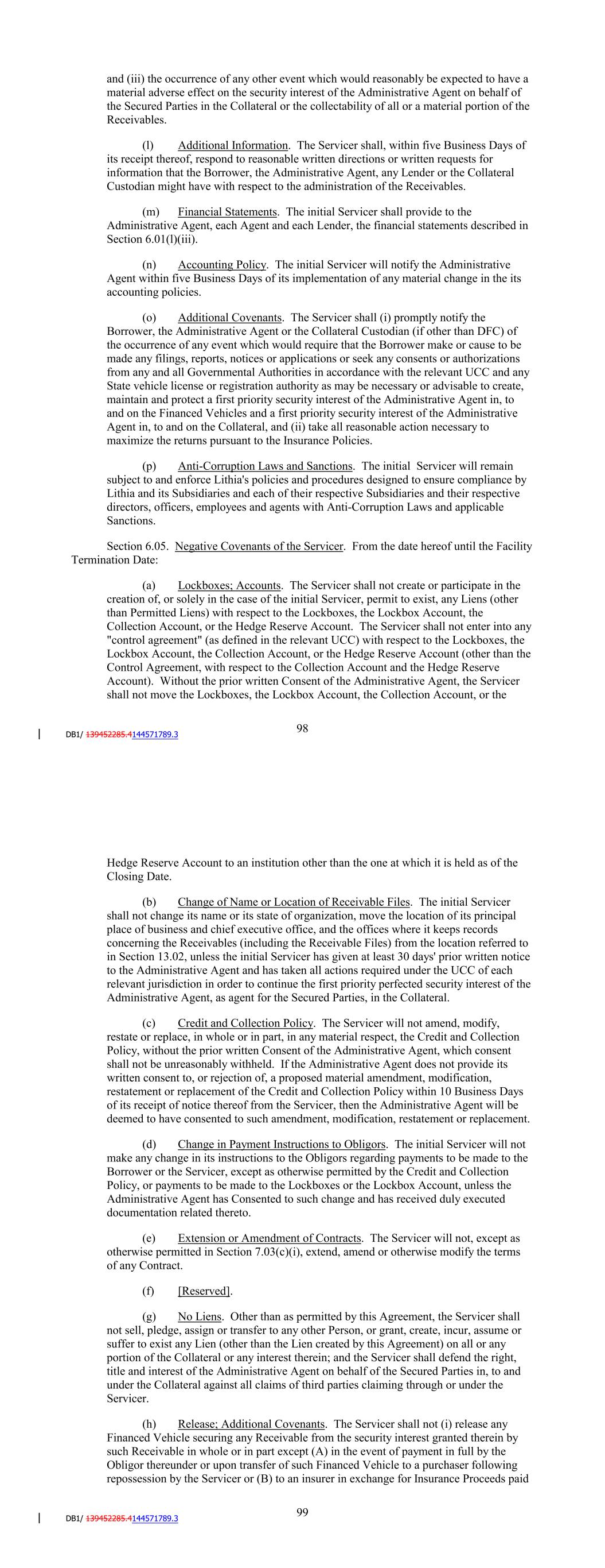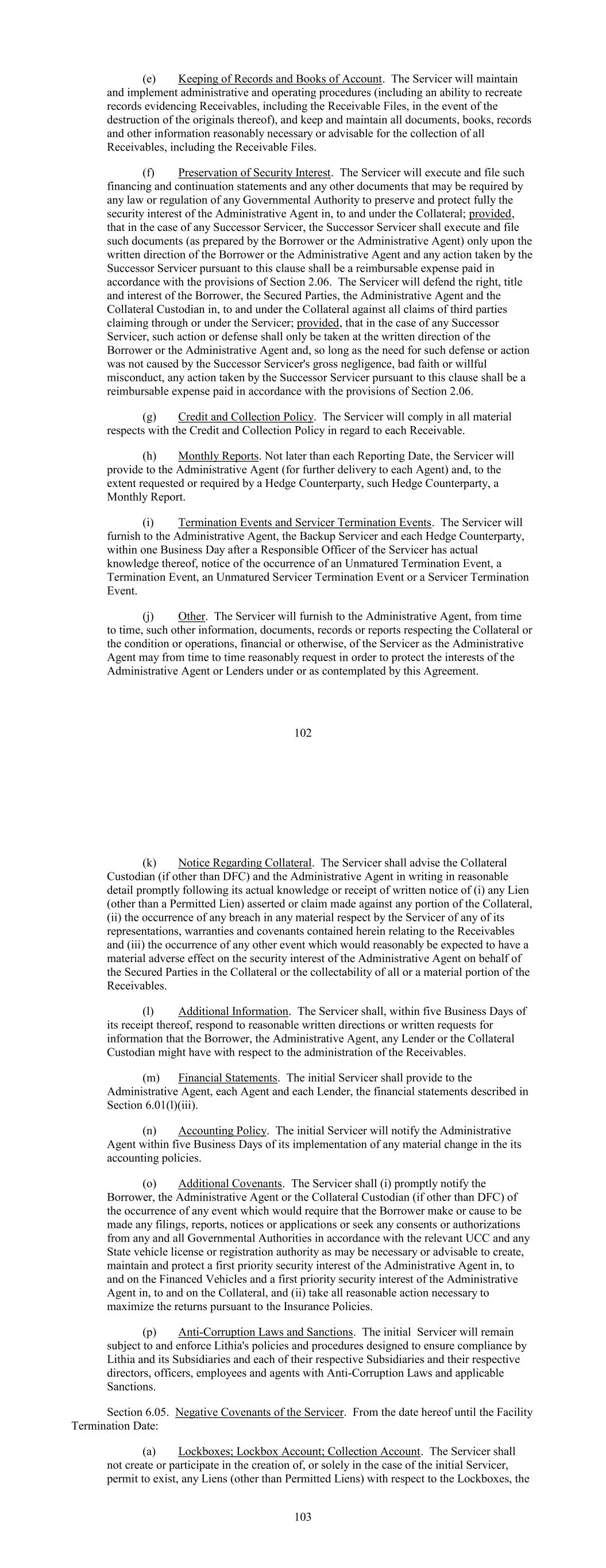 (e) Keeping of Records and Books of Account. The Servicer will maintain and implement administrative and operating procedures (including an ability to recreate records evidencing Receivables, including the Receivable Files, in the event of the destruction of the originals thereof), and keep and maintain all documents, books, records and other information reasonably necessary or advisable for the collection of all Receivables, including the Receivable Files. (f) Preservation of Security Interest. The Servicer will execute and file such financing and continuation statements and any other documents that may be required by any law or regulation of any Governmental Authority to preserve and protect fully the security interest of the Administrative Agent in, to and under the Collateral; provided, that in the case of any Successor Servicer, the Successor Servicer shall execute and file such documents (as prepared by the Borrower or the Administrative Agent) only upon the written direction of the Borrower or the Administrative Agent and any action taken by the Successor Servicer pursuant to this clause shall be a reimbursable expense paid in accordance with the provisions of Section 2.06. The Servicer will defend the right, title and interest of the Borrower, the Secured Parties, the Administrative Agent and the Collateral Custodian in, to and under the Collateral against all claims of third parties claiming through or under the Servicer; provided, that in the case of any Successor Servicer, such action or defense shall only be taken at the written direction of the Borrower or the Administrative Agent and, so long as the need for such defense or action was not caused by the Successor Servicer's gross negligence, bad faith or willful misconduct, any action taken by the Successor Servicer pursuant to this clause shall be a reimbursable expense paid in accordance with the provisions of Section 2.06. (g) Credit and Collection Policy. The Servicer will comply in all material respects with the Credit and Collection Policy in regard to each Receivable. (h) Monthly Reports. Not later than each Reporting Date, the Servicer will provide to the Administrative Agent (for further delivery to each Agent) and, to the extent requested or required by a Hedge Counterparty, such Hedge Counterparty, a Monthly Report. (i) Termination Events and Servicer Termination Events. The Servicer will furnish to the Administrative Agent, the Backup Servicer and each Hedge Counterparty, within one Business Day after a Responsible Officer of the Servicer has actual knowledge thereof, notice of the occurrence of an Unmatured Termination Event, a Termination Event, an Unmatured Servicer Termination Event or a Servicer Termination Event. (j) Other. The Servicer will furnish to the Administrative Agent, from time to time, such other information, documents, records or reports respecting the Collateral or the condition or operations, financial or otherwise, of the Servicer as the Administrative Agent may from time to time reasonably request in order to protect the interests of the Administrative Agent or Lenders under or as contemplated by this Agreement. 102 (k) Notice Regarding Collateral. The Servicer shall advise the Collateral Custodian (if other than DFC) and the Administrative Agent in writing in reasonable detail promptly following its actual knowledge or receipt of written notice of (i) any Lien (other than a Permitted Lien) asserted or claim made against any portion of the Collateral, (ii) the occurrence of any breach in any material respect by the Servicer of any of its representations, warranties and covenants contained herein relating to the Receivables and (iii) the occurrence of any other event which would reasonably be expected to have a material adverse effect on the security interest of the Administrative Agent on behalf of the Secured Parties in the Collateral or the collectability of all or a material portion of the Receivables. (l) Additional Information. The Servicer shall, within five Business Days of its receipt thereof, respond to reasonable written directions or written requests for information that the Borrower, the Administrative Agent, any Lender or the Collateral Custodian might have with respect to the administration of the Receivables. (m) Financial Statements. The initial Servicer shall provide to the Administrative Agent, each Agent and each Lender, the financial statements described in Section 6.01(l)(iii). (n) Accounting Policy. The initial Servicer will notify the Administrative Agent within five Business Days of its implementation of any material change in the its accounting policies. (o) Additional Covenants. The Servicer shall (i) promptly notify the Borrower, the Administrative Agent or the Collateral Custodian (if other than DFC) of the occurrence of any event which would require that the Borrower make or cause to be made any filings, reports, notices or applications or seek any consents or authorizations from any and all Governmental Authorities in accordance with the relevant UCC and any State vehicle license or registration authority as may be necessary or advisable to create, maintain and protect a first priority security interest of the Administrative Agent in, to and on the Financed Vehicles and a first priority security interest of the Administrative Agent in, to and on the Collateral, and (ii) take all reasonable action necessary to maximize the returns pursuant to the Insurance Policies. (p) Anti-Corruption Laws and Sanctions. The initial Servicer will remain subject to and enforce Lithia's policies and procedures designed to ensure compliance by Lithia and its Subsidiaries and each of their respective Subsidiaries and their respective directors, officers, employees and agents with Anti-Corruption Laws and applicable Sanctions. Section 6.05. Negative Covenants of the Servicer. From the date hereof until the Facility Termination Date: (a) Lockboxes; Lockbox Account; Collection Account.