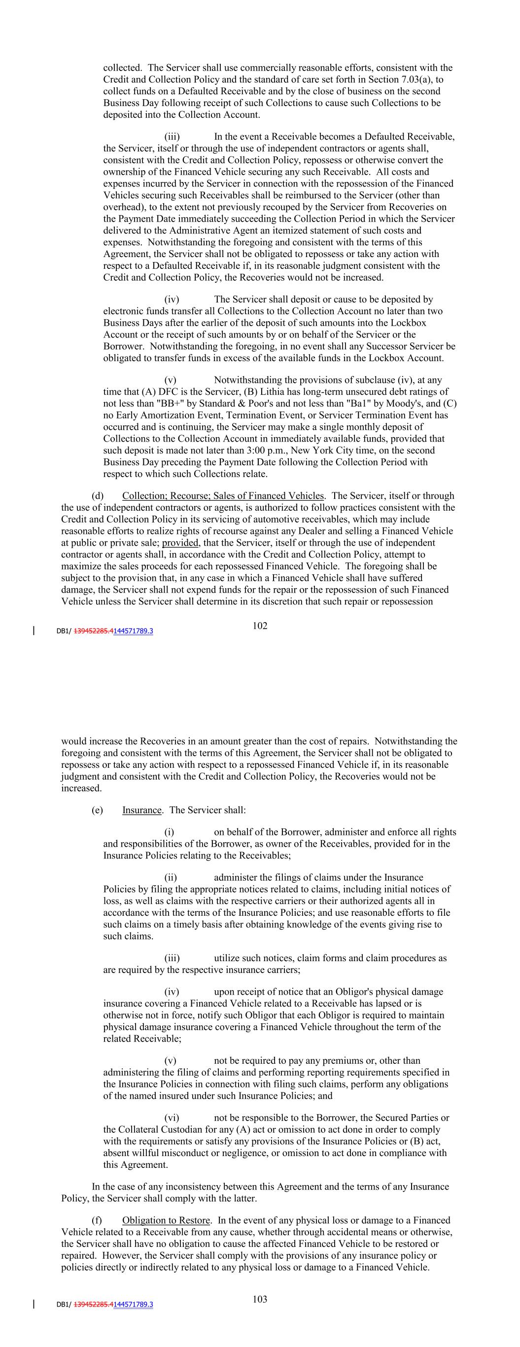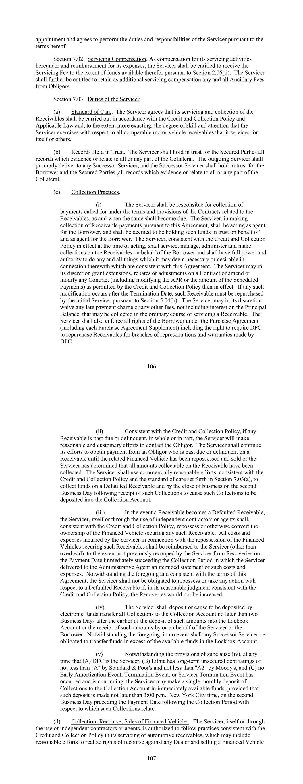 appointment and agrees to perform the duties and responsibilities of the Servicer pursuant to the terms hereof. Section 7.02. Servicing Compensation. As compensation for its servicing activities hereunder and reimbursement for its expenses, the Servicer shall be entitled to receive the Servicing Fee to the extent of funds available therefor pursuant to Section 2.06(ii). The Servicer shall further be entitled to retain as additional servicing compensation any and all Ancillary Fees from Obligors. Section 7.03. Duties of the Servicer. (a) Standard of Care. The Servicer agrees that its servicing and collection of the Receivables shall be carried out in accordance with the Credit and Collection Policy and Applicable Law and, to the extent more exacting, the degree of skill and attention that the Servicer exercises with respect to all comparable motor vehicle receivables that it services for itself or others. (b) Records Held in Trust. The Servicer shall hold in trust for the Secured Parties all records which evidence or relate to all or any part of the Collateral. The outgoing Servicer shall promptly deliver to any Successor Servicer, and the Successor Servicer shall hold in trust for the Borrower and the Secured Parties ,all records which evidence or relate to all or any part of the Collateral. (c) Collection Practices. (i) The Servicer shall be responsible for collection of payments called for under the terms and provisions of the Contracts related to the Receivables, as and when the same shall become due. The Servicer, in making collection of Receivable payments pursuant to this Agreement, shall be acting as agent for the Borrower, and shall be deemed to be holding such funds in trust on behalf of and as agent for the Borrower. The Servicer, consistent with the Credit and Collection Policy in effect at the time of acting, shall service, manage, administer and make collections on the Receivables on behalf of the Borrower and shall have full power and authority to do any and all things which it may deem necessary or desirable in connection therewith which are consistent with this Agreement. The Servicer may in its discretion grant extensions, rebates or adjustments on a Contract or amend or modify any Contract (including modifying the APR or the amount of the Scheduled Payments) as permitted by the Credit and Collection Policy then in effect. If any such modification occurs after the Termination Date, such Receivable must be repurchased by the initial Servicer pursuant to Section 5.04(b). The Servicer may in its discretion waive any late payment charge or any other fees, not including interest on the Principal Balance, that may be collected in the ordinary course of servicing a Receivable. The Servicer shall also enforce all rights of the Borrower under the Purchase Agreement (including each Purchase Agreement Supplement) including the right to require DFC to repurchase Receivables for breaches of representations and warranties made by DFC. 106 (ii) Consistent with the Credit and Collection Policy, if any Receivable is past due or delinquent, in whole or in part, the Servicer will make reasonable and customary efforts to contact the Obligor. The Servicer shall continue its efforts to obtain payment from an Obligor who is past due or delinquent on a Receivable until the related Financed Vehicle has been repossessed and sold or the Servicer has determined that all amounts collectable on the Receivable have been collected. The Servicer shall use commercially reasonable efforts, consistent with the Credit and Collection Policy and the standard of care set forth in Section 7.03(a), to collect funds on a Defaulted Receivable and by the close of business on the second Business Day following receipt of such Collections to cause such Collections to be deposited into the Collection Account. (iii) In the event a Receivable becomes a Defaulted Receivable, the Servicer, itself or through the use of independent contractors or agents shall, consistent with the Credit and Collection Policy, repossess or otherwise convert the ownership of the Financed Vehicle securing any such Receivable. All costs and expenses incurred by the Servicer in connection with the repossession of the Financed Vehicles securing such Receivables shall be reimbursed to the Servicer (other than overhead), to the extent not previously recouped by the Servicer from Recoveries on the Payment Date immediately succeeding the Collection Period in which the Servicer delivered to the Administrative Agent an itemized statement of such costs and expenses. Notwithstanding the foregoing and consistent with the terms of this Agreement, the Servicer shall not be obligated to repossess or take any action with respect to a Defaulted Receivable if, in its reasonable judgment consistent with the Credit and Collection Policy, the Recoveries would not be increased. (iv) The Servicer shall deposit or cause to be deposited by electronic funds transfer all Collections to the Collection Account no later than two Business Days after the earlier of the deposit of such amounts into the Lockbox Account or the receipt of such amounts by or on behalf of the Servicer or the Borrower. Notwithstanding the foregoing, in no event shall any Successor Servicer be obligated to transfer funds in excess of the available funds in the Lockbox Account. (v) Notwithstanding the provisions of subclause (iv), at any time that (A) DFC is the Servicer, (B) Lithia has long-term unsecured debt ratings of not less than "A" by Standard & Poor's and not less than "A2" by Moody's, and (C) no Early Amortization Event, Termination Event, or Servicer Termination Event has occurred and is continuing, the Servicer may make a single monthly deposit of Collections to the Collection Account in immediately available funds, provided that such deposit is made not later than 3:00 p.m., New York City time, on the second Business Day preceding the Payment Date following the Collection Period with resp