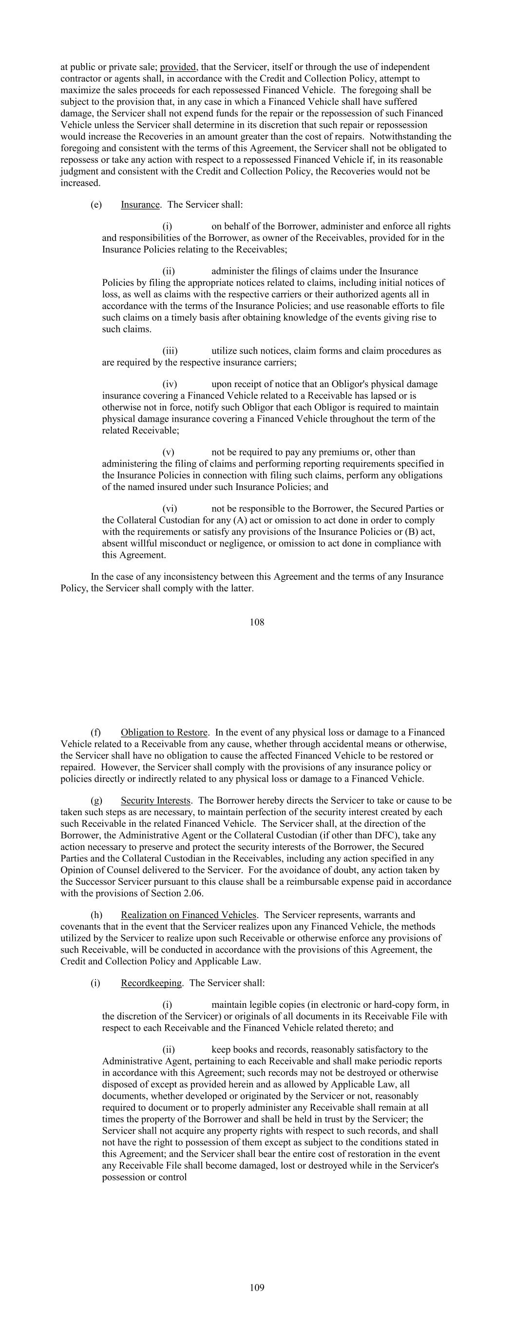 at public or private sale; provided, that the Servicer, itself or through the use of independent contractor or agents shall, in accordance with the Credit and Collection Policy, attempt to maximize the sales proceeds for each repossessed Financed Vehicle. The foregoing shall be subject to the provision that, in any case in which a Financed Vehicle shall have suffered damage, the Servicer shall not expend funds for the repair or the repossession of such Financed Vehicle unless the Servicer shall determine in its discretion that such repair or repossession would increase the Recoveries in an amount greater than the cost of repairs. Notwithstanding the foregoing and consistent with the terms of this Agreement, the Servicer shall not be obligated to repossess or take any action with respect to a repossessed Financed Vehicle if, in its reasonable judgment and consistent with the Credit and Collection Policy, the Recoveries would not be increased. (e) Insurance. The Servicer shall: (i) on behalf of the Borrower, administer and enforce all rights and responsibilities of the Borrower, as owner of the Receivables, provided for in the Insurance Policies relating to the Receivables; (ii) administer the filings of claims under the Insurance Policies by filing the appropriate notices related to claims, including initial notices of loss, as well as claims with the respective carriers or their authorized agents all in accordance with the terms of the Insurance Policies; and use reasonable efforts to file such claims on a timely basis after obtaining knowledge of the events giving rise to such claims. (iii) utilize such notices, claim forms and claim procedures as are required by the respective insurance carriers; (iv) upon receipt of notice that an Obligor's physical damage insurance covering a Financed Vehicle related to a Receivable has lapsed or is otherwise not in force, notify such Obligor that each Obligor is required to maintain physical damage insurance covering a Financed Vehicle throughout the term of the related Receivable; (v) not be required to pay any premiums or, other than administering the filing of claims and performing reporting requirements specified in the Insurance Policies in connection with filing such claims, perform any obligations of the named insured under such Insurance Policies; and (vi) not be responsible to the Borrower, the Secured Parties or the Collateral Custodian for any (A) act or omission to act done in order to comply with the requirements or satisfy any provisions of the Insurance Policies or (B) act, absent willful misconduct or negligence, or omission to act done in compliance with this Agreement. In the case of any inconsistency between this Agreement and the terms of any Insurance Policy, the Servicer shall comply with the latter. 108 (f) Obligation to Restore. In the event of any physical loss or damage to a Financed Vehicle related to a Receivable from any cause, whether through accidental means or otherwise, the Servicer shall have no obligation to cause the affected Financed Vehicle to be restored or repaired. However, the Servicer shall comply with the provisions of any insurance policy or policies directly or indirectly related to any physical loss or damage to a Financed Vehicle. (g) Security Interests. The Borrower hereby directs the Servicer to take or cause to be taken such steps as are necessary, to maintain perfection of the security interest created by each such Receivable in the related Financed Vehicle. The Servicer shall, at the direction of the Borrower, the Administrative Agent or the Collateral Custodian (if other than DFC), take any action necessary to preserve and protect the security interests of the Borrower, the Secured Parties and the Collateral Custodian in the Receivables, including any action specified in any Opinion of Counsel delivered to the Servicer. For the avoidance of doubt, any action taken by the Successor Servicer pursuant to this clause shall be a reimbursable expense paid in accordance with the provisions of Section 2.06. (h) Realization on Financed Vehicles. The Servicer represents, warrants and covenants that in the event that the Servicer realizes upon any Financed Vehicle, the methods utilized by the Servicer to realize upon such Receivable or otherwise enforce any provisions of such Receivable, will be conducted in accordance with the provisions of this Agreement, the Credit and Collection Policy and Applicable Law. (i) Recordkeeping. The Servicer shall: (i) maintain legible copies (in electronic or hard-copy form, in the discretion of the Servicer) or originals of all documents in its Receivable File with respect to each Receivable and the Financed Vehicle related thereto; and (ii) keep books and records, reasonably satisfactory to the Administrative Agent, pertaining to each Receivable and shall make periodic reports in accordance with this Agreement; such records may not be destroyed or otherwise disposed of except as provided herein and as allowed by Applicable Law, all documents, whether developed or originated by the Servicer or not, reasonably required to document or to properly administer any Receivable shall remain at all times the property of the Borrower and shall be held in trust by the Servicer; the Servicer shall not acquire any property rights with respect to such records, and shall not have the right to possession of them except as subject to the conditions stated in this Agreement; and the Servicer shall bear the entire cost of restoration in the event any Receivable File shall become damaged, lost or destroyed while in the Servicer's possession or control 109