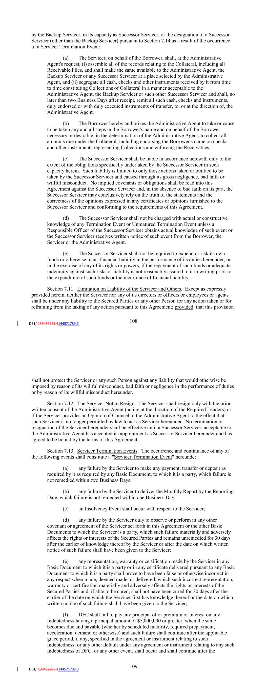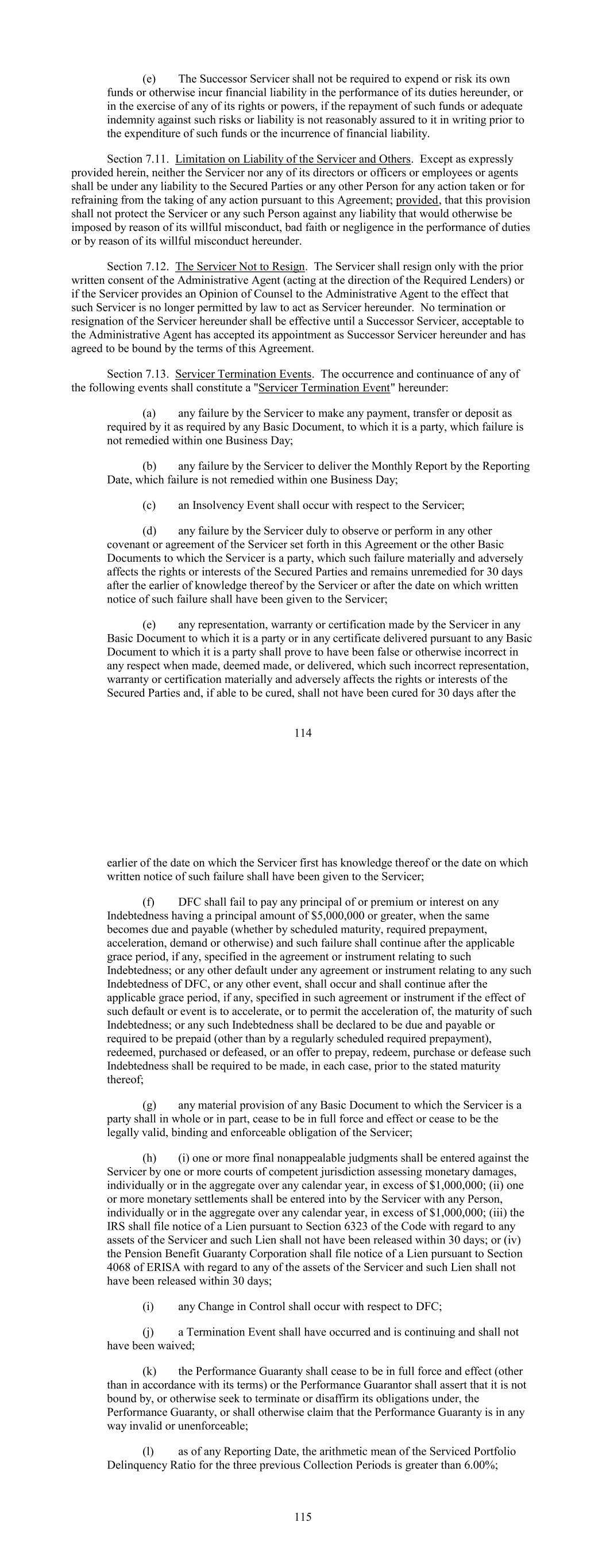 (e) The Successor Servicer shall not be required to expend or risk its own funds or otherwise incur financial liability in the performance of its duties hereunder, or in the exercise of any of its rights or powers, if the repayment of such funds or adequate indemnity against such risks or liability is not reasonably assured to it in writing prior to the expenditure of such funds or the incurrence of financial liability. Section 7.11. Limitation on Liability of the Servicer and Others. Except as expressly provided herein, neither the Servicer nor any of its directors or officers or employees or agents shall be under any liability to the Secured Parties or any other Person for any action taken or for refraining from the taking of any action pursuant to this Agreement; provided, that this provision shall not protect the Servicer or any such Person against any liability that would otherwise be imposed by reason of its willful misconduct, bad faith or negligence in the performance of duties or by reason of its willful misconduct hereunder. Section 7.12. The Servicer Not to Resign. The Servicer shall resign only with the prior written consent of the Administrative Agent (acting at the direction of the Required Lenders) or if the Servicer provides an Opinion of Counsel to the Administrative Agent to the effect that such Servicer is no longer permitted by law to act as Servicer hereunder. No termination or resignation of the Servicer hereunder shall be effective until a Successor Servicer, acceptable to the Administrative Agent has accepted its appointment as Successor Servicer hereunder and has agreed to be bound by the terms of this Agreement. Section 7.13. Servicer Termination Events. The occurrence and continuance of any of the following events shall constitute a "Servicer Termination Event" hereunder: (a) any failure by the Servicer to make any payment, transfer or deposit as required by it as required by any Basic Document, to which it is a party, which failure is not remedied within one Business Day; (b) any failure by the Servicer to deliver the Monthly Report by the Reporting Date, which failure is not remedied within one Business Day; (c) an Insolvency Event shall occur with respect to the Servicer; (d) any failure by the Servicer duly to observe or perform in any other covenant or agreement of the Servicer set forth in this Agreement or the other Basic Documents to which the Servicer is a party, which such failure materially and adversely affects the rights or interests of the Secured Parties and remains unremedied for 30 days after the earlier of knowledge thereof by the Servicer or after the date on which written notice of such failure shall have been given to the Servicer; (e) any representation, warranty or certification made by the Servicer in any Basic Document to which it is a party or in any certificate delivered pursuant to any Basic Document to which it is a party shall prove to have been false or otherwise incorrect in any respect when made, deemed made, or delivered, which such incorrect representation, warranty or certification materially and adversely affects the rights or interests of the Secured Parties and, if able to be cured, shall not have been cured for 30 days after the 114 earlier of the date on which the Servicer first has knowledge thereof or the date on which written notice of such failure shall have been given to the Servicer; (f) DFC shall fail to pay any principal of or premium or interest on any Indebtedness having a principal amount of $5,000,000 or greater, when the same becomes due and payable (whether by scheduled maturity, required prepayment, acceleration, demand or otherwise) and such failure shall continue after the applicable grace period, if any, specified in the agreement or instrument relating to such Indebtedness; or any other default under any agreement or instrument relating to any such Indebtedness of DFC, or any other event, shall occur and shall continue after the applicable grace period, if any, specified in such agreement or instrument if the effect of such default or event is to accelerate, or to permit the acceleration of, the maturity of such Indebtedness; or any such Indebtedness shall be declared to be due and payable or required to be prepaid (other than by a regularly scheduled required prepayment), redeemed, purchased or defeased, or an offer to prepay, redeem, purchase or defease such Indebtedness shall be required to be made, in each case, prior to the stated maturity thereof; (g) any material provision of any Basic Document to which the Servicer is a party shall in whole or in part, cease to be in full force and effect or cease to be the legally valid, binding and enforceable obligation of the Servicer; (h) (i) one or more final nonappealable judgments shall be entered against the Servicer by one or more courts of competent jurisdiction assessing monetary damages, individually or in the aggregate over any calendar year, in excess of $1,000,000; (ii) one or more monetary settlements shall be entered into by the Servicer with any Person, individually or in the aggregate over any calendar year, in excess of $1,000,000; (iii) the IRS shall file notice of a Lien pursuant to Section 6323 of the Code with regard to any assets of the Servicer and such Lien shall not have been released within 30 days; or (iv) the Pension Benefit Guaranty Corporation shall file notice of a Lien pursuant to Section 4068 of ERISA with regard to any of the assets of the Servicer and such Lien shall not have been released within 30 days; (i) any Change in Control shall occur with respect to DFC; (j) a Termination Event shall have occurred and is continuing and shall not have been waived; (k) the Performance Guaranty shall cease to be in full force and effect (other than in accordance with its terms) or the Performance Guarantor shall assert that it is not bound by, or otherwise seek to terminate or disaffirm its obligations under, the Performance Guaranty