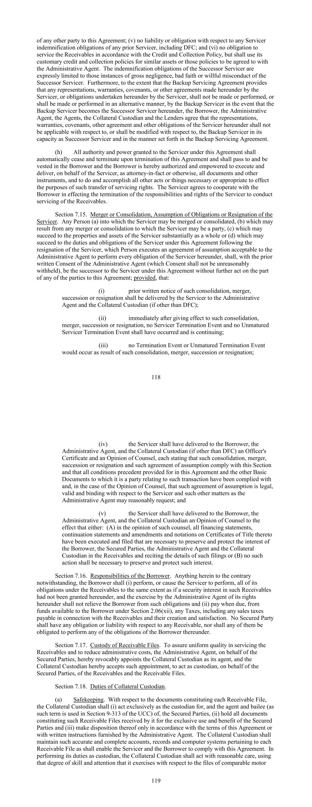 of any other party to this Agreement; (v) no liability or obligation with respect to any Servicer indemnification obligations of any prior Servicer, including DFC; and (vi) no obligation to service the Receivables in accordance with the Credit and Collection Policy, but shall use its customary credit and collection policies for similar assets or those policies to be agreed to with the Administrative Agent. The indemnification obligations of the Successor Servicer are expressly limited to those instances of gross negligence, bad faith or willful misconduct of the Successor Servicer. Furthermore, to the extent that the Backup Servicing Agreement provides that any representations, warranties, covenants, or other agreements made hereunder by the Servicer, or obligations undertaken hereunder by the Servicer, shall not be made or performed, or shall be made or performed in an alternative manner, by the Backup Servicer in the event that the Backup Servicer becomes the Successor Servicer hereunder, the Borrower, the Administrative Agent, the Agents, the Collateral Custodian and the Lenders agree that the representations, warranties, covenants, other agreement and other obligations of the Servicer hereunder shall not be applicable with respect to, or shall be modified with respect to, the Backup Servicer in its capacity as Successor Servicer and in the manner set forth in the Backup Servicing Agreement. (h) All authority and power granted to the Servicer under this Agreement shall automatically cease and terminate upon termination of this Agreement and shall pass to and be vested in the Borrower and the Borrower is hereby authorized and empowered to execute and deliver, on behalf of the Servicer, as attorney-in-fact or otherwise, all documents and other instruments, and to do and accomplish all other acts or things necessary or appropriate to effect the purposes of such transfer of servicing rights. The Servicer agrees to cooperate with the Borrower in effecting the termination of the responsibilities and rights of the Servicer to conduct servicing of the Receivables. Section 7.15. Merger or Consolidation, Assumption of Obligations or Resignation of the Servicer. Any Person (a) into which the Servicer may be merged or consolidated, (b) which may result from any merger or consolidation to which the Servicer may be a party, (c) which may succeed to the properties and assets of the Servicer substantially as a whole or (d) which may succeed to the duties and obligations of the Servicer under this Agreement following the resignation of the Servicer, which Person executes an agreement of assumption acceptable to the Administrative Agent to perform every obligation of the Servicer hereunder, shall, with the prior written Consent of the Administrative Agent (which Consent shall not be unreasonably withheld), be the successor to the Servicer under this Agreement without further act on the part of any of the parties to this Agreement; provided, that: (i) prior written notice of such consolidation, merger, succession or resignation shall be delivered by the Servicer to the Administrative Agent and the Collateral Custodian (if other than DFC); (ii) immediately after giving effect to such consolidation, merger, succession or resignation, no Servicer Termination Event and no Unmatured Servicer Termination Event shall have occurred and is continuing; (iii) no Termination Event or Unmatured Termination Event would occur as result of such consolidation, merger, succession or resignation; 118 (iv) the Servicer shall have delivered to the Borrower, the Administrative Agent, and the Collateral Custodian (if other than DFC) an Officer's Certificate and an Opinion of Counsel, each stating that such consolidation, merger, succession or resignation and such agreement of assumption comply with this Section and that all conditions precedent provided for in this Agreement and the other Basic Documents to which it is a party relating to such transaction have been complied with and, in the case of the Opinion of Counsel, that such agreement of assumption is legal, valid and binding with respect to the Servicer and such other matters as the Administrative Agent may reasonably request; and (v) the Servicer shall have delivered to the Borrower, the Administrative Agent, and the Collateral Custodian an Opinion of Counsel to the effect that either: (A) in the opinion of such counsel, all financing statements, continuation statements and amendments and notations on Certificates of Title thereto have been executed and filed that are necessary to preserve and protect the interest of the Borrower, the Secured Parties, the Administrative Agent and the Collateral Custodian in the Receivables and reciting the details of such filings or (B) no such action shall be necessary to preserve and protect such interest. Section 7.16. Responsibilities of the Borrower. Anything herein to the contrary notwithstanding, the Borrower shall (i) perform, or cause the Servicer to perform, all of its obligations under the Receivables to the same extent as if a security interest in such Receivables had not been granted hereunder, and the exercise by the Administrative Agent of its rights hereunder shall not relieve the Borrower from such obligations and (ii) pay when due, from funds available to the Borrower under Section 2.06(xii), any Taxes, including any sales taxes payable in connection with the Receivables and their creation and satisfaction. No Secured Party shall have any obligation or liability with respect to any Receivable, nor shall any of them be obligated to perform any of the obligations of the Borrower thereunder. Section 7.17. Custody of Receivable Files. To assure uniform quality in servicing the Receivables and to reduce administrative costs, the Administrative Agent, on behalf of the Secured Parties, hereby revocably appoints the Collateral Custodian as its agent, and the Collateral Custodian hereby accepts such appointment, to act as cu