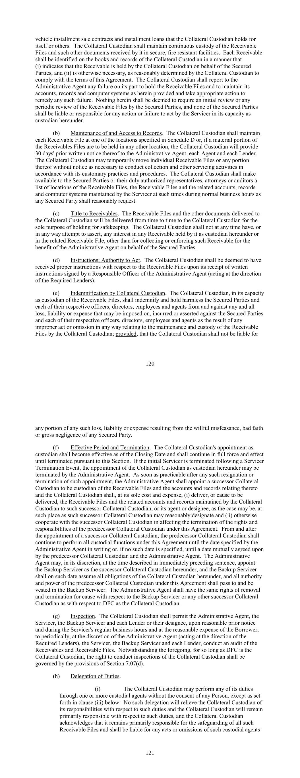 vehicle installment sale contracts and installment loans that the Collateral Custodian holds for itself or others. The Collateral Custodian shall maintain continuous custody of the Receivable Files and such other documents received by it in secure, fire resistant facilities. Each Receivable shall be identified on the books and records of the Collateral Custodian in a manner that (i) indicates that the Receivable is held by the Collateral Custodian on behalf of the Secured Parties, and (ii) is otherwise necessary, as reasonably determined by the Collateral Custodian to comply with the terms of this Agreement. The Collateral Custodian shall report to the Administrative Agent any failure on its part to hold the Receivable Files and to maintain its accounts, records and computer systems as herein provided and take appropriate action to remedy any such failure. Nothing herein shall be deemed to require an initial review or any periodic review of the Receivable Files by the Secured Parties, and none of the Secured Parties shall be liable or responsible for any action or failure to act by the Servicer in its capacity as custodian hereunder. (b) Maintenance of and Access to Records. The Collateral Custodian shall maintain each Receivable File at one of the locations specified in Schedule D or, if a material portion of the Receivables Files are to be held in any other location, the Collateral Custodian will provide 30 days' prior written notice thereof to the Administrative Agent, each Agent and each Lender. The Collateral Custodian may temporarily move individual Receivable Files or any portion thereof without notice as necessary to conduct collection and other servicing activities in accordance with its customary practices and procedures. The Collateral Custodian shall make available to the Secured Parties or their duly authorized representatives, attorneys or auditors a list of locations of the Receivable Files, the Receivable Files and the related accounts, records and computer systems maintained by the Servicer at such times during normal business hours as any Secured Party shall reasonably request. (c) Title to Receivables. The Receivable Files and the other documents delivered to the Collateral Custodian will be delivered from time to time to the Collateral Custodian for the sole purpose of holding for safekeeping. The Collateral Custodian shall not at any time have, or in any way attempt to assert, any interest in any Receivable held by it as custodian hereunder or in the related Receivable File, other than for collecting or enforcing such Receivable for the benefit of the Administrative Agent on behalf of the Secured Parties. (d) Instructions; Authority to Act. The Collateral Custodian shall be deemed to have received proper instructions with respect to the Receivable Files upon its receipt of written instructions signed by a Responsible Officer of the Administrative Agent (acting at the direction of the Required Lenders). (e) Indemnification by Collateral Custodian. The Collateral Custodian, in its capacity as custodian of the Receivable Files, shall indemnify and hold harmless the Secured Parties and each of their respective officers, directors, employees and agents from and against any and all loss, liability or expense that may be imposed on, incurred or asserted against the Secured Parties and each of their respective officers, directors, employees and agents as the result of any improper act or omission in any way relating to the maintenance and custody of the Receivable Files by the Collateral Custodian; provided, that the Collateral Custodian shall not be liable for 120 any portion of any such loss, liability or expense resulting from the willful misfeasance, bad faith or gross negligence of any Secured Party. (f) Effective Period and Termination. The Collateral Custodian's appointment as custodian shall become effective as of the Closing Date and shall continue in full force and effect until terminated pursuant to this Section. If the initial Servicer is terminated following a Servicer Termination Event, the appointment of the Collateral Custodian as custodian hereunder may be terminated by the Administrative Agent. As soon as practicable after any such resignation or termination of such appointment, the Administrative Agent shall appoint a successor Collateral Custodian to be custodian of the Receivable Files and the accounts and records relating thereto and the Collateral Custodian shall, at its sole cost and expense, (i) deliver, or cause to be delivered, the Receivable Files and the related accounts and records maintained by the Collateral Custodian to such successor Collateral Custodian, or its agent or designee, as the case may be, at such place as such successor Collateral Custodian may reasonably designate and (ii) otherwise cooperate with the successor Collateral Custodian in affecting the termination of the rights and responsibilities of the predecessor Collateral Custodian under this Agreement. From and after the appointment of a successor Collateral Custodian, the predecessor Collateral Custodian shall continue to perform all custodial functions under this Agreement until the date specified by the Administrative Agent in writing or, if no such date is specified, until a date mutually agreed upon by the predecessor Collateral Custodian and the Administrative Agent. The Administrative Agent may, in its discretion, at the time described in immediately preceding sentence, appoint the Backup Servicer as the successor Collateral Custodian hereunder, and the Backup Servicer shall on such date assume all obligations of the Collateral Custodian hereunder, and all authority and power of the predecessor Collateral Custodian under this Agreement shall pass to and be vested in the Backup Servicer. The Administrative Agent shall have the same rights of removal and termination for cause with respect to the Backup Servicer or any other successor Collateral Custodian as with respect 