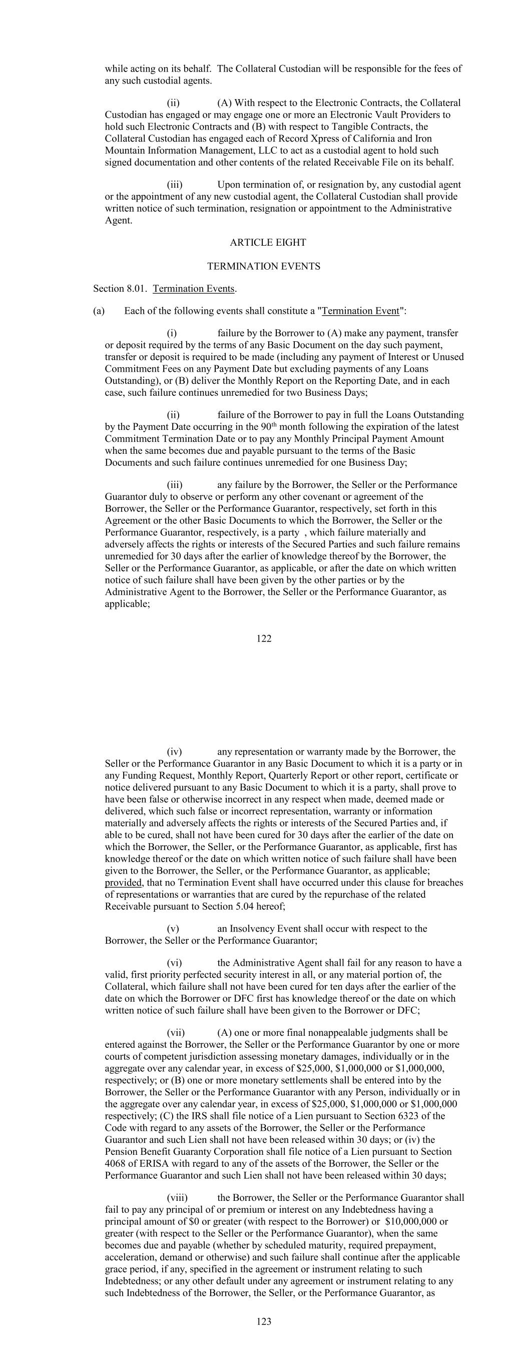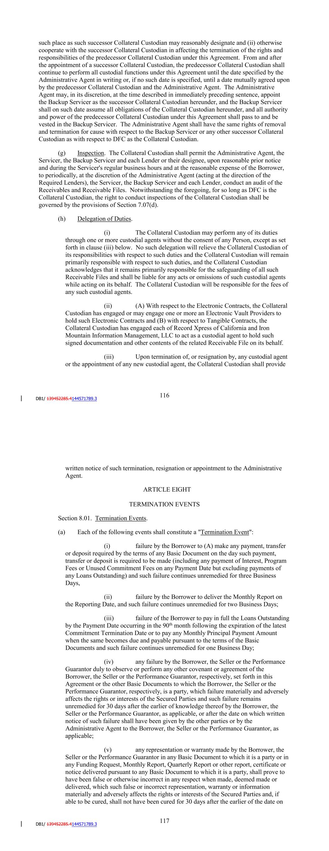 while acting on its behalf. The Collateral Custodian will be responsible for the fees of any such custodial agents. (ii) (A) With respect to the Electronic Contracts, the Collateral Custodian has engaged or may engage one or more an Electronic Vault Providers to hold such Electronic Contracts and (B) with respect to Tangible Contracts, the Collateral Custodian has engaged each of Record Xpress of California and Iron Mountain Information Management, LLC to act as a custodial agent to hold such signed documentation and other contents of the related Receivable File on its behalf. (iii) Upon termination of, or resignation by, any custodial agent or the appointment of any new custodial agent, the Collateral Custodian shall provide written notice of such termination, resignation or appointment to the Administrative Agent. ARTICLE EIGHT TERMINATION EVENTS Section 8.01. Termination Events. (a) Each of the following events shall constitute a "Termination Event": (i) failure by the Borrower to (A) make any payment, transfer or deposit required by the terms of any Basic Document on the day such payment, transfer or deposit is required to be made (including any payment of Interest or Unused Commitment Fees on any Payment Date but excluding payments of any Loans Outstanding), or (B) deliver the Monthly Report on the Reporting Date, and in each case, such failure continues unremedied for two Business Days; (ii) failure of the Borrower to pay in full the Loans Outstanding by the Payment Date occurring in the 90th month following the expiration of the latest Commitment Termination Date or to pay any Monthly Principal Payment Amount when the same becomes due and payable pursuant to the terms of the Basic Documents and such failure continues unremedied for one Business Day; (iii) any failure by the Borrower, the Seller or the Performance Guarantor duly to observe or perform any other covenant or agreement of the Borrower, the Seller or the Performance Guarantor, respectively, set forth in this Agreement or the other Basic Documents to which the Borrower, the Seller or the Performance Guarantor, respectively, is a party , which failure materially and adversely affects the rights or interests of the Secured Parties and such failure remains unremedied for 30 days after the earlier of knowledge thereof by the Borrower, the Seller or the Performance Guarantor, as applicable, or after the date on which written notice of such failure shall have been given by the other parties or by the Administrative Agent to the Borrower, the Seller or the Performance Guarantor, as applicable; 122 (iv) any representation or warranty made by the Borrower, the Seller or the Performance Guarantor in any Basic Document to which it is a party or in any Funding Request, Monthly Report, Quarterly Report or other report, certificate or notice delivered pursuant to any Basic Document to which it is a party, shall prove to have been false or otherwise incorrect in any respect when made, deemed made or delivered, which such false or incorrect representation, warranty or information materially and adversely affects the rights or interests of the Secured Parties and, if able to be cured, shall not have been cured for 30 days after the earlier of the date on which the Borrower, the Seller, or the Performance Guarantor, as applicable, first has knowledge thereof or the date on which written notice of such failure shall have been given to the Borrower, the Seller, or the Performance Guarantor, as applicable; provided, that no Termination Event shall have occurred under this clause for breaches of representations or warranties that are cured by the repurchase of the related Receivable pursuant to Section 5.04 hereof; (v) an Insolvency Event shall occur with respect to the Borrower, the Seller or the Performance Guarantor; (vi) the Administrative Agent shall fail for any reason to have a valid, first priority perfected security interest in all, or any material portion of, the Collateral, which failure shall not have been cured for ten days after the earlier of the date on which the Borrower or DFC first has knowledge thereof or the date on which written notice of such failure shall have been given to the Borrower or DFC; (vii) (A) one or more final nonappealable judgments shall be entered against the Borrower, the Seller or the Performance Guarantor by one or more courts of competent jurisdiction assessing monetary damages, individually or in the aggregate over any calendar year, in excess of $25,000, $1,000,000 or $1,000,000, respectively; or (B) one or more monetary settlements shall be entered into by the Borrower, the Seller or the Performance Guarantor with any Person, individually or in the aggregate over any calendar year, in excess of $25,000, $1,000,000 or $1,000,000 respectively; (C) the IRS shall file notice of a Lien pursuant to Section 6323 of the Code with regard to any assets of the Borrower, the Seller or the Performance Guarantor and such Lien shall not have been released within 30 days; or (iv) the Pension Benefit Guaranty Corporation shall file notice of a Lien pursuant to Section 4068 of ERISA with regard to any of the assets of the Borrower, the Seller or the Performance Guarantor and such Lien shall not have been released within 30 days; (viii) the Borrower, the Seller or the Performance Guarantor shall fail to pay any principal of or premium or interest on any Indebtedness having a principal amount of $0 or greater (with respect to the Borrower) or $10,000,000 or greater (with respect to the Seller or the Performance Guarantor), when the same becomes due and payable (whether by scheduled maturity, required prepayment, acceleration, demand or otherwise) and such failure shall continue after the applicable grace period, if any, specified in the agreement or instrument relating to such Indebtedness; or any other default under any agreement or instrument relating to any such Indebtedness of the Borrower, the Seller, or the Per
