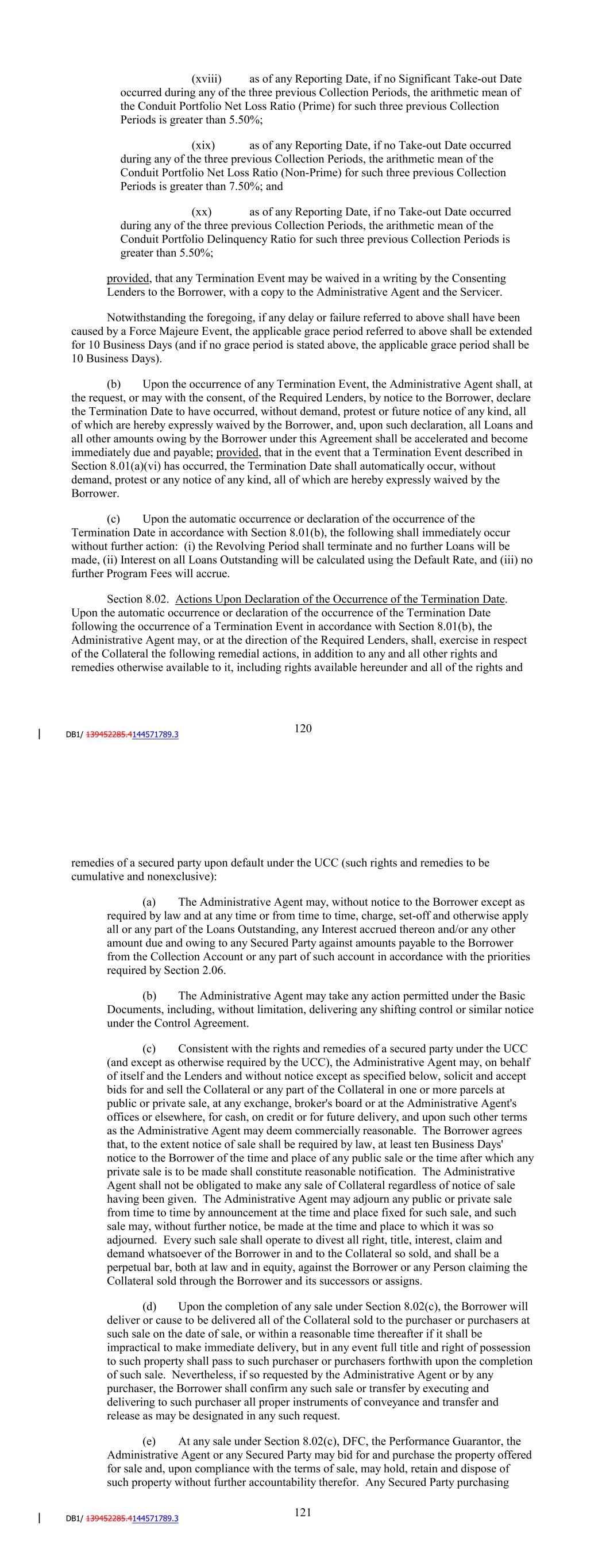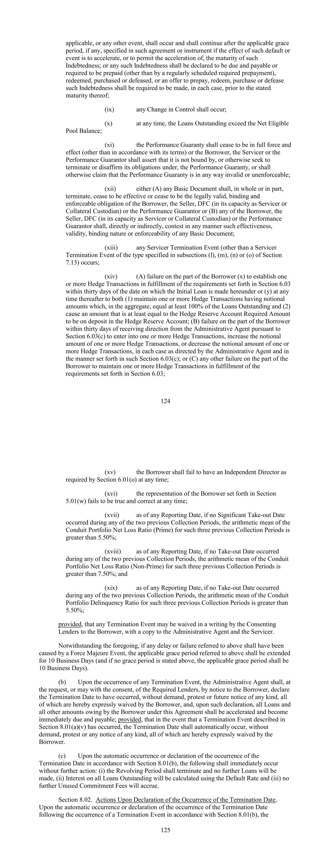 applicable, or any other event, shall occur and shall continue after the applicable grace period, if any, specified in such agreement or instrument if the effect of such default or event is to accelerate, or to permit the acceleration of, the maturity of such Indebtedness; or any such Indebtedness shall be declared to be due and payable or required to be prepaid (other than by a regularly scheduled required prepayment), redeemed, purchased or defeased, or an offer to prepay, redeem, purchase or defease such Indebtedness shall be required to be made, in each case, prior to the stated maturity thereof; (ix) any Change in Control shall occur; (x) at any time, the Loans Outstanding exceed the Net Eligible Pool Balance; (xi) the Performance Guaranty shall cease to be in full force and effect (other than in accordance with its terms) or the Borrower, the Servicer or the Performance Guarantor shall assert that it is not bound by, or otherwise seek to terminate or disaffirm its obligations under, the Performance Guaranty, or shall otherwise claim that the Performance Guaranty is in any way invalid or unenforceable; (xii) either (A) any Basic Document shall, in whole or in part, terminate, cease to be effective or cease to be the legally valid, binding and enforceable obligation of the Borrower, the Seller, DFC (in its capacity as Servicer or Collateral Custodian) or the Performance Guarantor or (B) any of the Borrower, the Seller, DFC (in its capacity as Servicer or Collateral Custodian) or the Performance Guarantor shall, directly or indirectly, contest in any manner such effectiveness, validity, binding nature or enforceability of any Basic Document; (xiii) any Servicer Termination Event (other than a Servicer Termination Event of the type specified in subsections (l), (m), (n) or (o) of Section 7.13) occurs; (xiv) (A) failure on the part of the Borrower (x) to establish one or more Hedge Transactions in fulfillment of the requirements set forth in Section 6.03 within thirty days of the date on which the Initial Loan is made hereunder or (y) at any time thereafter to both (1) maintain one or more Hedge Transactions having notional amounts which, in the aggregate, equal at least 100% of the Loans Outstanding and (2) cause an amount that is at least equal to the Hedge Reserve Account Required Amount to be on deposit in the Hedge Reserve Account; (B) failure on the part of the Borrower within thirty days of receiving direction from the Administrative Agent pursuant to Section 6.03(c) to enter into one or more Hedge Transactions, increase the notional amount of one or more Hedge Transactions, or decrease the notional amount of one or more Hedge Transactions, in each case as directed by the Administrative Agent and in the manner set forth in such Section 6.03(c); or (C) any other failure on the part of the Borrower to maintain one or more Hedge Transactions in fulfillment of the requirements set forth in Section 6.03; 124 (xv) the Borrower shall fail to have an Independent Director as required by Section 6.01(o) at any time; (xvi) the representation of the Borrower set forth in Section 5.01(w) fails to be true and correct at any time; (xvii) as of any Reporting Date, if no Significant Take-out Date occurred during any of the two previous Collection Periods, the arithmetic mean of the Conduit Portfolio Net Loss Ratio (Prime) for such three previous Collection Periods is greater than 5.50%; (xviii) as of any Reporting Date, if no Take-out Date occurred during any of the two previous Collection Periods, the arithmetic mean of the Conduit Portfolio Net Loss Ratio (Non-Prime) for such three previous Collection Periods is greater than 7.50%; and (xix) as of any Reporting Date, if no Take-out Date occurred during any of the two previous Collection Periods, the arithmetic mean of the Conduit Portfolio Delinquency Ratio for such three previous Collection Periods is greater than 5.50%; provided, that any Termination Event may be waived in a writing by the Consenting Lenders to the Borrower, with a copy to the Administrative Agent and the Servicer. Notwithstanding the foregoing, if any delay or failure referred to above shall have been caused by a Force Majeure Event, the applicable grace period referred to above shall be extended for 10 Business Days (and if no grace period is stated above, the applicable grace period shall be 10 Business Days). (b) Upon the occurrence of any Termination Event, the Administrative Agent shall, at the request, or may with the consent, of the Required Lenders, by notice to the Borrower, declare the Termination Date to have occurred, without demand, protest or future notice of any kind, all of which are hereby expressly waived by the Borrower, and, upon such declaration, all Loans and all other amounts owing by the Borrower under this Agreement shall be accelerated and become immediately due and payable; provided, that in the event that a Termination Event described in Section 8.01(a)(v) has occurred, the Termination Date shall automatically occur, without demand, protest or any notice of any kind, all of which are hereby expressly waived by the Borrower. (c) Upon the automatic occurrence or declaration of the occurrence of the Termination Date in accordance with Section 8.01(b), the following shall immediately occur without further action: (i) the Revolving Period shall terminate and no further Loans will be made, (ii) Interest on all Loans Outstanding will be calculated using the Default Rate and (iii) no further Unused Commitment Fees will accrue. Section 8.02. Actions Upon Declaration of the Occurrence of the Termination Date. Upon the automatic occurrence or declaration of the occurrence of the Termination Date following the occurrence of a Termination Event in accordance with Section 8.01(b), the 125
