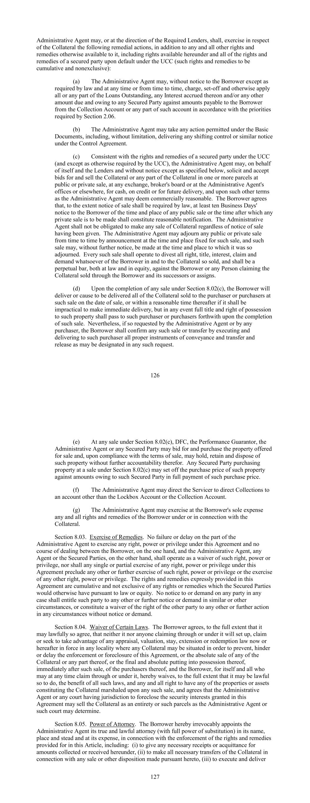 Administrative Agent may, or at the direction of the Required Lenders, shall, exercise in respect of the Collateral the following remedial actions, in addition to any and all other rights and remedies otherwise available to it, including rights available hereunder and all of the rights and remedies of a secured party upon default under the UCC (such rights and remedies to be cumulative and nonexclusive): (a) The Administrative Agent may, without notice to the Borrower except as required by law and at any time or from time to time, charge, set-off and otherwise apply all or any part of the Loans Outstanding, any Interest accrued thereon and/or any other amount due and owing to any Secured Party against amounts payable to the Borrower from the Collection Account or any part of such account in accordance with the priorities required by Section 2.06. (b) The Administrative Agent may take any action permitted under the Basic Documents, including, without limitation, delivering any shifting control or similar notice under the Control Agreement. (c) Consistent with the rights and remedies of a secured party under the UCC (and except as otherwise required by the UCC), the Administrative Agent may, on behalf of itself and the Lenders and without notice except as specified below, solicit and accept bids for and sell the Collateral or any part of the Collateral in one or more parcels at public or private sale, at any exchange, broker's board or at the Administrative Agent's offices or elsewhere, for cash, on credit or for future delivery, and upon such other terms as the Administrative Agent may deem commercially reasonable. The Borrower agrees that, to the extent notice of sale shall be required by law, at least ten Business Days' notice to the Borrower of the time and place of any public sale or the time after which any private sale is to be made shall constitute reasonable notification. The Administrative Agent shall not be obligated to make any sale of Collateral regardless of notice of sale having been given. The Administrative Agent may adjourn any public or private sale from time to time by announcement at the time and place fixed for such sale, and such sale may, without further notice, be made at the time and place to which it was so adjourned. Every such sale shall operate to divest all right, title, interest, claim and demand whatsoever of the Borrower in and to the Collateral so sold, and shall be a perpetual bar, both at law and in equity, against the Borrower or any Person claiming the Collateral sold through the Borrower and its successors or assigns. (d) Upon the completion of any sale under Section 8.02(c), the Borrower will deliver or cause to be delivered all of the Collateral sold to the purchaser or purchasers at such sale on the date of sale, or within a reasonable time thereafter if it shall be impractical to make immediate delivery, but in any event full title and right of possession to such property shall pass to such purchaser or purchasers forthwith upon the completion of such sale. Nevertheless, if so requested by the Administrative Agent or by any purchaser, the Borrower shall confirm any such sale or transfer by executing and delivering to such purchaser all proper instruments of conveyance and transfer and release as may be designated in any such request. 126 (e) At any sale under Section 8.02(c), DFC, the Performance Guarantor, the Administrative Agent or any Secured Party may bid for and purchase the property offered for sale and, upon compliance with the terms of sale, may hold, retain and dispose of such property without further accountability therefor. Any Secured Party purchasing property at a sale under Section 8.02(c) may set off the purchase price of such property against amounts owing to such Secured Party in full payment of such purchase price. (f) The Administrative Agent may direct the Servicer to direct Collections to an account other than the Lockbox Account or the Collection Account. (g) The Administrative Agent may exercise at the Borrower's sole expense any and all rights and remedies of the Borrower under or in connection with the Collateral. Section 8.03. Exercise of Remedies. No failure or delay on the part of the Administrative Agent to exercise any right, power or privilege under this Agreement and no course of dealing between the Borrower, on the one hand, and the Administrative Agent, any Agent or the Secured Parties, on the other hand, shall operate as a waiver of such right, power or privilege, nor shall any single or partial exercise of any right, power or privilege under this Agreement preclude any other or further exercise of such right, power or privilege or the exercise of any other right, power or privilege. The rights and remedies expressly provided in this Agreement are cumulative and not exclusive of any rights or remedies which the Secured Parties would otherwise have pursuant to law or equity. No notice to or demand on any party in any case shall entitle such party to any other or further notice or demand in similar or other circumstances, or constitute a waiver of the right of the other party to any other or further action in any circumstances without notice or demand. Section 8.04. Waiver of Certain Laws. The Borrower agrees, to the full extent that it may lawfully so agree, that neither it nor anyone claiming through or under it will set up, claim or seek to take advantage of any appraisal, valuation, stay, extension or redemption law now or hereafter in force in any locality where any Collateral may be situated in order to prevent, hinder or delay the enforcement or foreclosure of this Agreement, or the absolute sale of any of the Collateral or any part thereof, or the final and absolute putting into possession thereof, immediately after such sale, of the purchasers thereof, and the Borrower, for itself and all who may at any time claim through or under it, hereby waives, to the full extent that it may be lawful so to do, the 