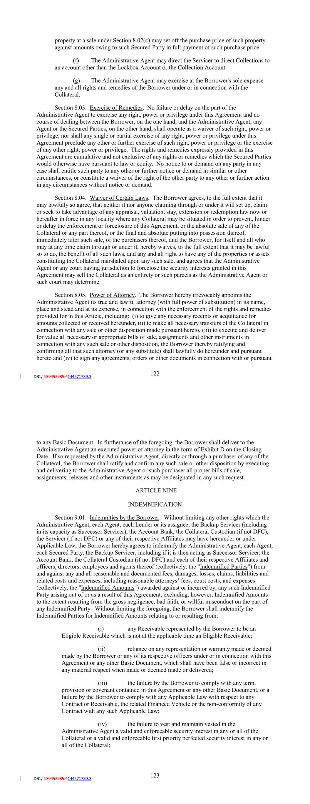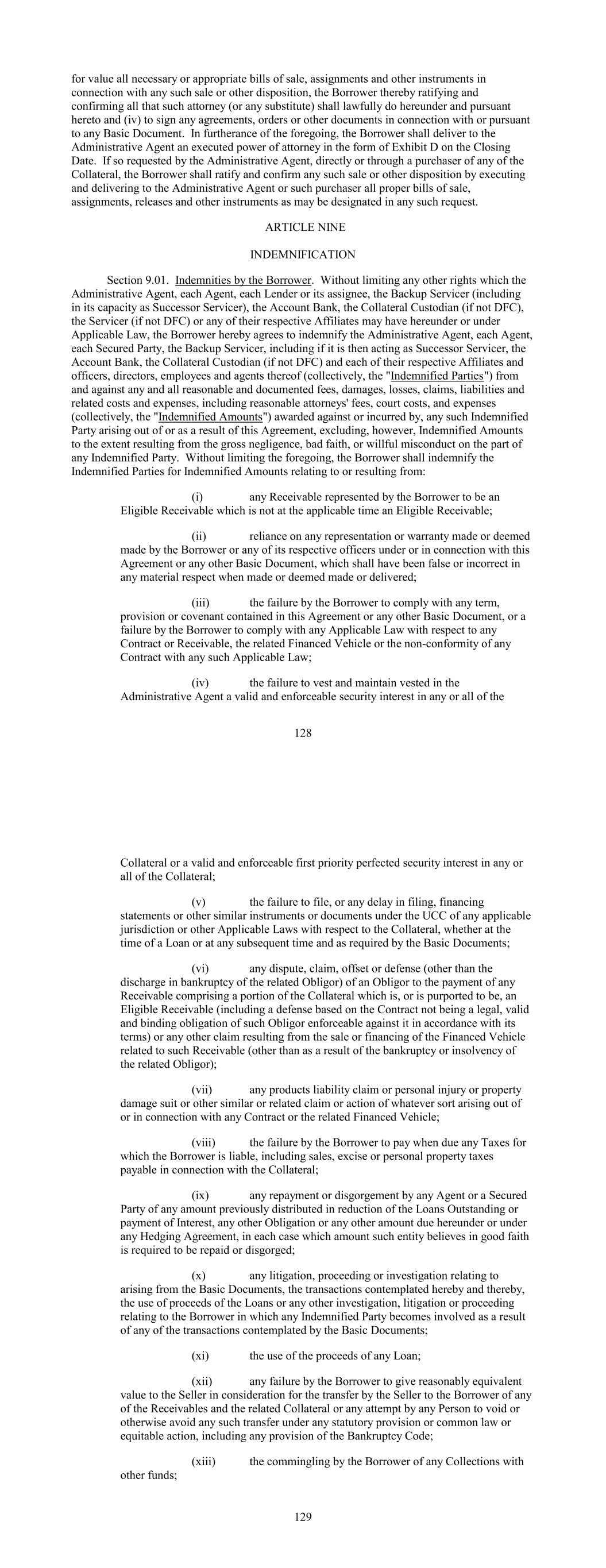 for value all necessary or appropriate bills of sale, assignments and other instruments in connection with any such sale or other disposition, the Borrower thereby ratifying and confirming all that such attorney (or any substitute) shall lawfully do hereunder and pursuant hereto and (iv) to sign any agreements, orders or other documents in connection with or pursuant to any Basic Document. In furtherance of the foregoing, the Borrower shall deliver to the Administrative Agent an executed power of attorney in the form of Exhibit D on the Closing Date. If so requested by the Administrative Agent, directly or through a purchaser of any of the Collateral, the Borrower shall ratify and confirm any such sale or other disposition by executing and delivering to the Administrative Agent or such purchaser all proper bills of sale, assignments, releases and other instruments as may be designated in any such request. ARTICLE NINE INDEMNIFICATION Section 9.01. Indemnities by the Borrower. Without limiting any other rights which the Administrative Agent, each Agent, each Lender or its assignee, the Backup Servicer (including in its capacity as Successor Servicer), the Account Bank, the Collateral Custodian (if not DFC), the Servicer (if not DFC) or any of their respective Affiliates may have hereunder or under Applicable Law, the Borrower hereby agrees to indemnify the Administrative Agent, each Agent, each Secured Party, the Backup Servicer, including if it is then acting as Successor Servicer, the Account Bank, the Collateral Custodian (if not DFC) and each of their respective Affiliates and officers, directors, employees and agents thereof (collectively, the "Indemnified Parties") from and against any and all reasonable and documented fees, damages, losses, claims, liabilities and related costs and expenses, including reasonable attorneys' fees, court costs, and expenses (collectively, the "Indemnified Amounts") awarded against or incurred by, any such Indemnified Party arising out of or as a result of this Agreement, excluding, however, Indemnified Amounts to the extent resulting from the gross negligence, bad faith, or willful misconduct on the part of any Indemnified Party. Without limiting the foregoing, the Borrower shall indemnify the Indemnified Parties for Indemnified Amounts relating to or resulting from: (i) any Receivable represented by the Borrower to be an Eligible Receivable which is not at the applicable time an Eligible Receivable; (ii) reliance on any representation or warranty made or deemed made by the Borrower or any of its respective officers under or in connection with this Agreement or any other Basic Document, which shall have been false or incorrect in any material respect when made or deemed made or delivered; (iii) the failure by the Borrower to comply with any term, provision or covenant contained in this Agreement or any other Basic Document, or a failure by the Borrower to comply with any Applicable Law with respect to any Contract or Receivable, the related Financed Vehicle or the non-conformity of any Contract with any such Applicable Law; (iv) the failure to vest and maintain vested in the Administrative Agent a valid and enforceable security interest in any or all of the 128 Collateral or a valid and enforceable first priority perfected security interest in any or all of the Collateral; (v) the failure to file, or any delay in filing, financing statements or other similar instruments or documents under the UCC of any applicable jurisdiction or other Applicable Laws with respect to the Collateral, whether at the time of a Loan or at any subsequent time and as required by the Basic Documents; (vi) any dispute, claim, offset or defense (other than the discharge in bankruptcy of the related Obligor) of an Obligor to the payment of any Receivable comprising a portion of the Collateral which is, or is purported to be, an Eligible Receivable (including a defense based on the Contract not being a legal, valid and binding obligation of such Obligor enforceable against it in accordance with its terms) or any other claim resulting from the sale or financing of the Financed Vehicle related to such Receivable (other than as a result of the bankruptcy or insolvency of the related Obligor); (vii) any products liability claim or personal injury or property damage suit or other similar or related claim or action of whatever sort arising out of or in connection with any Contract or the related Financed Vehicle; (viii) the failure by the Borrower to pay when due any Taxes for which the Borrower is liable, including sales, excise or personal property taxes payable in connection with the Collateral; (ix) any repayment or disgorgement by any Agent or a Secured Party of any amount previously distributed in reduction of the Loans Outstanding or payment of Interest, any other Obligation or any other amount due hereunder or under any Hedging Agreement, in each case which amount such entity believes in good faith is required to be repaid or disgorged; (x) any litigation, proceeding or investigation relating to arising from the Basic Documents, the transactions contemplated hereby and thereby, the use of proceeds of the Loans or any other investigation, litigation or proceeding relating to the Borrower in which any Indemnified Party becomes involved as a result of any of the transactions contemplated by the Basic Documents; (xi) the use of the proceeds of any Loan; (xii) any failure by the Borrower to give reasonably equivalent value to the Seller in consideration for the transfer by the Seller to the Borrower of any of the Receivables and the related Collateral or any attempt by any Person to void or otherwise avoid any such transfer under any statutory provision or common law or equitable action, including any provision of the Bankruptcy Code; (xiii) the commingling by the Borrower of any Collections with other funds; 129