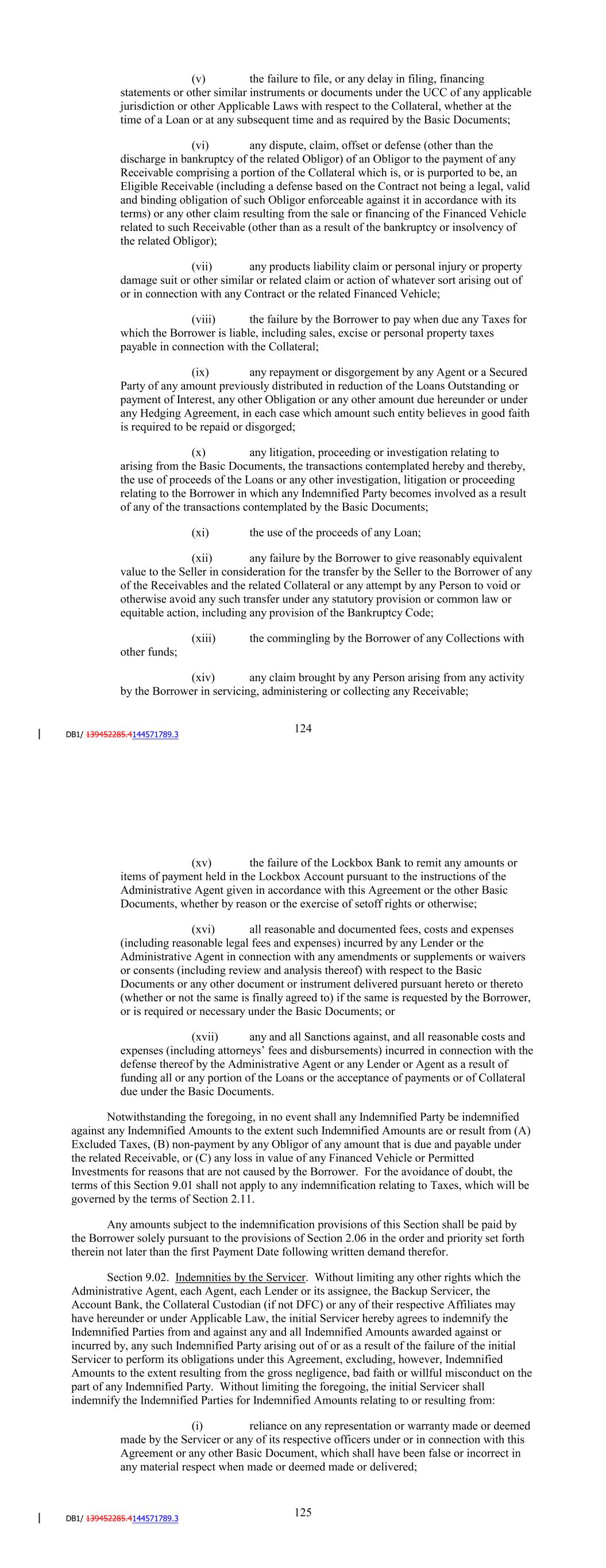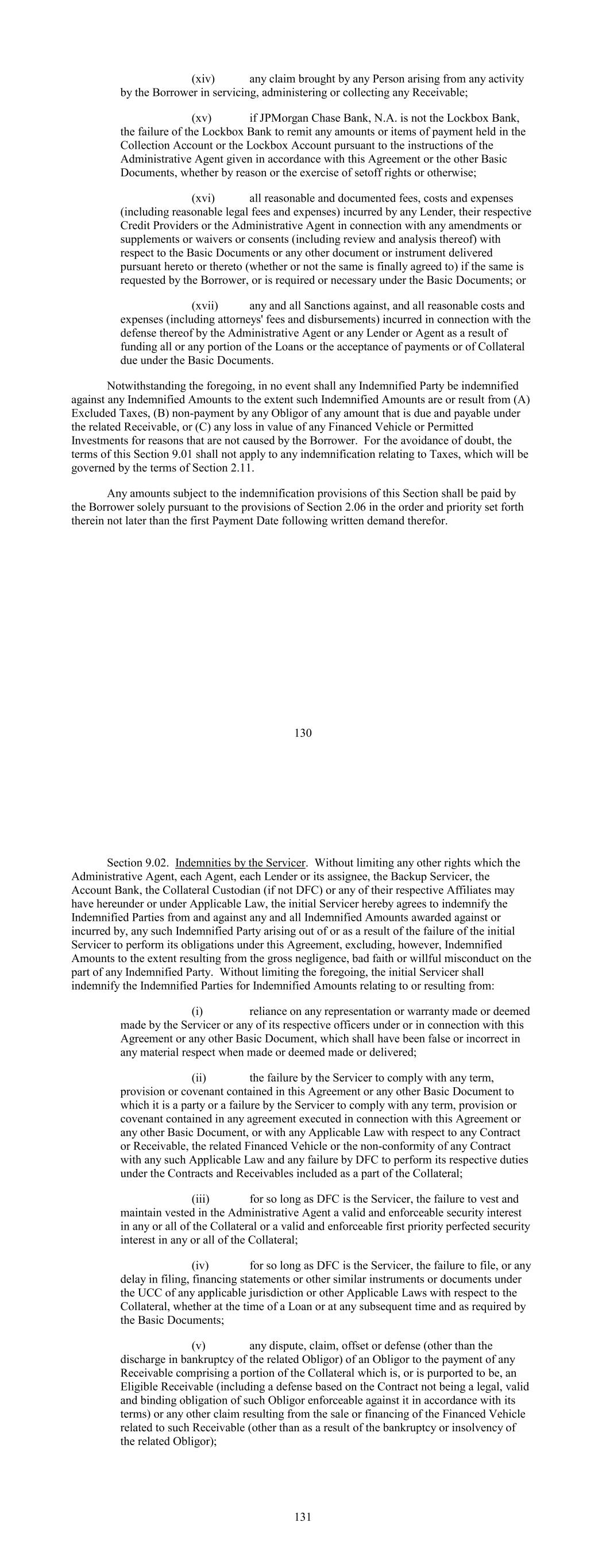 (xiv) any claim brought by any Person arising from any activity by the Borrower in servicing, administering or collecting any Receivable; (xv) if JPMorgan Chase Bank, N.A. is not the Lockbox Bank, the failure of the Lockbox Bank to remit any amounts or items of payment held in the Collection Account or the Lockbox Account pursuant to the instructions of the Administrative Agent given in accordance with this Agreement or the other Basic Documents, whether by reason or the exercise of setoff rights or otherwise; (xvi) all reasonable and documented fees, costs and expenses (including reasonable legal fees and expenses) incurred by any Lender, their respective Credit Providers or the Administrative Agent in connection with any amendments or supplements or waivers or consents (including review and analysis thereof) with respect to the Basic Documents or any other document or instrument delivered pursuant hereto or thereto (whether or not the same is finally agreed to) if the same is requested by the Borrower, or is required or necessary under the Basic Documents; or (xvii) any and all Sanctions against, and all reasonable costs and expenses (including attorneys' fees and disbursements) incurred in connection with the defense thereof by the Administrative Agent or any Lender or Agent as a result of funding all or any portion of the Loans or the acceptance of payments or of Collateral due under the Basic Documents. Notwithstanding the foregoing, in no event shall any Indemnified Party be indemnified against any Indemnified Amounts to the extent such Indemnified Amounts are or result from (A) Excluded Taxes, (B) non-payment by any Obligor of any amount that is due and payable under the related Receivable, or (C) any loss in value of any Financed Vehicle or Permitted Investments for reasons that are not caused by the Borrower. For the avoidance of doubt, the terms of this Section 9.01 shall not apply to any indemnification relating to Taxes, which will be governed by the terms of Section 2.11. Any amounts subject to the indemnification provisions of this Section shall be paid by the Borrower solely pursuant to the provisions of Section 2.06 in the order and priority set forth therein not later than the first Payment Date following written demand therefor. 130 Section 9.02. Indemnities by the Servicer. Without limiting any other rights which the Administrative Agent, each Agent, each Lender or its assignee, the Backup Servicer, the Account Bank, the Collateral Custodian (if not DFC) or any of their respective Affiliates may have hereunder or under Applicable Law, the initial Servicer hereby agrees to indemnify the Indemnified Parties from and against any and all Indemnified Amounts awarded against or incurred by, any such Indemnified Party arising out of or as a result of the failure of the initial Servicer to perform its obligations under this Agreement, excluding, however, Indemnified Amounts to the extent resulting from the gross negligence, bad faith or willful misconduct on the part of any Indemnified Party. Without limiting the foregoing, the initial Servicer shall indemnify the Indemnified Parties for Indemnified Amounts relating to or resulting from: (i) reliance on any representation or warranty made or deemed made by the Servicer or any of its respective officers under or in connection with this Agreement or any other Basic Document, which shall have been false or incorrect in any material respect when made or deemed made or delivered; (ii) the failure by the Servicer to comply with any term, provision or covenant contained in this Agreement or any other Basic Document to which it is a party or a failure by the Servicer to comply with any term, provision or covenant contained in any agreement executed in connection with this Agreement or any other Basic Document, or with any Applicable Law with respect to any Contract or Receivable, the related Financed Vehicle or the non-conformity of any Contract with any such Applicable Law and any failure by DFC to perform its respective duties under the Contracts and Receivables included as a part of the Collateral; (iii) for so long as DFC is the Servicer, the failure to vest and maintain vested in the Administrative Agent a valid and enforceable security interest in any or all of the Collateral or a valid and enforceable first priority perfected security interest in any or all of the Collateral; (iv) for so long as DFC is the Servicer, the failure to file, or any delay in filing, financing statements or other similar instruments or documents under the UCC of any applicable jurisdiction or other Applicable Laws with respect to the Collateral, whether at the time of a Loan or at any subsequent time and as required by the Basic Documents; (v) any dispute, claim, offset or defense (other than the discharge in bankruptcy of the related Obligor) of an Obligor to the payment of any Receivable comprising a portion of the Collateral which is, or is purported to be, an Eligible Receivable (including a defense based on the Contract not being a legal, valid and binding obligation of such Obligor enforceable against it in accordance with its terms) or any other claim resulting from the sale or financing of the Financed Vehicle related to such Receivable (other than as a result of the bankruptcy or insolvency of the related Obligor); 131