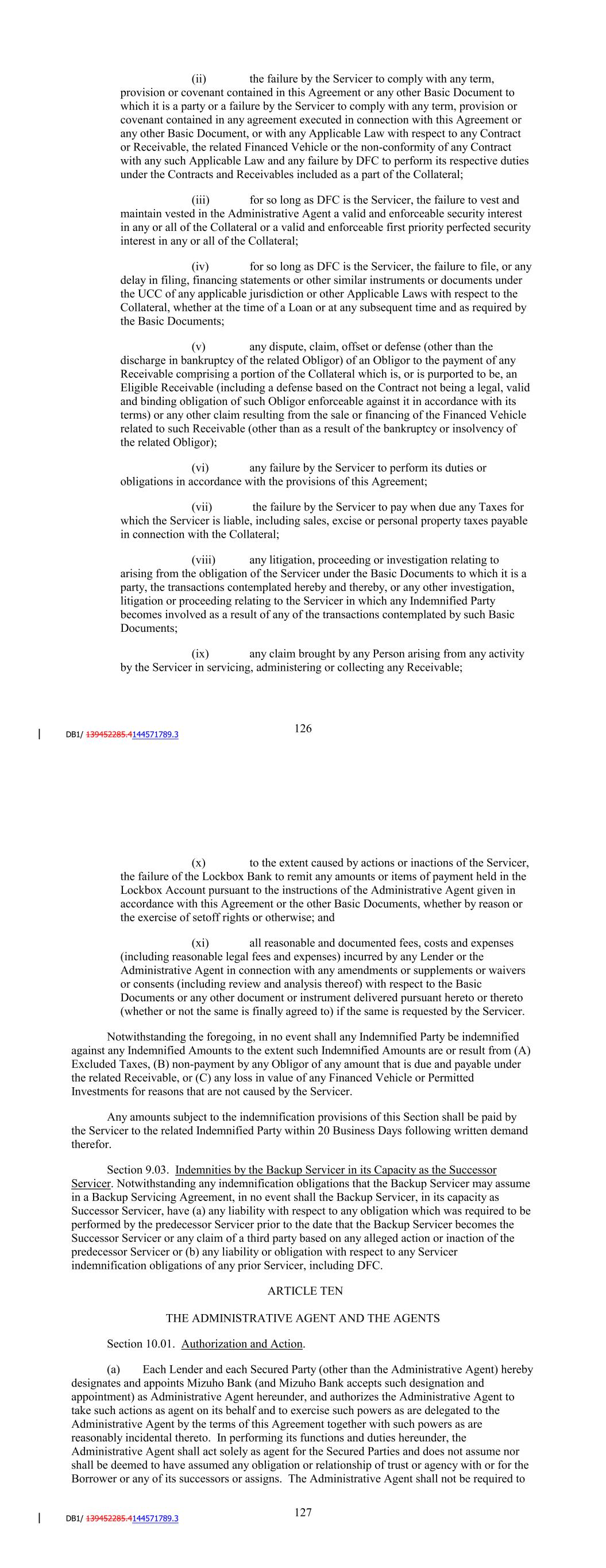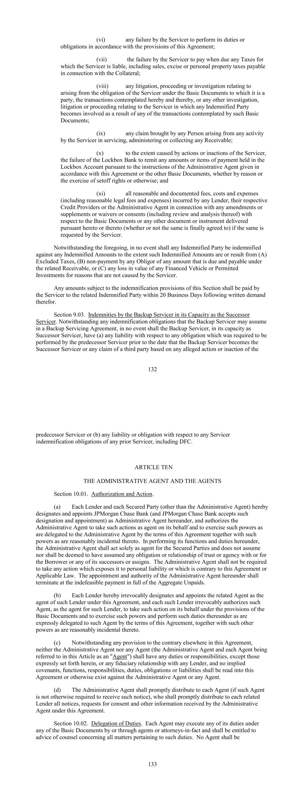 (vi) any failure by the Servicer to perform its duties or obligations in accordance with the provisions of this Agreement; (vii) the failure by the Servicer to pay when due any Taxes for which the Servicer is liable, including sales, excise or personal property taxes payable in connection with the Collateral; (viii) any litigation, proceeding or investigation relating to arising from the obligation of the Servicer under the Basic Documents to which it is a party, the transactions contemplated hereby and thereby, or any other investigation, litigation or proceeding relating to the Servicer in which any Indemnified Party becomes involved as a result of any of the transactions contemplated by such Basic Documents; (ix) any claim brought by any Person arising from any activity by the Servicer in servicing, administering or collecting any Receivable; (x) to the extent caused by actions or inactions of the Servicer, the failure of the Lockbox Bank to remit any amounts or items of payment held in the Lockbox Account pursuant to the instructions of the Administrative Agent given in accordance with this Agreement or the other Basic Documents, whether by reason or the exercise of setoff rights or otherwise; and (xi) all reasonable and documented fees, costs and expenses (including reasonable legal fees and expenses) incurred by any Lender, their respective Credit Providers or the Administrative Agent in connection with any amendments or supplements or waivers or consents (including review and analysis thereof) with respect to the Basic Documents or any other document or instrument delivered pursuant hereto or thereto (whether or not the same is finally agreed to) if the same is requested by the Servicer. Notwithstanding the foregoing, in no event shall any Indemnified Party be indemnified against any Indemnified Amounts to the extent such Indemnified Amounts are or result from (A) Excluded Taxes, (B) non-payment by any Obligor of any amount that is due and payable under the related Receivable, or (C) any loss in value of any Financed Vehicle or Permitted Investments for reasons that are not caused by the Servicer. Any amounts subject to the indemnification provisions of this Section shall be paid by the Servicer to the related Indemnified Party within 20 Business Days following written demand therefor. Section 9.03. Indemnities by the Backup Servicer in its Capacity as the Successor Servicer. Notwithstanding any indemnification obligations that the Backup Servicer may assume in a Backup Servicing Agreement, in no event shall the Backup Servicer, in its capacity as Successor Servicer, have (a) any liability with respect to any obligation which was required to be performed by the predecessor Servicer prior to the date that the Backup Servicer becomes the Successor Servicer or any claim of a third party based on any alleged action or inaction of the 132 predecessor Servicer or (b) any liability or obligation with respect to any Servicer indemnification obligations of any prior Servicer, including DFC. ARTICLE TEN THE ADMINISTRATIVE AGENT AND THE AGENTS Section 10.01. Authorization and Action. (a) Each Lender and each Secured Party (other than the Administrative Agent) hereby designates and appoints JPMorgan Chase Bank (and JPMorgan Chase Bank accepts such designation and appointment) as Administrative Agent hereunder, and authorizes the Administrative Agent to take such actions as agent on its behalf and to exercise such powers as are delegated to the Administrative Agent by the terms of this Agreement together with such powers as are reasonably incidental thereto. In performing its functions and duties hereunder, the Administrative Agent shall act solely as agent for the Secured Parties and does not assume nor shall be deemed to have assumed any obligation or relationship of trust or agency with or for the Borrower or any of its successors or assigns. The Administrative Agent shall not be required to take any action which exposes it to personal liability or which is contrary to this Agreement or Applicable Law. The appointment and authority of the Administrative Agent hereunder shall terminate at the indefeasible payment in full of the Aggregate Unpaids. (b) Each Lender hereby irrevocably designates and appoints the related Agent as the agent of such Lender under this Agreement, and each such Lender irrevocably authorizes such Agent, as the agent for such Lender, to take such action on its behalf under the provisions of the Basic Documents and to exercise such powers and perform such duties thereunder as are expressly delegated to such Agent by the terms of this Agreement, together with such other powers as are reasonably incidental thereto. (c) Notwithstanding any provision to the contrary elsewhere in this Agreement, neither the Administrative Agent nor any Agent (the Administrative Agent and each Agent being referred to in this Article as an "Agent") shall have any duties or responsibilities, except those expressly set forth herein, or any fiduciary relationship with any Lender, and no implied covenants, functions, responsibilities, duties, obligations or liabilities shall be read into this Agreement or otherwise exist against the Administrative Agent or any Agent. (d) The Administrative Agent shall promptly distribute to each Agent (if such Agent is not otherwise required to receive such notice), who shall promptly distribute to each related Lender all notices, requests for consent and other information received by the Administrative Agent under this Agreement. Section 10.02. Delegation of Duties. Each Agent may execute any of its duties under any of the Basic Documents by or through agents or attorneys-in-fact and shall be entitled to advice of counsel concerning all matters pertaining to such duties. No Agent shall be 133