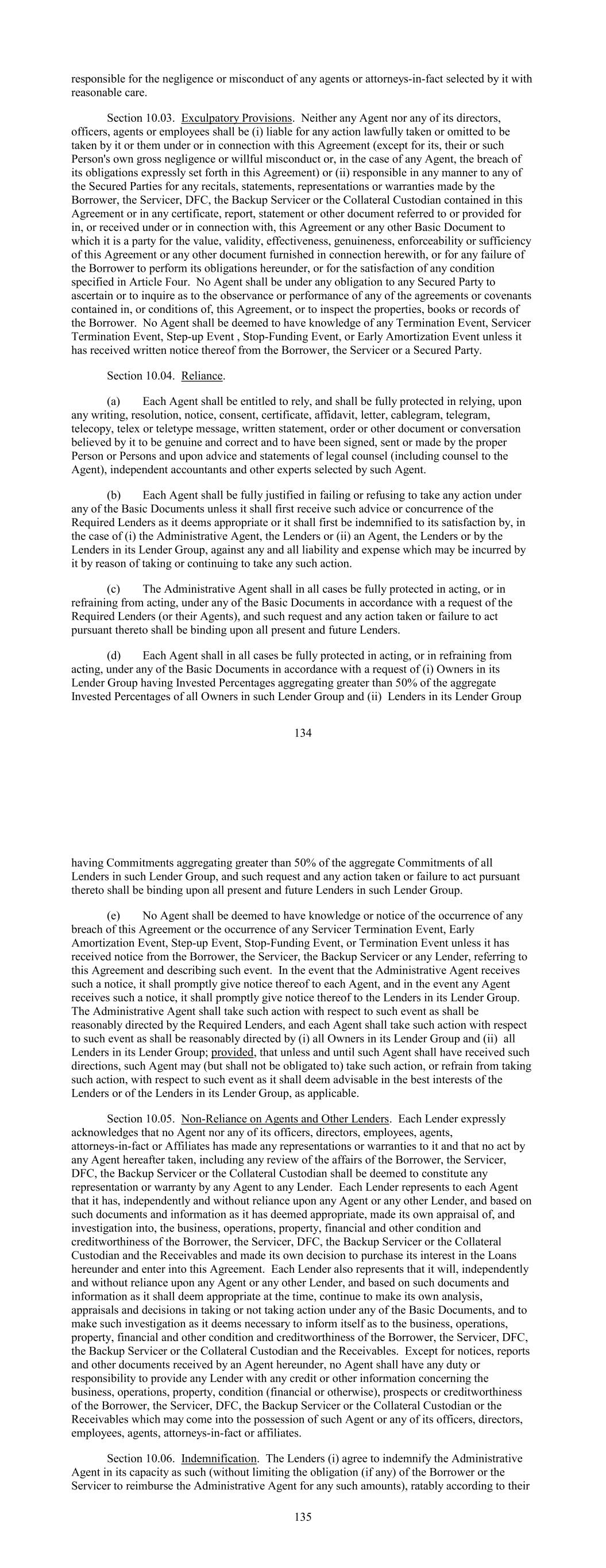 responsible for the negligence or misconduct of any agents or attorneys-in-fact selected by it with reasonable care. Section 10.03. Exculpatory Provisions. Neither any Agent nor any of its directors, officers, agents or employees shall be (i) liable for any action lawfully taken or omitted to be taken by it or them under or in connection with this Agreement (except for its, their or such Person's own gross negligence or willful misconduct or, in the case of any Agent, the breach of its obligations expressly set forth in this Agreement) or (ii) responsible in any manner to any of the Secured Parties for any recitals, statements, representations or warranties made by the Borrower, the Servicer, DFC, the Backup Servicer or the Collateral Custodian contained in this Agreement or in any certificate, report, statement or other document referred to or provided for in, or received under or in connection with, this Agreement or any other Basic Document to which it is a party for the value, validity, effectiveness, genuineness, enforceability or sufficiency of this Agreement or any other document furnished in connection herewith, or for any failure of the Borrower to perform its obligations hereunder, or for the satisfaction of any condition specified in Article Four. No Agent shall be under any obligation to any Secured Party to ascertain or to inquire as to the observance or performance of any of the agreements or covenants contained in, or conditions of, this Agreement, or to inspect the properties, books or records of the Borrower. No Agent shall be deemed to have knowledge of any Termination Event, Servicer Termination Event, Step-up Event , Stop-Funding Event, or Early Amortization Event unless it has received written notice thereof from the Borrower, the Servicer or a Secured Party. Section 10.04. Reliance. (a) Each Agent shall be entitled to rely, and shall be fully protected in relying, upon any writing, resolution, notice, consent, certificate, affidavit, letter, cablegram, telegram, telecopy, telex or teletype message, written statement, order or other document or conversation believed by it to be genuine and correct and to have been signed, sent or made by the proper Person or Persons and upon advice and statements of legal counsel (including counsel to the Agent), independent accountants and other experts selected by such Agent. (b) Each Agent shall be fully justified in failing or refusing to take any action under any of the Basic Documents unless it shall first receive such advice or concurrence of the Required Lenders as it deems appropriate or it shall first be indemnified to its satisfaction by, in the case of (i) the Administrative Agent, the Lenders or (ii) an Agent, the Lenders or by the Lenders in its Lender Group, against any and all liability and expense which may be incurred by it by reason of taking or continuing to take any such action. (c) The Administrative Agent shall in all cases be fully protected in acting, or in refraining from acting, under any of the Basic Documents in accordance with a request of the Required Lenders (or their Agents), and such request and any action taken or failure to act pursuant thereto shall be binding upon all present and future Lenders. (d) Each Agent shall in all cases be fully protected in acting, or in refraining from acting, under any of the Basic Documents in accordance with a request of (i) Owners in its Lender Group having Invested Percentages aggregating greater than 50% of the aggregate Invested Percentages of all Owners in such Lender Group and (ii) Lenders in its Lender Group 134 having Commitments aggregating greater than 50% of the aggregate Commitments of all Lenders in such Lender Group, and such request and any action taken or failure to act pursuant thereto shall be binding upon all present and future Lenders in such Lender Group. (e) No Agent shall be deemed to have knowledge or notice of the occurrence of any breach of this Agreement or the occurrence of any Servicer Termination Event, Early Amortization Event, Step-up Event, Stop-Funding Event, or Termination Event unless it has received notice from the Borrower, the Servicer, the Backup Servicer or any Lender, referring to this Agreement and describing such event. In the event that the Administrative Agent receives such a notice, it shall promptly give notice thereof to each Agent, and in the event any Agent receives such a notice, it shall promptly give notice thereof to the Lenders in its Lender Group. The Administrative Agent shall take such action with respect to such event as shall be reasonably directed by the Required Lenders, and each Agent shall take such action with respect to such event as shall be reasonably directed by (i) all Owners in its Lender Group and (ii) all Lenders in its Lender Group; provided, that unless and until such Agent shall have received such directions, such Agent may (but shall not be obligated to) take such action, or refrain from taking such action, with respect to such event as it shall deem advisable in the best interests of the Lenders or of the Lenders in its Lender Group, as applicable. Section 10.05. Non-Reliance on Agents and Other Lenders. Each Lender expressly acknowledges that no Agent nor any of its officers, directors, employees, agents, attorneys-in-fact or Affiliates has made any representations or warranties to it and that no act by any Agent hereafter taken, including any review of the affairs of the Borrower, the Servicer, DFC, the Backup Servicer or the Collateral Custodian shall be deemed to constitute any representation or warranty by any Agent to any Lender. Each Lender represents to each Agent that it has, independently and without reliance upon any Agent or any other Lender, and based on such documents and information as it has deemed appropriate, made its own appraisal of, and investigation into, the business, operations, property, financial and other condition and creditworthiness of the Borrower, the Servi