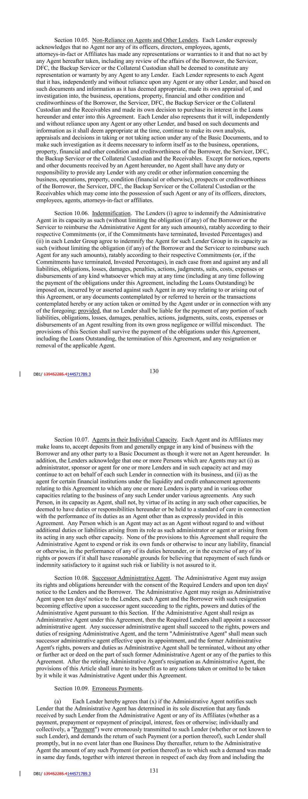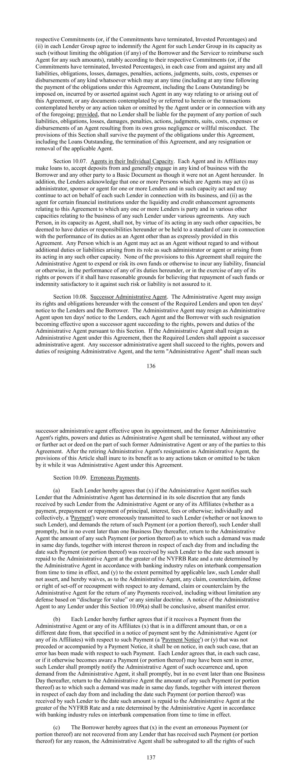 respective Commitments (or, if the Commitments have terminated, Invested Percentages) and (ii) in each Lender Group agree to indemnify the Agent for such Lender Group in its capacity as such (without limiting the obligation (if any) of the Borrower and the Servicer to reimburse such Agent for any such amounts), ratably according to their respective Commitments (or, if the Commitments have terminated, Invested Percentages), in each case from and against any and all liabilities, obligations, losses, damages, penalties, actions, judgments, suits, costs, expenses or disbursements of any kind whatsoever which may at any time (including at any time following the payment of the obligations under this Agreement, including the Loans Outstanding) be imposed on, incurred by or asserted against such Agent in any way relating to or arising out of this Agreement, or any documents contemplated by or referred to herein or the transactions contemplated hereby or any action taken or omitted by the Agent under or in connection with any of the foregoing; provided, that no Lender shall be liable for the payment of any portion of such liabilities, obligations, losses, damages, penalties, actions, judgments, suits, costs, expenses or disbursements of an Agent resulting from its own gross negligence or willful misconduct. The provisions of this Section shall survive the payment of the obligations under this Agreement, including the Loans Outstanding, the termination of this Agreement, and any resignation or removal of the applicable Agent. Section 10.07. Agents in their Individual Capacity. Each Agent and its Affiliates may make loans to, accept deposits from and generally engage in any kind of business with the Borrower and any other party to a Basic Document as though it were not an Agent hereunder. In addition, the Lenders acknowledge that one or more Persons which are Agents may act (i) as administrator, sponsor or agent for one or more Lenders and in such capacity act and may continue to act on behalf of each such Lender in connection with its business, and (ii) as the agent for certain financial institutions under the liquidity and credit enhancement agreements relating to this Agreement to which any one or more Lenders is party and in various other capacities relating to the business of any such Lender under various agreements. Any such Person, in its capacity as Agent, shall not, by virtue of its acting in any such other capacities, be deemed to have duties or responsibilities hereunder or be held to a standard of care in connection with the performance of its duties as an Agent other than as expressly provided in this Agreement. Any Person which is an Agent may act as an Agent without regard to and without additional duties or liabilities arising from its role as such administrator or agent or arising from its acting in any such other capacity. None of the provisions to this Agreement shall require the Administrative Agent to expend or risk its own funds or otherwise to incur any liability, financial or otherwise, in the performance of any of its duties hereunder, or in the exercise of any of its rights or powers if it shall have reasonable grounds for believing that repayment of such funds or indemnity satisfactory to it against such risk or liability is not assured to it. Section 10.08. Successor Administrative Agent. The Administrative Agent may assign its rights and obligations hereunder with the consent of the Required Lenders and upon ten days' notice to the Lenders and the Borrower. The Administrative Agent may resign as Administrative Agent upon ten days' notice to the Lenders, each Agent and the Borrower with such resignation becoming effective upon a successor agent succeeding to the rights, powers and duties of the Administrative Agent pursuant to this Section. If the Administrative Agent shall resign as Administrative Agent under this Agreement, then the Required Lenders shall appoint a successor administrative agent. Any successor administrative agent shall succeed to the rights, powers and duties of resigning Administrative Agent, and the term "Administrative Agent" shall mean such 136 successor administrative agent effective upon its appointment, and the former Administrative Agent's rights, powers and duties as Administrative Agent shall be terminated, without any other or further act or deed on the part of such former Administrative Agent or any of the parties to this Agreement. After the retiring Administrative Agent's resignation as Administrative Agent, the provisions of this Article shall inure to its benefit as to any actions taken or omitted to be taken by it while it was Administrative Agent under this Agreement. Section 10.09. Erroneous Payments. (a) Each Lender hereby agrees that (x) if the Administrative Agent notifies such Lender that the Administrative Agent has determined in its sole discretion that any funds received by such Lender from the Administrative Agent or any of its Affiliates (whether as a payment, prepayment or repayment of principal, interest, fees or otherwise; individually and collectively, a 'Payment') were erroneously transmitted to such Lender (whether or not known to such Lender), and demands the return of such Payment (or a portion thereof), such Lender shall promptly, but in no event later than one Business Day thereafter, return to the Administrative Agent the amount of any such Payment (or portion thereof) as to which such a demand was made in same day funds, together with interest thereon in respect of each day from and including the date such Payment (or portion thereof) was received by such Lender to the date such amount is repaid to the Administrative Agent at the greater of the NYFRB Rate and a rate determined by the Administrative Agent in accordance with banking industry rules on interbank compensation from time to time in effect, and (y) to the extent permitted by applicable law, such Lender shall not assert, and hereby waives, as to the Admi