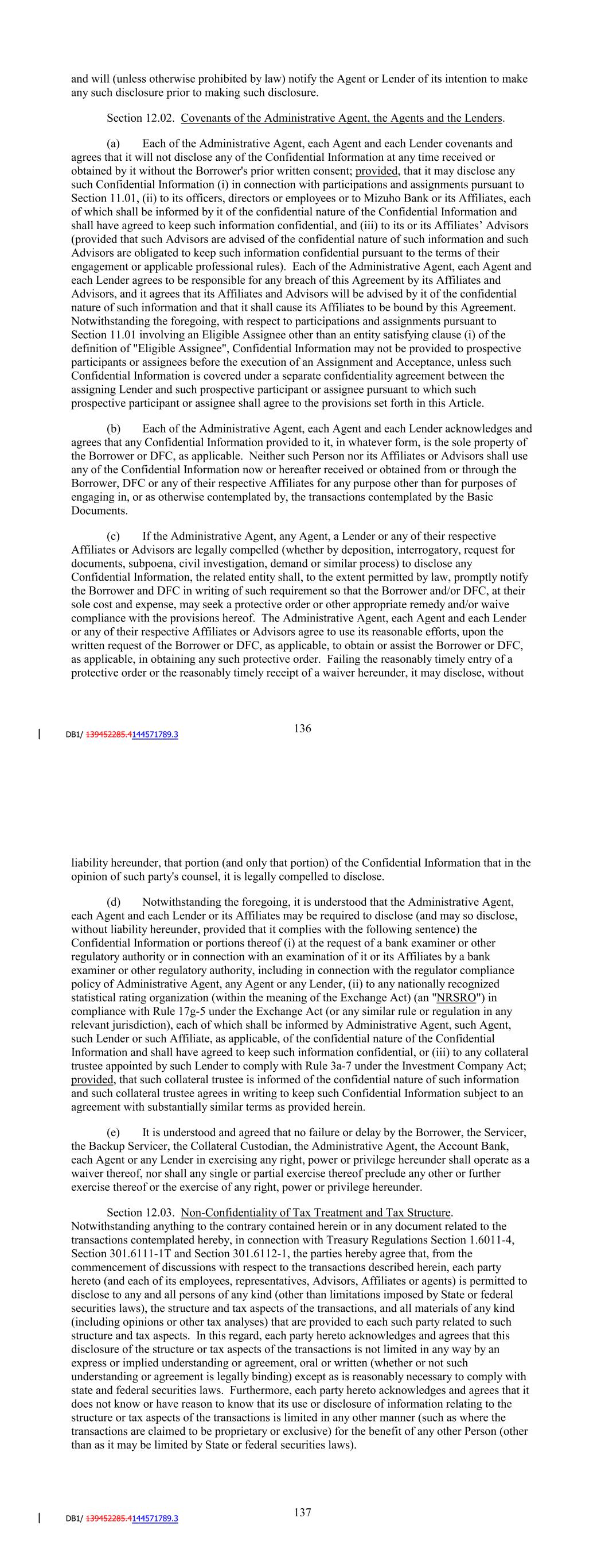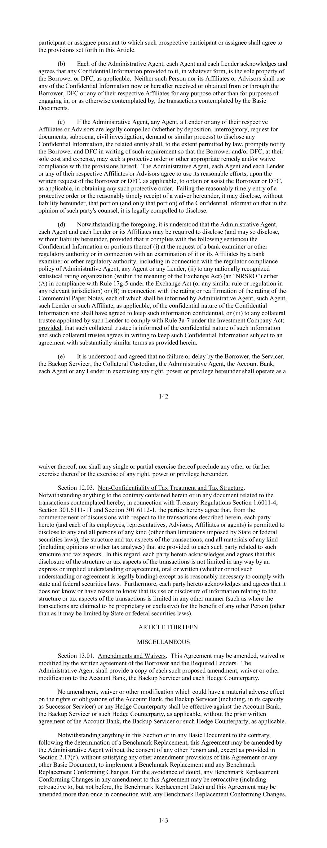 participant or assignee pursuant to which such prospective participant or assignee shall agree to the provisions set forth in this Article. (b) Each of the Administrative Agent, each Agent and each Lender acknowledges and agrees that any Confidential Information provided to it, in whatever form, is the sole property of the Borrower or DFC, as applicable. Neither such Person nor its Affiliates or Advisors shall use any of the Confidential Information now or hereafter received or obtained from or through the Borrower, DFC or any of their respective Affiliates for any purpose other than for purposes of engaging in, or as otherwise contemplated by, the transactions contemplated by the Basic Documents. (c) If the Administrative Agent, any Agent, a Lender or any of their respective Affiliates or Advisors are legally compelled (whether by deposition, interrogatory, request for documents, subpoena, civil investigation, demand or similar process) to disclose any Confidential Information, the related entity shall, to the extent permitted by law, promptly notify the Borrower and DFC in writing of such requirement so that the Borrower and/or DFC, at their sole cost and expense, may seek a protective order or other appropriate remedy and/or waive compliance with the provisions hereof. The Administrative Agent, each Agent and each Lender or any of their respective Affiliates or Advisors agree to use its reasonable efforts, upon the written request of the Borrower or DFC, as applicable, to obtain or assist the Borrower or DFC, as applicable, in obtaining any such protective order. Failing the reasonably timely entry of a protective order or the reasonably timely receipt of a waiver hereunder, it may disclose, without liability hereunder, that portion (and only that portion) of the Confidential Information that in the opinion of such party's counsel, it is legally compelled to disclose. (d) Notwithstanding the foregoing, it is understood that the Administrative Agent, each Agent and each Lender or its Affiliates may be required to disclose (and may so disclose, without liability hereunder, provided that it complies with the following sentence) the Confidential Information or portions thereof (i) at the request of a bank examiner or other regulatory authority or in connection with an examination of it or its Affiliates by a bank examiner or other regulatory authority, including in connection with the regulator compliance policy of Administrative Agent, any Agent or any Lender, (ii) to any nationally recognized statistical rating organization (within the meaning of the Exchange Act) (an "NRSRO") either (A) in compliance with Rule 17g-5 under the Exchange Act (or any similar rule or regulation in any relevant jurisdiction) or (B) in connection with the rating or reaffirmation of the rating of the Commercial Paper Notes, each of which shall be informed by Administrative Agent, such Agent, such Lender or such Affiliate, as applicable, of the confidential nature of the Confidential Information and shall have agreed to keep such information confidential, or (iii) to any collateral trustee appointed by such Lender to comply with Rule 3a-7 under the Investment Company Act; provided, that such collateral trustee is informed of the confidential nature of such information and such collateral trustee agrees in writing to keep such Confidential Information subject to an agreement with substantially similar terms as provided herein. (e) It is understood and agreed that no failure or delay by the Borrower, the Servicer, the Backup Servicer, the Collateral Custodian, the Administrative Agent, the Account Bank, each Agent or any Lender in exercising any right, power or privilege hereunder shall operate as a 142 waiver thereof, nor shall any single or partial exercise thereof preclude any other or further exercise thereof or the exercise of any right, power or privilege hereunder. Section 12.03. Non-Confidentiality of Tax Treatment and Tax Structure. Notwithstanding anything to the contrary contained herein or in any document related to the transactions contemplated hereby, in connection with Treasury Regulations Section 1.6011-4, Section 301.6111-1T and Section 301.6112-1, the parties hereby agree that, from the commencement of discussions with respect to the transactions described herein, each party hereto (and each of its employees, representatives, Advisors, Affiliates or agents) is permitted to disclose to any and all persons of any kind (other than limitations imposed by State or federal securities laws), the structure and tax aspects of the transactions, and all materials of any kind (including opinions or other tax analyses) that are provided to each such party related to such structure and tax aspects. In this regard, each party hereto acknowledges and agrees that this disclosure of the structure or tax aspects of the transactions is not limited in any way by an express or implied understanding or agreement, oral or written (whether or not such understanding or agreement is legally binding) except as is reasonably necessary to comply with state and federal securities laws. Furthermore, each party hereto acknowledges and agrees that it does not know or have reason to know that its use or disclosure of information relating to the structure or tax aspects of the transactions is limited in any other manner (such as where the transactions are claimed to be proprietary or exclusive) for the benefit of any other Person (other than as it may be limited by State or federal securities laws). ARTICLE THIRTEEN MISCELLANEOUS Section 13.01. Amendments and Waivers. This Agreement may be amended, waived or modified by the written agreement of the Borrower and the Required Lenders. The Administrative Agent shall provide a copy of each such proposed amendment, waiver or other modification to the Account Bank, the Backup Servicer and each Hedge Counterparty. No amendment, waiver or other modification which could have a material adv