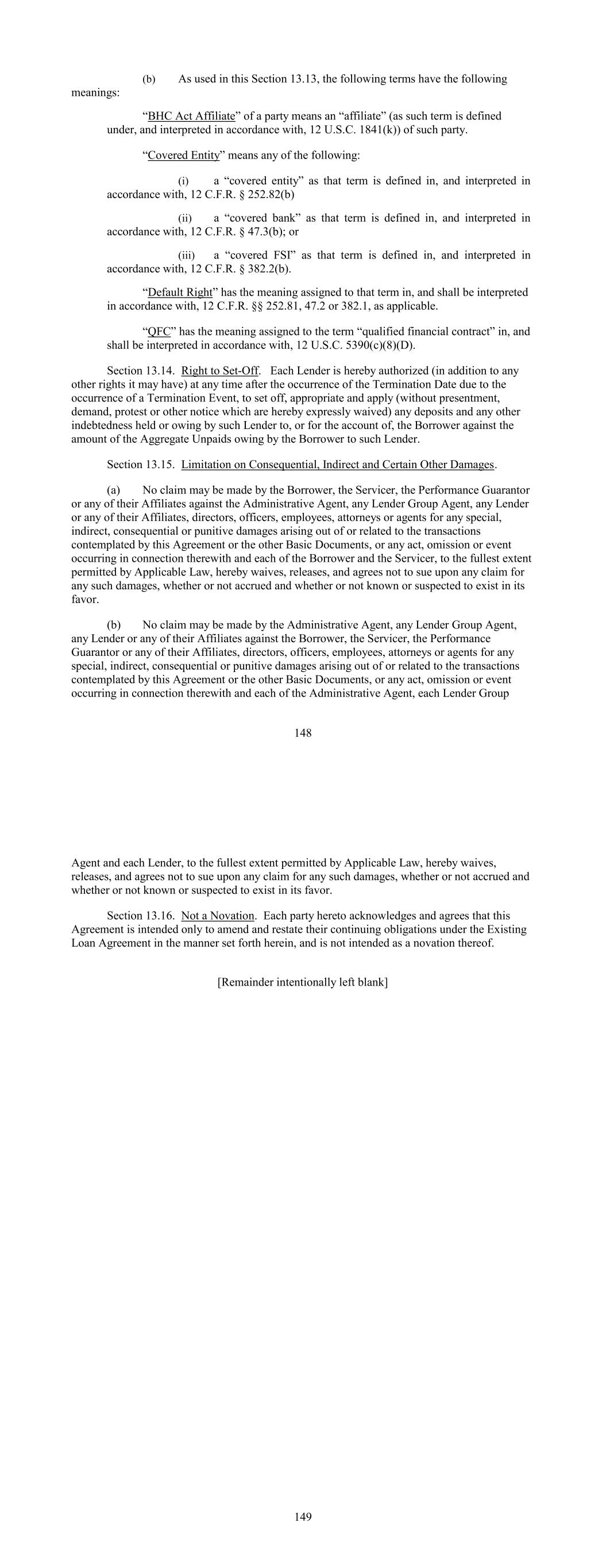 (b) As used in this Section 13.13, the following terms have the following meanings: “BHC Act Affiliate” of a party means an “affiliate” (as such term is defined under, and interpreted in accordance with, 12 U.S.C. 1841(k)) of such party. “Covered Entity” means any of the following: (i) a “covered entity” as that term is defined in, and interpreted in accordance with, 12 C.F.R. § 252.82(b) (ii) a “covered bank” as that term is defined in, and interpreted in accordance with, 12 C.F.R. § 47.3(b); or (iii) a “covered FSI” as that term is defined in, and interpreted in accordance with, 12 C.F.R. § 382.2(b). “Default Right” has the meaning assigned to that term in, and shall be interpreted in accordance with, 12 C.F.R. §§ 252.81, 47.2 or 382.1, as applicable. “QFC” has the meaning assigned to the term “qualified financial contract” in, and shall be interpreted in accordance with, 12 U.S.C. 5390(c)(8)(D). Section 13.14. Right to Set-Off. Each Lender is hereby authorized (in addition to any other rights it may have) at any time after the occurrence of the Termination Date due to the occurrence of a Termination Event, to set off, appropriate and apply (without presentment, demand, protest or other notice which are hereby expressly waived) any deposits and any other indebtedness held or owing by such Lender to, or for the account of, the Borrower against the amount of the Aggregate Unpaids owing by the Borrower to such Lender. Section 13.15. Limitation on Consequential, Indirect and Certain Other Damages. (a) No claim may be made by the Borrower, the Servicer, the Performance Guarantor or any of their Affiliates against the Administrative Agent, any Lender Group Agent, any Lender or any of their Affiliates, directors, officers, employees, attorneys or agents for any special, indirect, consequential or punitive damages arising out of or related to the transactions contemplated by this Agreement or the other Basic Documents, or any act, omission or event occurring in connection therewith and each of the Borrower and the Servicer, to the fullest extent permitted by Applicable Law, hereby waives, releases, and agrees not to sue upon any claim for any such damages, whether or not accrued and whether or not known or suspected to exist in its favor. (b) No claim may be made by the Administrative Agent, any Lender Group Agent, any Lender or any of their Affiliates against the Borrower, the Servicer, the Performance Guarantor or any of their Affiliates, directors, officers, employees, attorneys or agents for any special, indirect, consequential or punitive damages arising out of or related to the transactions contemplated by this Agreement or the other Basic Documents, or any act, omission or event occurring in connection therewith and each of the Administrative Agent, each Lender Group 148 Agent and each Lender, to the fullest extent permitted by Applicable Law, hereby waives, releases, and agrees not to sue upon any claim for any such damages, whether or not accrued and whether or not known or suspected to exist in its favor. Section 13.16. Not a Novation. Each party hereto acknowledges and agrees that this Agreement is intended only to amend and restate their continuing obligations under the Existing Loan Agreement in the manner set forth herein, and is not intended as a novation thereof. [Remainder intentionally left blank] 149
