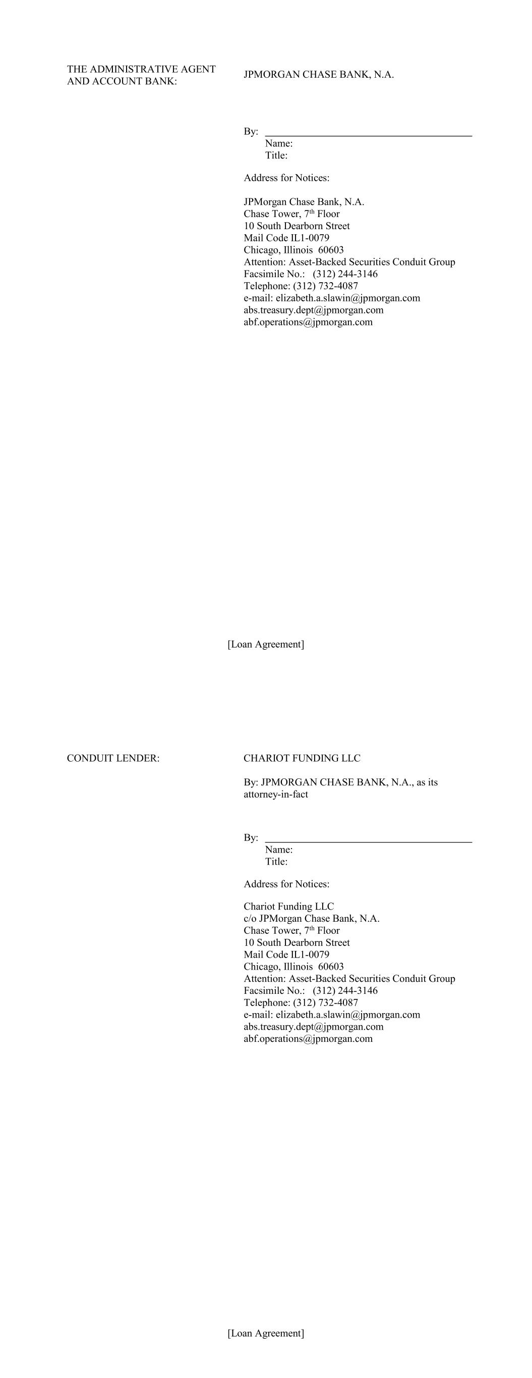 [Loan Agreement] THE ADMINISTRATIVE AGENT AND ACCOUNT BANK: JPMORGAN CHASE BANK, N.A. By: Name: Title: Address for Notices: JPMorgan Chase Bank, N.A. Chase Tower, 7th Floor 10 South Dearborn Street Mail Code IL1-0079 Chicago, Illinois 60603 Attention: Asset-Backed Securities Conduit Group Facsimile No.: (312) 244-3146 Telephone: (312) 732-4087 e-mail: elizabeth.a.slawin@jpmorgan.com abs.treasury.dept@jpmorgan.com abf.operations@jpmorgan.com [Loan Agreement] CONDUIT LENDER: CHARIOT FUNDING LLC By: JPMORGAN CHASE BANK, N.A., as its attorney-in-fact By: Name: Title: Address for Notices: Chariot Funding LLC c/o JPMorgan Chase Bank, N.A. Chase Tower, 7th Floor 10 South Dearborn Street Mail Code IL1-0079 Chicago, Illinois 60603 Attention: Asset-Backed Securities Conduit Group Facsimile No.: (312) 244-3146 Telephone: (312) 732-4087 e-mail: elizabeth.a.slawin@jpmorgan.com abs.treasury.dept@jpmorgan.com abf.operations@jpmorgan.com