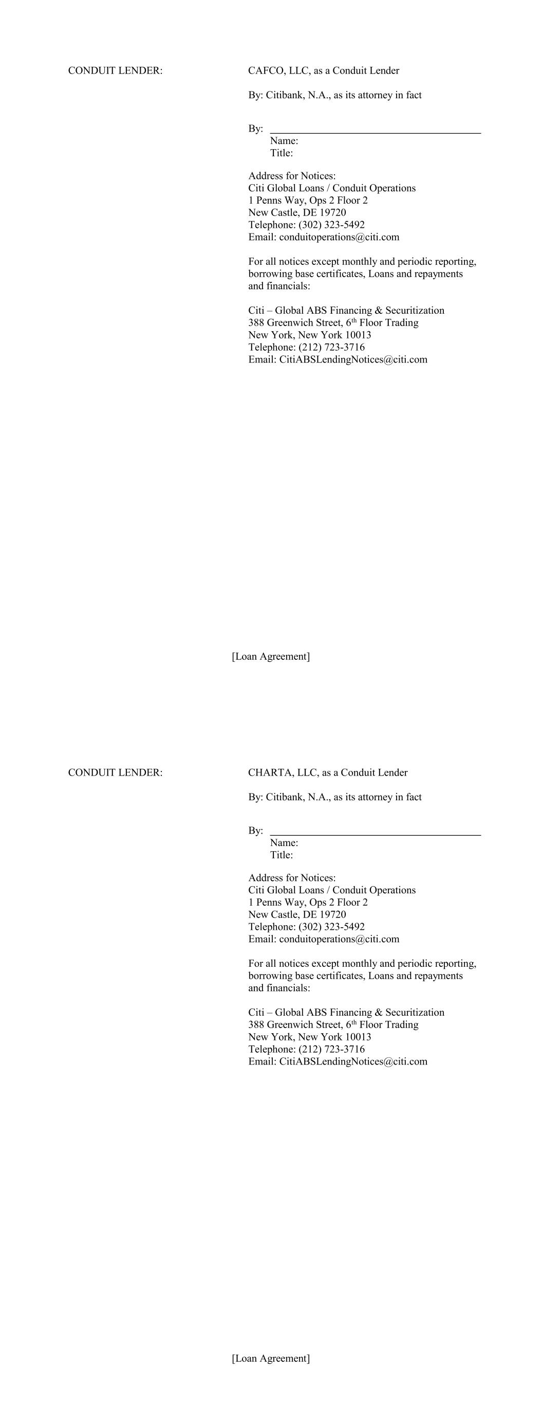 [Loan Agreement] CONDUIT LENDER: CAFCO, LLC, as a Conduit Lender By: Citibank, N.A., as its attorney in fact By: Name: Title: Address for Notices: Citi Global Loans / Conduit Operations 1 Penns Way, Ops 2 Floor 2 New Castle, DE 19720 Telephone: (302) 323-5492 Email: conduitoperations@citi.com For all notices except monthly and periodic reporting, borrowing base certificates, Loans and repayments and financials: Citi – Global ABS Financing & Securitization 388 Greenwich Street, 6th Floor Trading New York, New York 10013 Telephone: (212) 723-3716 Email: CitiABSLendingNotices@citi.com [Loan Agreement] CONDUIT LENDER: CHARTA, LLC, as a Conduit Lender By: Citibank, N.A., as its attorney in fact By: Name: Title: Address for Notices: Citi Global Loans / Conduit Operations 1 Penns Way, Ops 2 Floor 2 New Castle, DE 19720 Telephone: (302) 323-5492 Email: conduitoperations@citi.com For all notices except monthly and periodic reporting, borrowing base certificates, Loans and repayments and financials: Citi – Global ABS Financing & Securitization 388 Greenwich Street, 6th Floor Trading New York, New York 10013 Telephone: (212) 723-3716 Email: CitiABSLendingNotices@citi.com