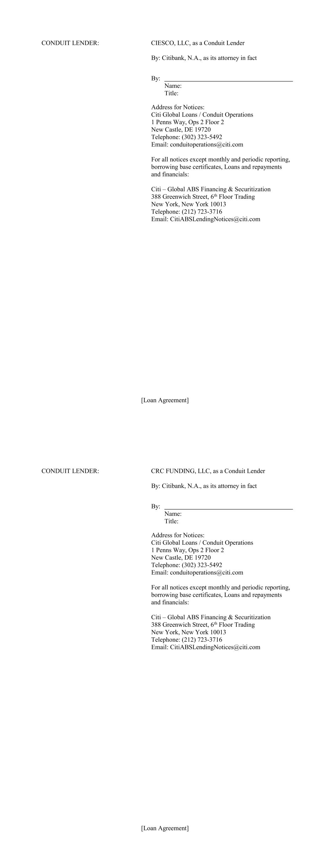 [Loan Agreement] CONDUIT LENDER: CIESCO, LLC, as a Conduit Lender By: Citibank, N.A., as its attorney in fact By: Name: Title: Address for Notices: Citi Global Loans / Conduit Operations 1 Penns Way, Ops 2 Floor 2 New Castle, DE 19720 Telephone: (302) 323-5492 Email: conduitoperations@citi.com For all notices except monthly and periodic reporting, borrowing base certificates, Loans and repayments and financials: Citi – Global ABS Financing & Securitization 388 Greenwich Street, 6th Floor Trading New York, New York 10013 Telephone: (212) 723-3716 Email: CitiABSLendingNotices@citi.com [Loan Agreement] CONDUIT LENDER: CRC FUNDING, LLC, as a Conduit Lender By: Citibank, N.A., as its attorney in fact By: Name: Title: Address for Notices: Citi Global Loans / Conduit Operations 1 Penns Way, Ops 2 Floor 2 New Castle, DE 19720 Telephone: (302) 323-5492 Email: conduitoperations@citi.com For all notices except monthly and periodic reporting, borrowing base certificates, Loans and repayments and financials: Citi – Global ABS Financing & Securitization 388 Greenwich Street, 6th Floor Trading New York, New York 10013 Telephone: (212) 723-3716 Email: CitiABSLendingNotices@citi.com