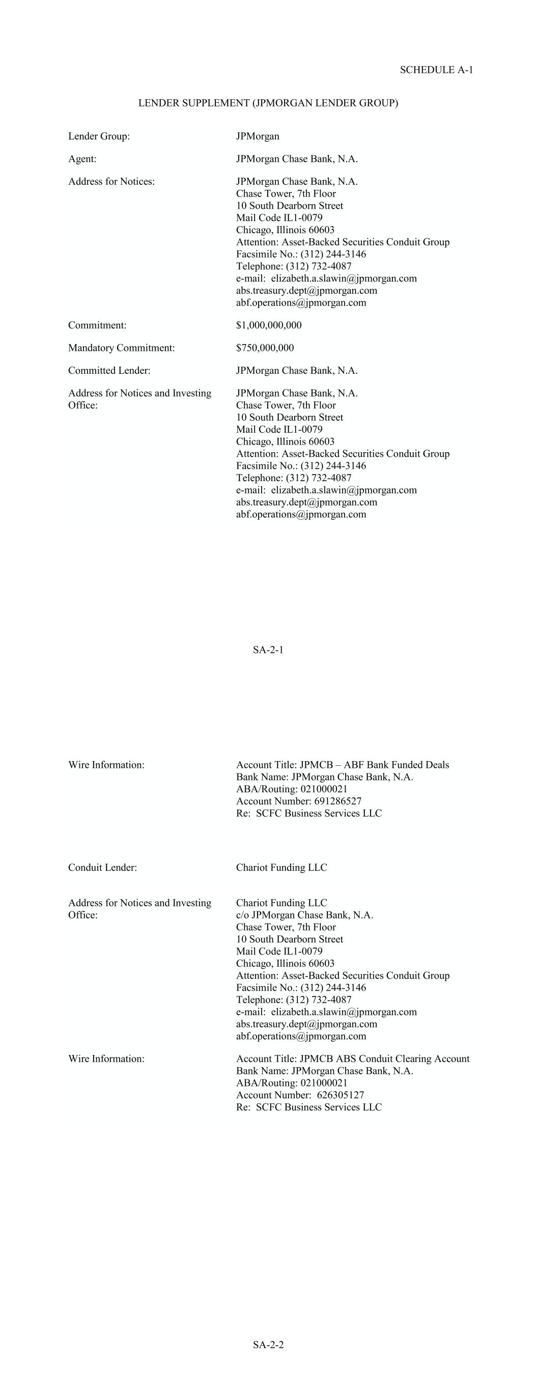SA-2-1 Commitment: $1,000,000,000 Agent: Mandatory Commitment: JPMorgan Chase Bank, N.A. $750,000,000 Lender Group: Committed Lender: JPMorgan Chase Bank, N.A. Address for Notices: JPMorgan Address for Notices and Investing Office: JPMorgan Chase Bank, N.A. Chase Tower, 7th Floor 10 South Dearborn Street Mail Code IL1-0079 Chicago, Illinois 60603 Attention: Asset-Backed Securities Conduit Group Facsimile No.: (312) 244-3146 Telephone: (312) 732-4087 e-mail: elizabeth.a.slawin@jpmorgan.com abs.treasury.dept@jpmorgan.com abf.operations@jpmorgan.com JPMorgan Chase Bank, N.A. Chase Tower, 7th Floor 10 South Dearborn Street Mail Code IL1-0079 Chicago, Illinois 60603 Attention: Asset-Backed Securities Conduit Group Facsimile No.: (312) 244-3146 Telephone: (312) 732-4087 e-mail: elizabeth.a.slawin@jpmorgan.com abs.treasury.dept@jpmorgan.com abf.operations@jpmorgan.com SCHEDULE A-1 LENDER SUPPLEMENT (JPMORGAN LENDER GROUP) SA-2-2 Account Title: JPMCB – ABF Bank Funded Deals Bank Name: JPMorgan Chase Bank, N.A. ABA/Routing: 021000021 Account Number: 691286527 Re: SCFC Business Services LLC Address for Notices and Investing Office: Chariot Funding LLC c/o JPMorgan Chase Bank, N.A. Chase Tower, 7th Floor 10 South Dearborn Street Mail Code IL1-0079 Chicago, Illinois 60603 Attention: Asset-Backed Securities Conduit Group Facsimile No.: (312) 244-3146 Telephone: (312) 732-4087 e-mail: elizabeth.a.slawin@jpmorgan.com abs.treasury.dept@jpmorgan.com abf.operations@jpmorgan.com Wire Information: Conduit Lender: Account Title: JPMCB ABS Conduit Clearing Account Bank Name: JPMorgan Chase Bank, N.A. ABA/Routing: 021000021 Account Number: 626305127 Re: SCFC Business Services LLC Wire Information: Chariot Funding LLC