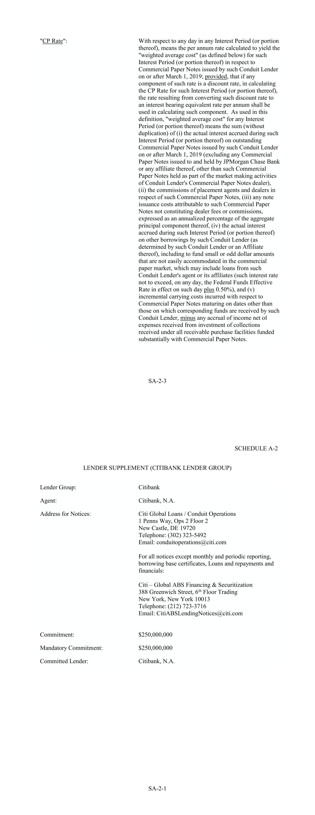 SA-2-3 "CP Rate": With respect to any day in any Interest Period (or portion thereof), means the per annum rate calculated to yield the "weighted average cost" (as defined below) for such Interest Period (or portion thereof) in respect to Commercial Paper Notes issued by such Conduit Lender on or after March 1, 2019; provided, that if any component of such rate is a discount rate, in calculating the CP Rate for such Interest Period (or portion thereof), the rate resulting from converting such discount rate to an interest bearing equivalent rate per annum shall be used in calculating such component. As used in this definition, "weighted average cost" for any Interest Period (or portion thereof) means the sum (without duplication) of (i) the actual interest accrued during such Interest Period (or portion thereof) on outstanding Commercial Paper Notes issued by such Conduit Lender on or after March 1, 2019 (excluding any Commercial Paper Notes issued to and held by JPMorgan Chase Bank or any affiliate thereof, other than such Commercial Paper Notes held as part of the market making activities of Conduit Lender's Commercial Paper Notes dealer), (ii) the commissions of placement agents and dealers in respect of such Commercial Paper Notes, (iii) any note issuance costs attributable to such Commercial Paper Notes not constituting dealer fees or commissions, expressed as an annualized percentage of the aggregate principal component thereof, (iv) the actual interest accrued during such Interest Period (or portion thereof) on other borrowings by such Conduit Lender (as determined by such Conduit Lender or an Affiliate thereof), including to fund small or odd dollar amounts that are not easily accommodated in the commercial paper market, which may include loans from such Conduit Lender's agent or its affiliates (such interest rate not to exceed, on any day, the Federal Funds Effective Rate in effect on such day plus 0.50%), and (v) incremental carrying costs incurred with respect to Commercial Paper Notes maturing on dates other than those on which corresponding funds are received by such Conduit Lender, minus any accrual of income net of expenses received from investment of collections received under all receivable purchase facilities funded substantially with Commercial Paper Notes. SA-2-1 Citi Global Loans / Conduit Operations 1 Penns Way, Ops 2 Floor 2 New Castle, DE 19720 Telephone: (302) 323-5492 Email: conduitoperations@citi.com For all notices except monthly and periodic reporting, borrowing base certificates, Loans and repayments and financials: Citi – Global ABS Financing & Securitization 388 Greenwich Street, 6th Floor Trading New York, New York 10013 Telephone: (212) 723-3716 Email: CitiABSLendingNotices@citi.com SCHEDULE A-2 LENDER SUPPLEMENT (CITIBANK LENDER GROUP) Commitment: $250,000,000 Agent: Mandatory Commitment: Citibank, N.A. $250,000,000 Lender Group: Committed Lender: Citibank, N.A. Address for Notices: Citibank