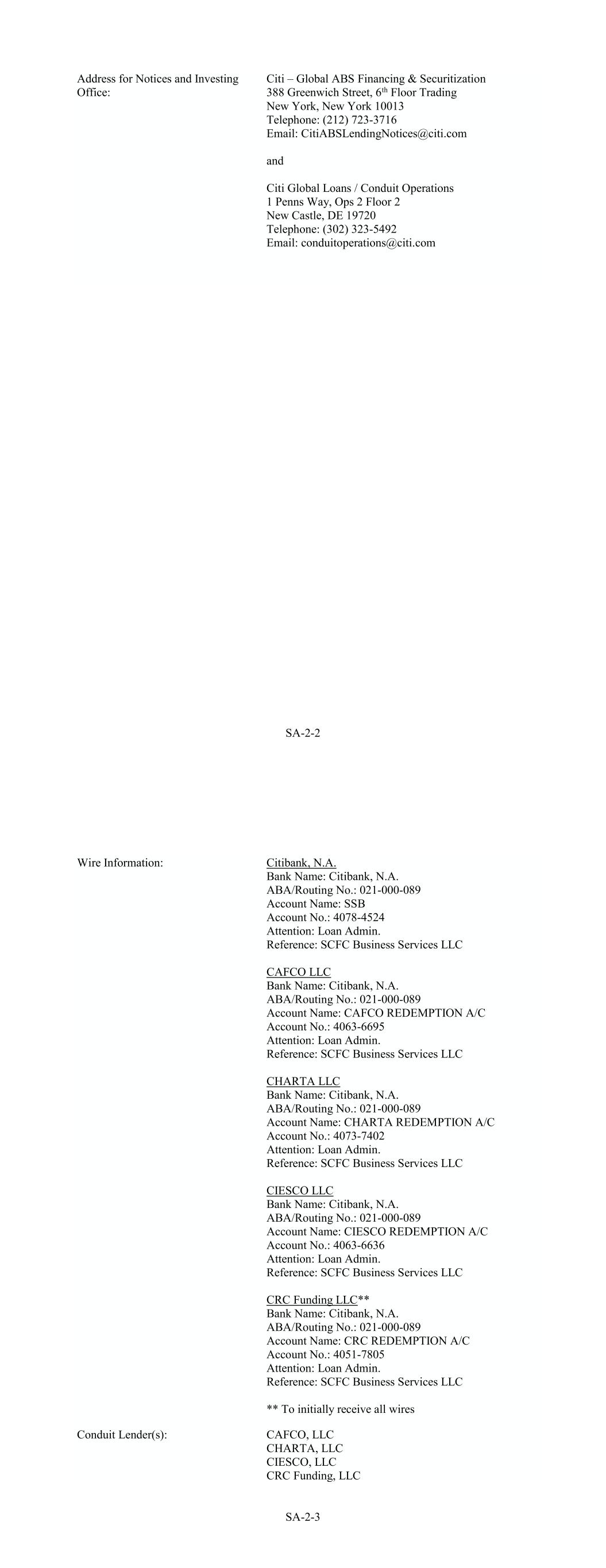 SA-2-2 Address for Notices and Investing Office: Citi – Global ABS Financing & Securitization 388 Greenwich Street, 6th Floor Trading New York, New York 10013 Telephone: (212) 723-3716 Email: CitiABSLendingNotices@citi.com and Citi Global Loans / Conduit Operations 1 Penns Way, Ops 2 Floor 2 New Castle, DE 19720 Telephone: (302) 323-5492 Email: conduitoperations@citi.com SA-2-3 Conduit Lender(s): Wire Information: CAFCO, LLC CHARTA, LLC CIESCO, LLC CRC Funding, LLC Citibank, N.A. Bank Name: Citibank, N.A. ABA/Routing No.: 021-000-089 Account Name: SSB Account No.: 4078-4524 Attention: Loan Admin. Reference: SCFC Business Services LLC CAFCO LLC Bank Name: Citibank, N.A. ABA/Routing No.: 021-000-089 Account Name: CAFCO REDEMPTION A/C Account No.: 4063-6695 Attention: Loan Admin. Reference: SCFC Business Services LLC CHARTA LLC Bank Name: Citibank, N.A. ABA/Routing No.: 021-000-089 Account Name: CHARTA REDEMPTION A/C Account No.: 4073-7402 Attention: Loan Admin. Reference: SCFC Business Services LLC CIESCO LLC Bank Name: Citibank, N.A. ABA/Routing No.: 021-000-089 Account Name: CIESCO REDEMPTION A/C Account No.: 4063-6636 Attention: Loan Admin. Reference: SCFC Business Services LLC CRC Funding LLC** Bank Name: Citibank, N.A. ABA/Routing No.: 021-000-089 Account Name: CRC REDEMPTION A/C Account No.: 4051-7805 Attention: Loan Admin. Reference: SCFC Business Services LLC ** To initially receive all wires