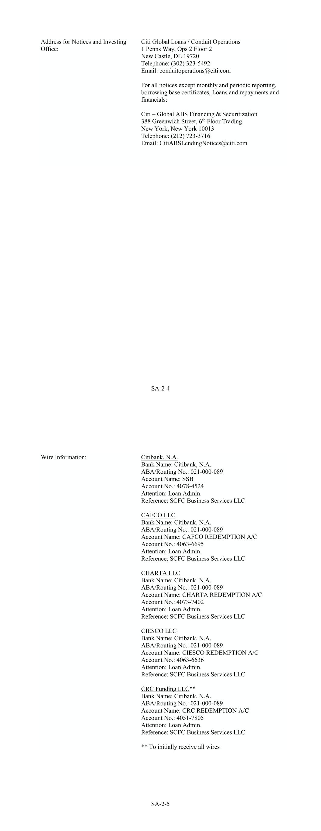 SA-2-4 Address for Notices and Investing Office: Citi Global Loans / Conduit Operations 1 Penns Way, Ops 2 Floor 2 New Castle, DE 19720 Telephone: (302) 323-5492 Email: conduitoperations@citi.com For all notices except monthly and periodic reporting, borrowing base certificates, Loans and repayments and financials: Citi – Global ABS Financing & Securitization 388 Greenwich Street, 6th Floor Trading New York, New York 10013 Telephone: (212) 723-3716 Email: CitiABSLendingNotices@citi.com SA-2-5 Wire Information: Citibank, N.A. Bank Name: Citibank, N.A. ABA/Routing No.: 021-000-089 Account Name: SSB Account No.: 4078-4524 Attention: Loan Admin. Reference: SCFC Business Services LLC CAFCO LLC Bank Name: Citibank, N.A. ABA/Routing No.: 021-000-089 Account Name: CAFCO REDEMPTION A/C Account No.: 4063-6695 Attention: Loan Admin. Reference: SCFC Business Services LLC CHARTA LLC Bank Name: Citibank, N.A. ABA/Routing No.: 021-000-089 Account Name: CHARTA REDEMPTION A/C Account No.: 4073-7402 Attention: Loan Admin. Reference: SCFC Business Services LLC CIESCO LLC Bank Name: Citibank, N.A. ABA/Routing No.: 021-000-089 Account Name: CIESCO REDEMPTION A/C Account No.: 4063-6636 Attention: Loan Admin. Reference: SCFC Business Services LLC CRC Funding LLC** Bank Name: Citibank, N.A. ABA/Routing No.: 021-000-089 Account Name: CRC REDEMPTION A/C Account No.: 4051-7805 Attention: Loan Admin. Reference: SCFC Business Services LLC ** To initially receive all wires