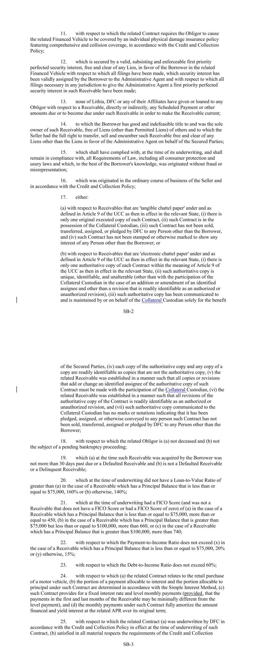 11. with respect to which the related Contract requires the Obligor to cause the related Financed Vehicle to be covered by an individual physical damage insurance policy featuring comprehensive and collision coverage, in accordance with the Credit and Collection Policy; 12. which is secured by a valid, subsisting and enforceable first priority perfected security interest, free and clear of any Lien, in favor of the Borrower in the related Financed Vehicle with respect to which all filings have been made, which security interest has been validly assigned by the Borrower to the Administrative Agent and with respect to which all filings necessary in any jurisdiction to give the Administrative Agent a first priority perfected security interest in such Receivable have been made; 13. none of Lithia, DFC or any of their Affiliates have given or loaned to any Obligor with respect to a Receivable, directly or indirectly, any Scheduled Payment or other amounts due or to become due under such Receivable in order to make the Receivable current; 14. to which the Borrower has good and indefeasible title to and was the sole owner of such Receivable, free of Liens (other than Permitted Liens) of others and to which the Seller had the full right to transfer, sell and encumber such Receivable free and clear of any Liens other than the Liens in favor of the Administrative Agent on behalf of the Secured Parties; 15. which shall have complied with, at the time of its underwriting, and shall remain in compliance with, all Requirements of Law, including all consumer protection and usury laws and which, to the best of the Borrower's knowledge, was originated without fraud or misrepresentation; 16. which was originated in the ordinary course of business of the Seller and in accordance with the Credit and Collection Policy; 17. either: (a) with respect to Receivables that are 'tangible chattel paper' under and as defined in Article 9 of the UCC as then in effect in the relevant State, (i) there is only one original executed copy of each Contract, (ii) such Contract is in the possession of the Collateral Custodian, (iii) such Contract has not been sold, transferred, assigned, or pledged by DFC to any Person other than the Borrower, and (iv) such Contract has not been stamped or otherwise marked to show any interest of any Person other than the Borrower; or (b) with respect to Receivables that are 'electronic chattel paper' under and as defined in Article 9 of the UCC as then in effect in the relevant State, (i) there is only one authoritative copy of each Contract within the meaning of Article 9 of the UCC as then in effect in the relevant State, (ii) such authoritative copy is unique, identifiable, and unalterable (other than with the participation of the Collateral Custodian in the case of an addition or amendment of an identified assignee and other than a revision that is readily identifiable as an authorized or unauthorized revision), (iii) such authoritative copy has been communicated to and is maintained by or on behalf of the Collateral Custodian solely for the benefit SB-2 of the Secured Parties, (iv) each copy of the authoritative copy and any copy of a copy are readily identifiable as copies that are not the authoritative copy, (v) the related Receivable was established in a manner such that all copies or revisions that add or change an identified assignee of the authoritative copy of such Contract must be made with the participation of the Collateral Custodian, (vi) the related Receivable was established in a manner such that all revisions of the authoritative copy of the Contract is readily identifiable as an authorized or unauthorized revision, and (vii) such authoritative copy communicated to the Collateral Custodian has no marks or notations indicating that it has been pledged, assigned, or otherwise conveyed to any person such Contract has not been sold, transferred, assigned or pledged by DFC to any Person other than the Borrower; 18. with respect to which the related Obligor is (a) not deceased and (b) not the subject of a pending bankruptcy proceeding; 19. which (a) at the time such Receivable was acquired by the Borrower was not more than 30 days past due or a Defaulted Receivable and (b) is not a Defaulted Receivable or a Delinquent Receivable; 20. which at the time of underwriting did not have a Loan-to-Value Ratio of greater than (a) in the case of a Receivable which has a Principal Balance that is less than or equal to $75,000, 160% or (b) otherwise, 140%; 21. which at the time of underwriting had a FICO Score (and was not a Receivable that does not have a FICO Score or had a FICO Score of zero) of (a) in the case of a Receivable which has a Principal Balance that is less than or equal to $75,000, more than or equal to 450, (b) in the case of a Receivable which has a Principal Balance that is greater than $75,000 but less than or equal to $100,000, more than 660, or (c) in the case of a Receivable which has a Principal Balance that is greater than $100,000, more than 740; 22. with respect to which the Payment-to-Income Ratio does not exceed (x) in the case of a Receivable which has a Principal Balance that is less than or equal to $75,000, 20% or (y) otherwise, 15%; 23. with respect to which the Debt-to-Income Ratio does not exceed 60%; 24. with respect to which (a) the related Contract relates to the retail purchase of a motor vehicle, (b) the portion of a payment allocable to interest and the portion allocable to principal under such Contract are determined in accordance with the Simple Interest Method, (c) such Contract provides for a fixed interest rate and level monthly payments (provided, that the payments in the first and last months of the Receivable may be minimally different from the level payment), and (d) the monthly payments under such Contract fully amortize the amount financed and yield interest at the related APR over its original term; 25. with respect to which the related 