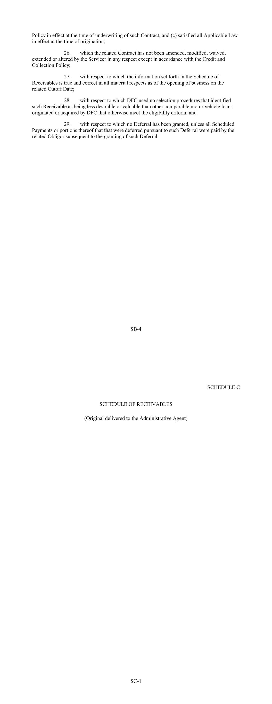 Policy in effect at the time of underwriting of such Contract, and (c) satisfied all Applicable Law in effect at the time of origination; 26. which the related Contract has not been amended, modified, waived, extended or altered by the Servicer in any respect except in accordance with the Credit and Collection Policy; 27. with respect to which the information set forth in the Schedule of Receivables is true and correct in all material respects as of the opening of business on the related Cutoff Date; 28. with respect to which DFC used no selection procedures that identified such Receivable as being less desirable or valuable than other comparable motor vehicle loans originated or acquired by DFC that otherwise meet the eligibility criteria; and 29. with respect to which no Deferral has been granted, unless all Scheduled Payments or portions thereof that that were deferred pursuant to such Deferral were paid by the related Obligor subsequent to the granting of such Deferral. SB-4 SCHEDULE C SCHEDULE OF RECEIVABLES (Original delivered to the Administrative Agent) SC-1