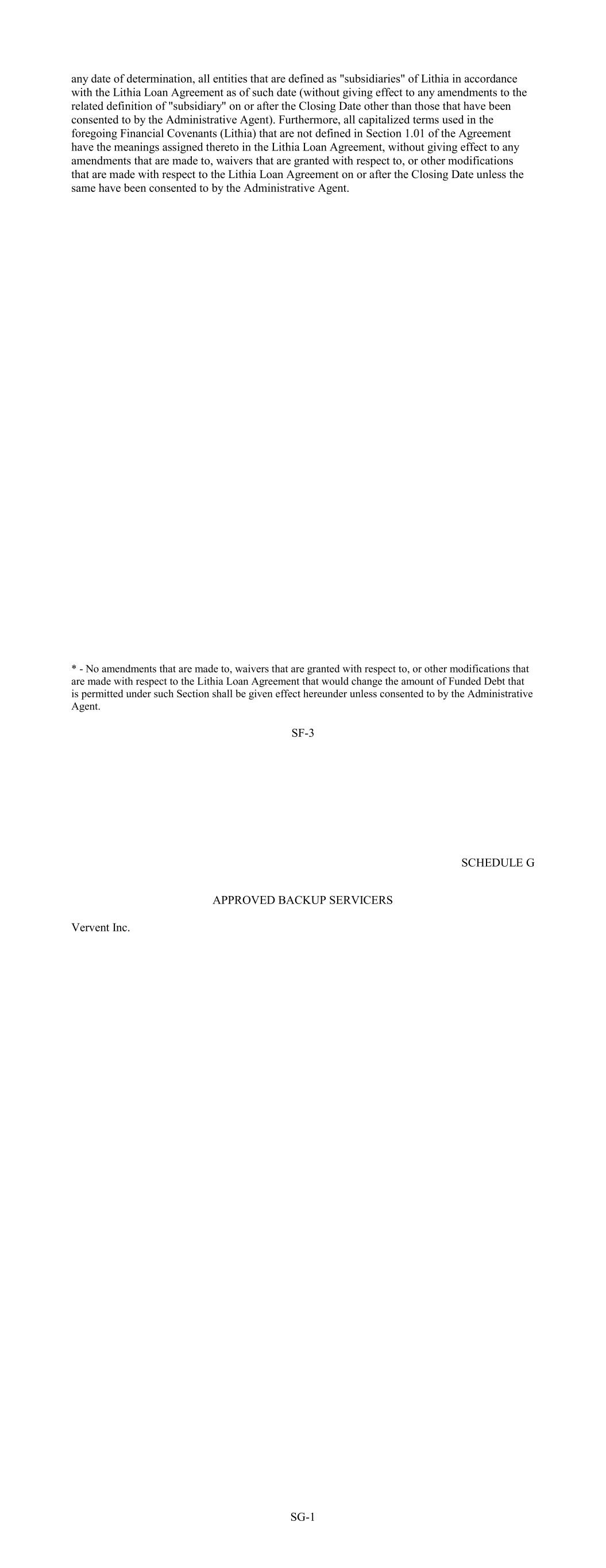 any date of determination, all entities that are defined as "subsidiaries" of Lithia in accordance with the Lithia Loan Agreement as of such date (without giving effect to any amendments to the related definition of "subsidiary" on or after the Closing Date other than those that have been consented to by the Administrative Agent). Furthermore, all capitalized terms used in the foregoing Financial Covenants (Lithia) that are not defined in Section 1.01 of the Agreement have the meanings assigned thereto in the Lithia Loan Agreement, without giving effect to any amendments that are made to, waivers that are granted with respect to, or other modifications that are made with respect to the Lithia Loan Agreement on or after the Closing Date unless the same have been consented to by the Administrative Agent. * - No amendments that are made to, waivers that are granted with respect to, or other modifications that are made with respect to the Lithia Loan Agreement that would change the amount of Funded Debt that is permitted under such Section shall be given effect hereunder unless consented to by the Administrative Agent. SF-3 SCHEDULE G APPROVED BACKUP SERVICERS Vervent Inc. SG-1