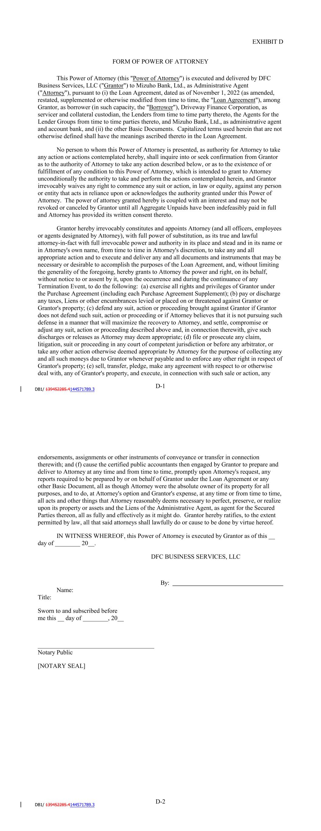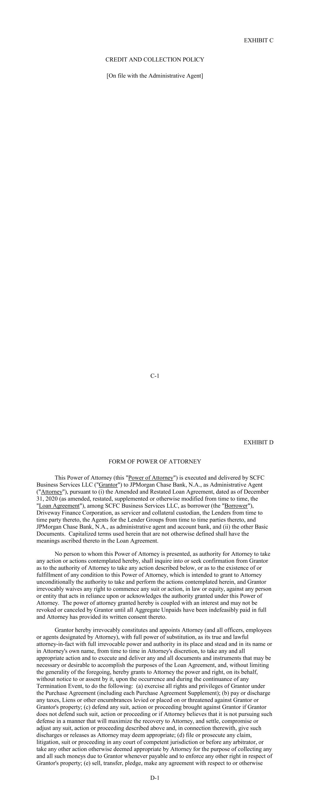 EXHIBIT C CREDIT AND COLLECTION POLICY [On file with the Administrative Agent] C-1 EXHIBIT D FORM OF POWER OF ATTORNEY This Power of Attorney (this "Power of Attorney") is executed and delivered by SCFC Business Services LLC ("Grantor") to JPMorgan Chase Bank, N.A., as Administrative Agent ("Attorney"), pursuant to (i) the Amended and Restated Loan Agreement, dated as of December 31, 2020 (as amended, restated, supplemented or otherwise modified from time to time, the "Loan Agreement"), among SCFC Business Services LLC, as borrower (the "Borrower"), Driveway Finance Corporation, as servicer and collateral custodian, the Lenders from time to time party thereto, the Agents for the Lender Groups from time to time parties thereto, and JPMorgan Chase Bank, N.A., as administrative agent and account bank, and (ii) the other Basic Documents. Capitalized terms used herein that are not otherwise defined shall have the meanings ascribed thereto in the Loan Agreement. No person to whom this Power of Attorney is presented, as authority for Attorney to take any action or actions contemplated hereby, shall inquire into or seek confirmation from Grantor as to the authority of Attorney to take any action described below, or as to the existence of or fulfillment of any condition to this Power of Attorney, which is intended to grant to Attorney unconditionally the authority to take and perform the actions contemplated herein, and Grantor irrevocably waives any right to commence any suit or action, in law or equity, against any person or entity that acts in reliance upon or acknowledges the authority granted under this Power of Attorney. The power of attorney granted hereby is coupled with an interest and may not be revoked or canceled by Grantor until all Aggregate Unpaids have been indefeasibly paid in full and Attorney has provided its written consent thereto. Grantor hereby irrevocably constitutes and appoints Attorney (and all officers, employees or agents designated by Attorney), with full power of substitution, as its true and lawful attorney-in-fact with full irrevocable power and authority in its place and stead and in its name or in Attorney's own name, from time to time in Attorney's discretion, to take any and all appropriate action and to execute and deliver any and all documents and instruments that may be necessary or desirable to accomplish the purposes of the Loan Agreement, and, without limiting the generality of the foregoing, hereby grants to Attorney the power and right, on its behalf, without notice to or assent by it, upon the occurrence and during the continuance of any Termination Event, to do the following: (a) exercise all rights and privileges of Grantor under the Purchase Agreement (including each Purchase Agreement Supplement); (b) pay or discharge any taxes, Liens or other encumbrances levied or placed on or threatened against Grantor or Grantor's property; (c) defend any suit, action or proceeding brought against Grantor if Grantor does not defend such suit, action or proceeding or if Attorney believes that it is not pursuing such defense in a manner that will maximize the recovery to Attorney, and settle, compromise or adjust any suit, action or proceeding described above and, in connection therewith, give such discharges or releases as Attorney may deem appropriate; (d) file or prosecute any claim, litigation, suit or proceeding in any court of competent jurisdiction or before any arbitrator, or take any other action otherwise deemed appropriate by Attorney for the purpose of collecting any and all such moneys due to Grantor whenever payable and to enforce any other right in respect of Grantor's property; (e) sell, transfer, pledge, make any agreement with respect to or otherwise D-1