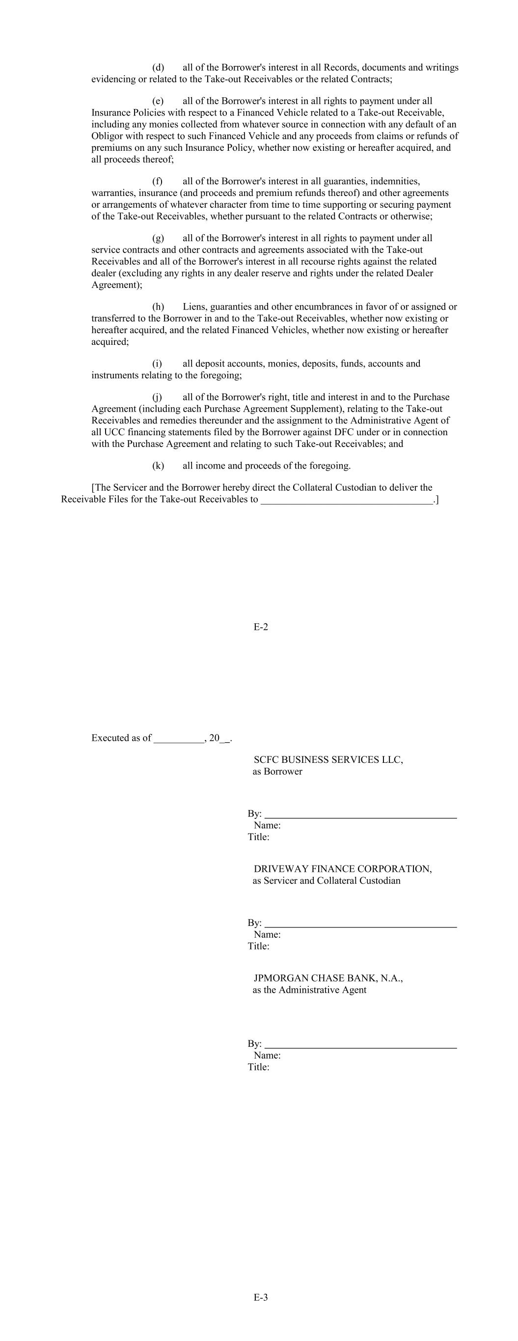 (d) all of the Borrower's interest in all Records, documents and writings evidencing or related to the Take-out Receivables or the related Contracts; (e) all of the Borrower's interest in all rights to payment under all Insurance Policies with respect to a Financed Vehicle related to a Take-out Receivable, including any monies collected from whatever source in connection with any default of an Obligor with respect to such Financed Vehicle and any proceeds from claims or refunds of premiums on any such Insurance Policy, whether now existing or hereafter acquired, and all proceeds thereof; (f) all of the Borrower's interest in all guaranties, indemnities, warranties, insurance (and proceeds and premium refunds thereof) and other agreements or arrangements of whatever character from time to time supporting or securing payment of the Take-out Receivables, whether pursuant to the related Contracts or otherwise; (g) all of the Borrower's interest in all rights to payment under all service contracts and other contracts and agreements associated with the Take-out Receivables and all of the Borrower's interest in all recourse rights against the related dealer (excluding any rights in any dealer reserve and rights under the related Dealer Agreement); (h) Liens, guaranties and other encumbrances in favor of or assigned or transferred to the Borrower in and to the Take-out Receivables, whether now existing or hereafter acquired, and the related Financed Vehicles, whether now existing or hereafter acquired; (i) all deposit accounts, monies, deposits, funds, accounts and instruments relating to the foregoing; (j) all of the Borrower's right, title and interest in and to the Purchase Agreement (including each Purchase Agreement Supplement), relating to the Take-out Receivables and remedies thereunder and the assignment to the Administrative Agent of all UCC financing statements filed by the Borrower against DFC under or in connection with the Purchase Agreement and relating to such Take-out Receivables; and (k) all income and proceeds of the foregoing. [The Servicer and the Borrower hereby direct the Collateral Custodian to deliver the Receivable Files for the Take-out Receivables to __________________________________.] E-2 Executed as of __________, 20_ . SCFC BUSINESS SERVICES LLC, as Borrower By: Name: Title: DRIVEWAY FINANCE CORPORATION, as Servicer and Collateral Custodian By: Name: Title: JPMORGAN CHASE BANK, N.A., as the Administrative Agent By: Name: Title: E-3