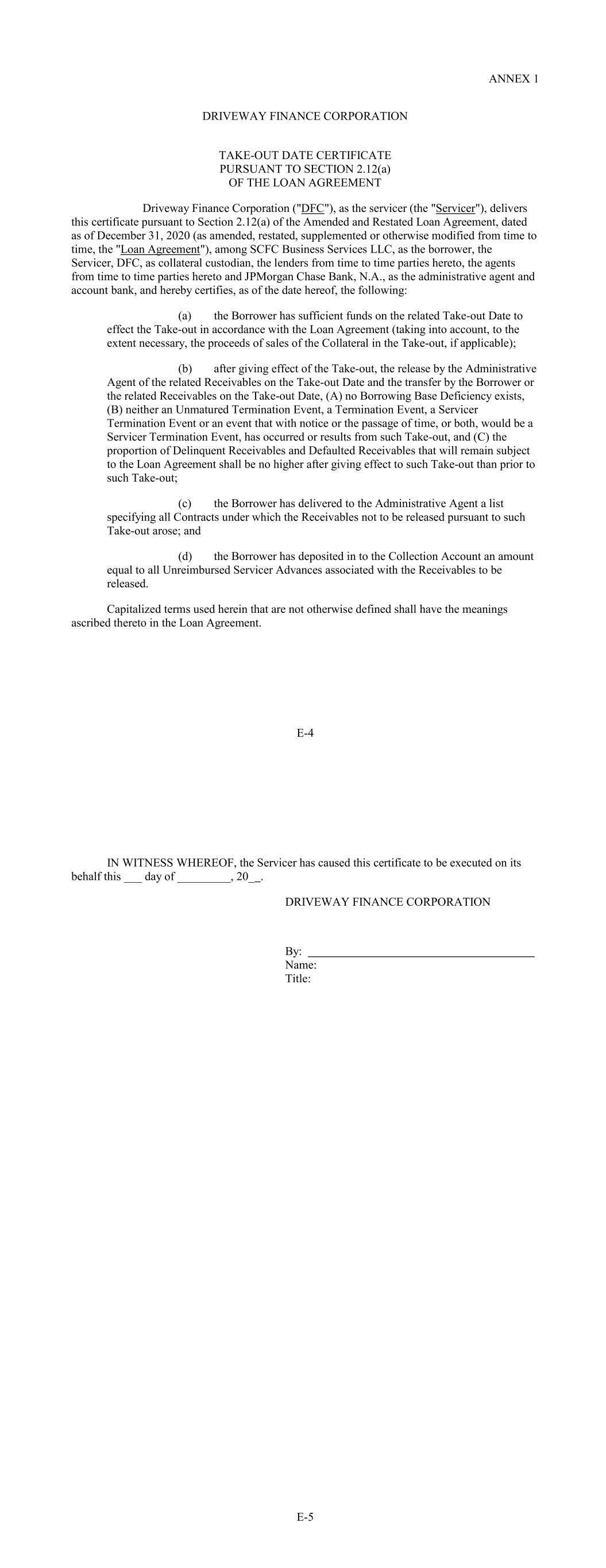 ANNEX 1 DRIVEWAY FINANCE CORPORATION TAKE-OUT DATE CERTIFICATE PURSUANT TO SECTION 2.12(a) OF THE LOAN AGREEMENT Driveway Finance Corporation ("DFC"), as the servicer (the "Servicer"), delivers this certificate pursuant to Section 2.12(a) of the Amended and Restated Loan Agreement, dated as of December 31, 2020 (as amended, restated, supplemented or otherwise modified from time to time, the "Loan Agreement"), among SCFC Business Services LLC, as the borrower, the Servicer, DFC, as collateral custodian, the lenders from time to time parties hereto, the agents from time to time parties hereto and JPMorgan Chase Bank, N.A., as the administrative agent and account bank, and hereby certifies, as of the date hereof, the following: (a) the Borrower has sufficient funds on the related Take-out Date to effect the Take-out in accordance with the Loan Agreement (taking into account, to the extent necessary, the proceeds of sales of the Collateral in the Take-out, if applicable); (b) after giving effect of the Take-out, the release by the Administrative Agent of the related Receivables on the Take-out Date and the transfer by the Borrower or the related Receivables on the Take-out Date, (A) no Borrowing Base Deficiency exists, (B) neither an Unmatured Termination Event, a Termination Event, a Servicer Termination Event or an event that with notice or the passage of time, or both, would be a Servicer Termination Event, has occurred or results from such Take-out, and (C) the proportion of Delinquent Receivables and Defaulted Receivables that will remain subject to the Loan Agreement shall be no higher after giving effect to such Take-out than prior to such Take-out; (c) the Borrower has delivered to the Administrative Agent a list specifying all Contracts under which the Receivables not to be released pursuant to such Take-out arose; and (d) the Borrower has deposited in to the Collection Account an amount equal to all Unreimbursed Servicer Advances associated with the Receivables to be released. Capitalized terms used herein that are not otherwise defined shall have the meanings ascribed thereto in the Loan Agreement. E-4 IN WITNESS WHEREOF, the Servicer has caused this certificate to be executed on its behalf this ___ day of _________, 20_ . DRIVEWAY FINANCE CORPORATION By: Name: Title: E-5