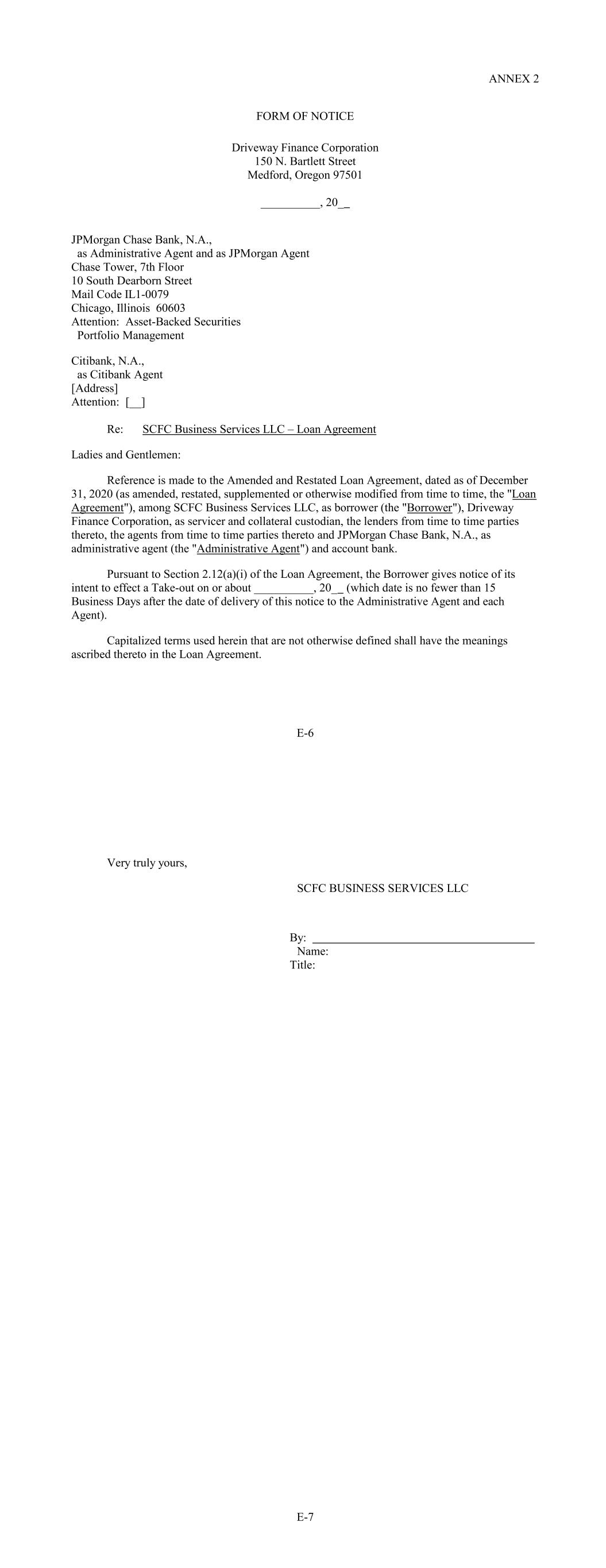 ANNEX 2 FORM OF NOTICE Driveway Finance Corporation 150 N. Bartlett Street Medford, Oregon 97501 __________, 20_ JPMorgan Chase Bank, N.A., as Administrative Agent and as JPMorgan Agent Chase Tower, 7th Floor 10 South Dearborn Street Mail Code IL1-0079 Chicago, Illinois 60603 Attention: Asset-Backed Securities Portfolio Management Citibank, N.A., as Citibank Agent [Address] Attention: [__] Re: SCFC Business Services LLC – Loan Agreement Ladies and Gentlemen: Reference is made to the Amended and Restated Loan Agreement, dated as of December 31, 2020 (as amended, restated, supplemented or otherwise modified from time to time, the "Loan Agreement"), among SCFC Business Services LLC, as borrower (the "Borrower"), Driveway Finance Corporation, as servicer and collateral custodian, the lenders from time to time parties thereto, the agents from time to time parties thereto and JPMorgan Chase Bank, N.A., as administrative agent (the "Administrative Agent") and account bank. Pursuant to Section 2.12(a)(i) of the Loan Agreement, the Borrower gives notice of its intent to effect a Take-out on or about __________, 20_ (which date is no fewer than 15 Business Days after the date of delivery of this notice to the Administrative Agent and each Agent). Capitalized terms used herein that are not otherwise defined shall have the meanings ascribed thereto in the Loan Agreement. E-6 Very truly yours, SCFC BUSINESS SERVICES LLC By: Name: Title: E-7