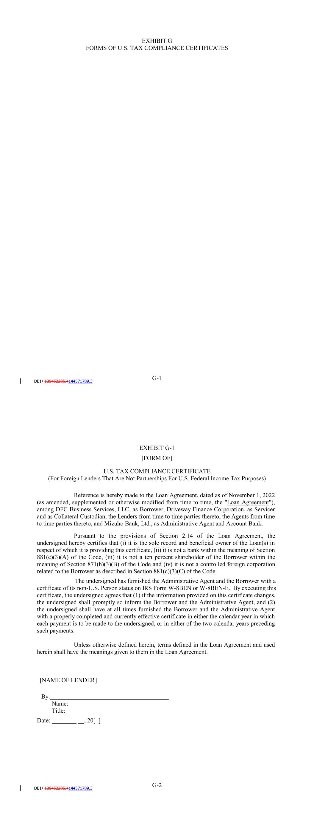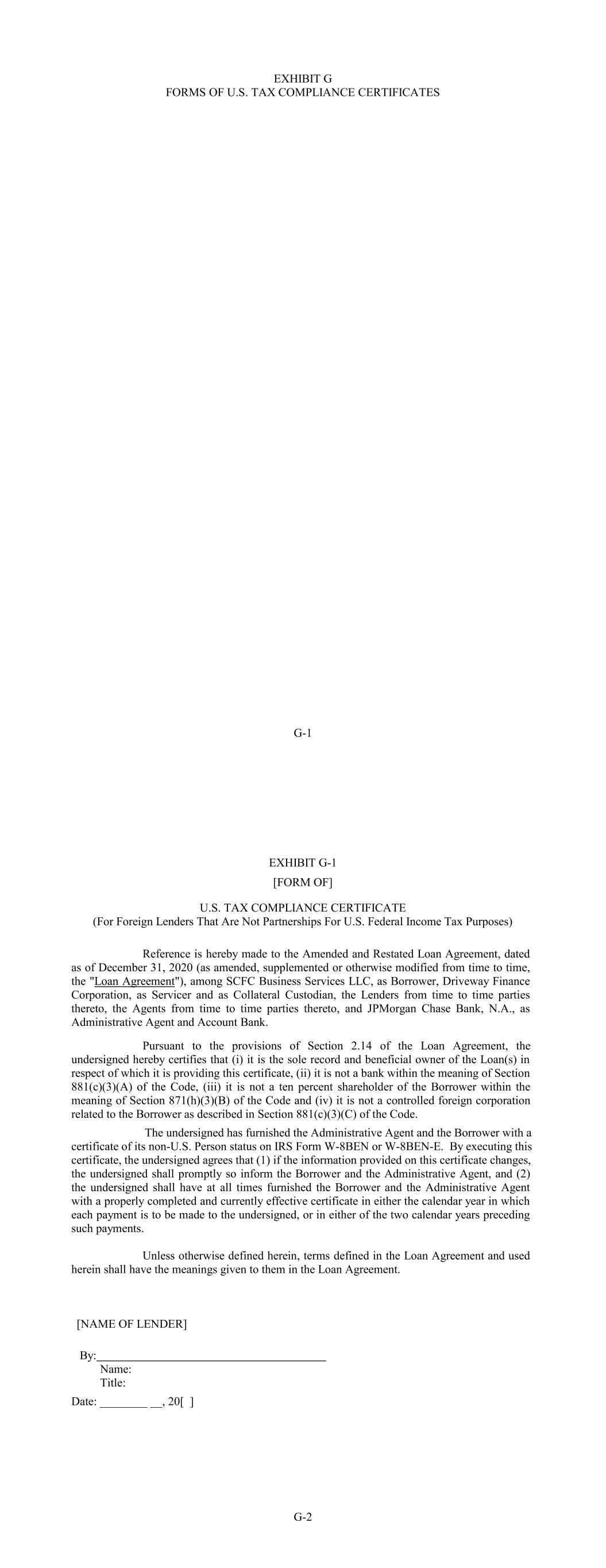 EXHIBIT G FORMS OF U.S. TAX COMPLIANCE CERTIFICATES G-1 G-2 [NAME OF LENDER] Name: EXHIBIT G-1 [FORM OF] U.S. TAX COMPLIANCE CERTIFICATE (For Foreign Lenders That Are Not Partnerships For U.S. Federal Income Tax Purposes) Reference is hereby made to the Amended and Restated Loan Agreement, dated as of December 31, 2020 (as amended, supplemented or otherwise modified from time to time, the "Loan Agreement"), among SCFC Business Services LLC, as Borrower, Driveway Finance Corporation, as Servicer and as Collateral Custodian, the Lenders from time to time parties thereto, the Agents from time to time parties thereto, and JPMorgan Chase Bank, N.A., as Administrative Agent and Account Bank. Pursuant to the provisions of Section 2.14 of the Loan Agreement, the undersigned hereby certifies that (i) it is the sole record and beneficial owner of the Loan(s) in respect of which it is providing this certificate, (ii) it is not a bank within the meaning of Section 881(c)(3)(A) of the Code, (iii) it is not a ten percent shareholder of the Borrower within the meaning of Section 871(h)(3)(B) of the Code and (iv) it is not a controlled foreign corporation related to the Borrower as described in Section 881(c)(3)(C) of the Code. The undersigned has furnished the Administrative Agent and the Borrower with a certificate of its non-U.S. Person status on IRS Form W-8BEN or W-8BEN-E. By executing this certificate, the undersigned agrees that (1) if the information provided on this certificate changes, the undersigned shall promptly so inform the Borrower and the Administrative Agent, and (2) the undersigned shall have at all times furnished the Borrower and the Administrative Agent with a properly completed and currently effective certificate in either the calendar year in which each payment is to be made to the undersigned, or in either of the two calendar years preceding such payments. Unless otherwise defined herein, terms defined in the Loan Agreement and used herein shall have the meanings given to them in the Loan Agreement. Title: By: Date: ________ __, 20[ ]