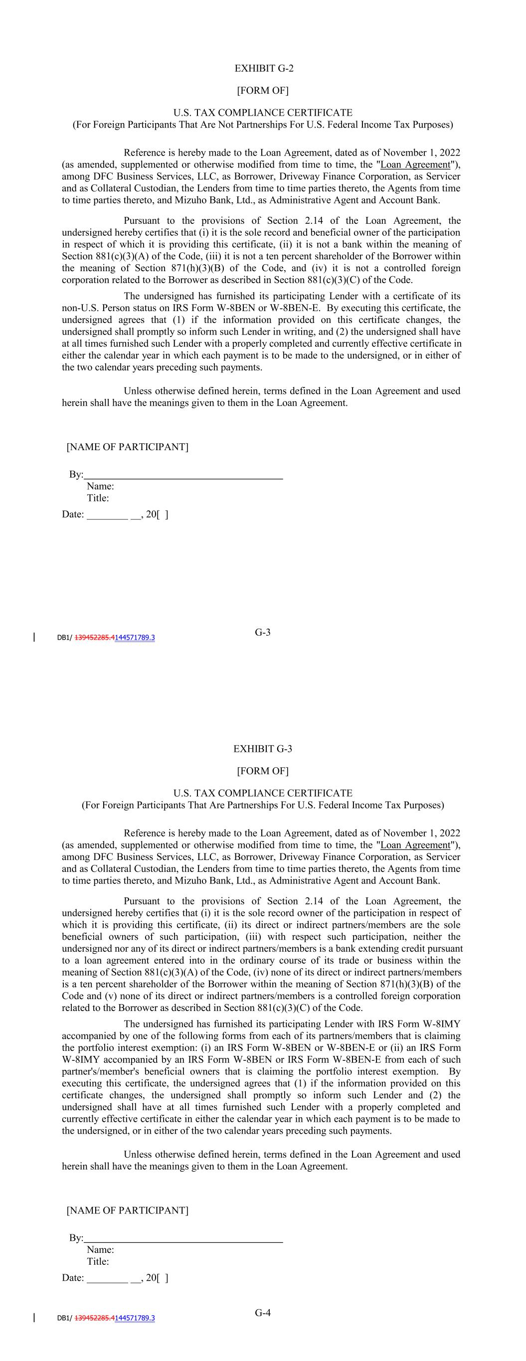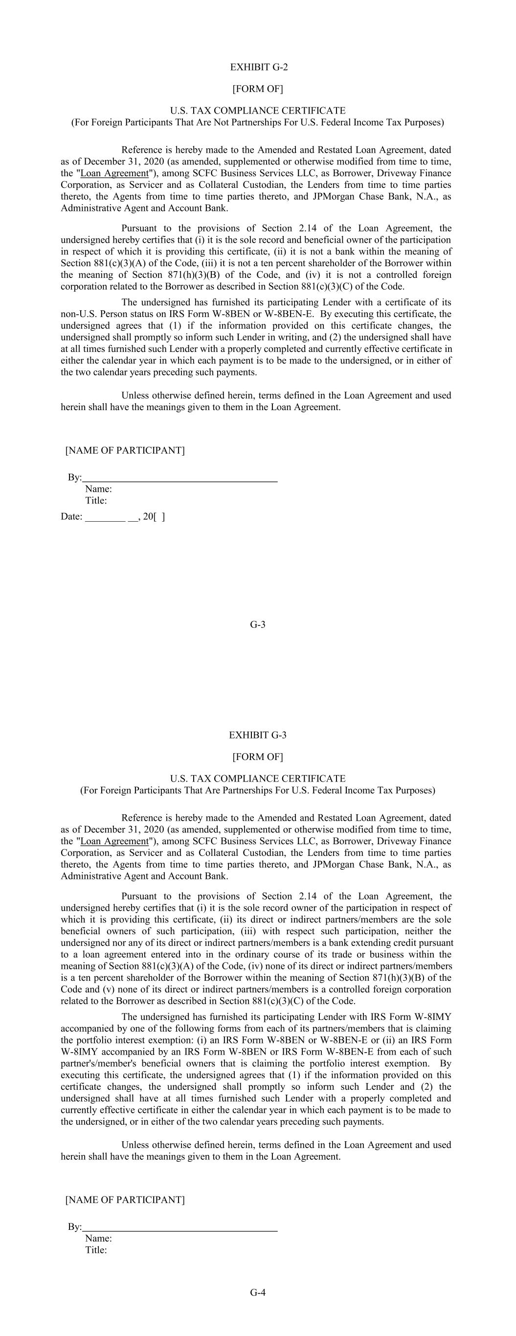G-3 [NAME OF PARTICIPANT] Name: EXHIBIT G-2 [FORM OF] U.S. TAX COMPLIANCE CERTIFICATE (For Foreign Participants That Are Not Partnerships For U.S. Federal Income Tax Purposes) Reference is hereby made to the Amended and Restated Loan Agreement, dated as of December 31, 2020 (as amended, supplemented or otherwise modified from time to time, the "Loan Agreement"), among SCFC Business Services LLC, as Borrower, Driveway Finance Corporation, as Servicer and as Collateral Custodian, the Lenders from time to time parties thereto, the Agents from time to time parties thereto, and JPMorgan Chase Bank, N.A., as Administrative Agent and Account Bank. Pursuant to the provisions of Section 2.14 of the Loan Agreement, the undersigned hereby certifies that (i) it is the sole record and beneficial owner of the participation in respect of which it is providing this certificate, (ii) it is not a bank within the meaning of Section 881(c)(3)(A) of the Code, (iii) it is not a ten percent shareholder of the Borrower within the meaning of Section 871(h)(3)(B) of the Code, and (iv) it is not a controlled foreign corporation related to the Borrower as described in Section 881(c)(3)(C) of the Code. The undersigned has furnished its participating Lender with a certificate of its non-U.S. Person status on IRS Form W-8BEN or W-8BEN-E. By executing this certificate, the undersigned agrees that (1) if the information provided on this certificate changes, the undersigned shall promptly so inform such Lender in writing, and (2) the undersigned shall have at all times furnished such Lender with a properly completed and currently effective certificate in either the calendar year in which each payment is to be made to the undersigned, or in either of the two calendar years preceding such payments. Unless otherwise defined herein, terms defined in the Loan Agreement and used herein shall have the meanings given to them in the Loan Agreement. Title: By: Date: ________ __, 20[ ] G-4 [NAME OF PARTICIPANT] Name: EXHIBIT G-3 [FORM OF] U.S. TAX COMPLIANCE CERTIFICATE (For Foreign Participants That Are Partnerships For U.S. Federal Income Tax Purposes) Reference is hereby made to the Amended and Restated Loan Agreement, dated as of December 31, 2020 (as amended, supplemented or otherwise modified from time to time, the "Loan Agreement"), among SCFC Business Services LLC, as Borrower, Driveway Finance Corporation, as Servicer and as Collateral Custodian, the Lenders from time to time parties thereto, the Agents from time to time parties thereto, and JPMorgan Chase Bank, N.A., as Administrative Agent and Account Bank. Pursuant to the provisions of Section 2.14 of the Loan Agreement, the undersigned hereby certifies that (i) it is the sole record owner of the participation in respect of which it is providing this certificate, (ii) its direct or indirect partners/members are the sole beneficial owners of such participation, (iii) with respect such participation, neither the undersigned nor any of its direct or indirect partners/members is a bank extending credit pursuant to a loan agreement entered into in the ordinary course of its trade or business within the meaning of Section 881(c)(3)(A) of the Code, (iv) none of its direct or indirect partners/members is a ten percent shareholder of the Borrower within the meaning of Section 871(h)(3)(B) of the Code and (v) none of its direct or indirect partners/members is a controlled foreign corporation related to the Borrower as described in Section 881(c)(3)(C) of the Code. The undersigned has furnished its participating Lender with IRS Form W-8IMY accompanied by one of the following forms from each of its partners/members that is claiming the portfolio interest exemption: (i) an IRS Form W-8BEN or W-8BEN-E or (ii) an IRS Form W-8IMY accompanied by an IRS Form W-8BEN or IRS Form W-8BEN-E from each of such partner's/member's beneficial owners that is claiming the portfolio interest exemption. By executing this certificate, the undersigned agrees that (1) if the information provided on this certificate changes, the undersigned shall promptly so inform such Lender and (2) the undersigned shall have at all times furnished such Lender with a properly completed and currently effective certificate in either the calendar year in which each payment is to be made to the undersigned, or in either of the two calendar years preceding such payments. Unless otherwise defined herein, terms defined in the Loan Agreement and used herein shall have the meanings given to them in the Loan Agreement. Title: By: