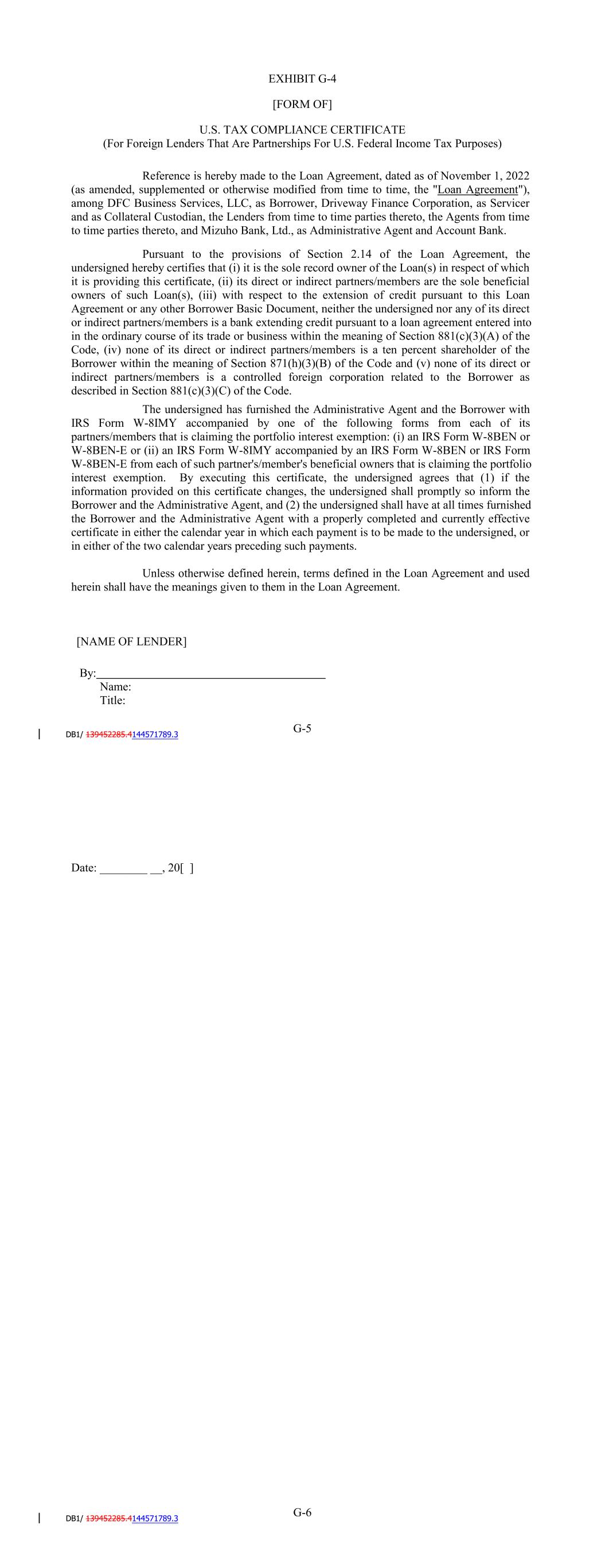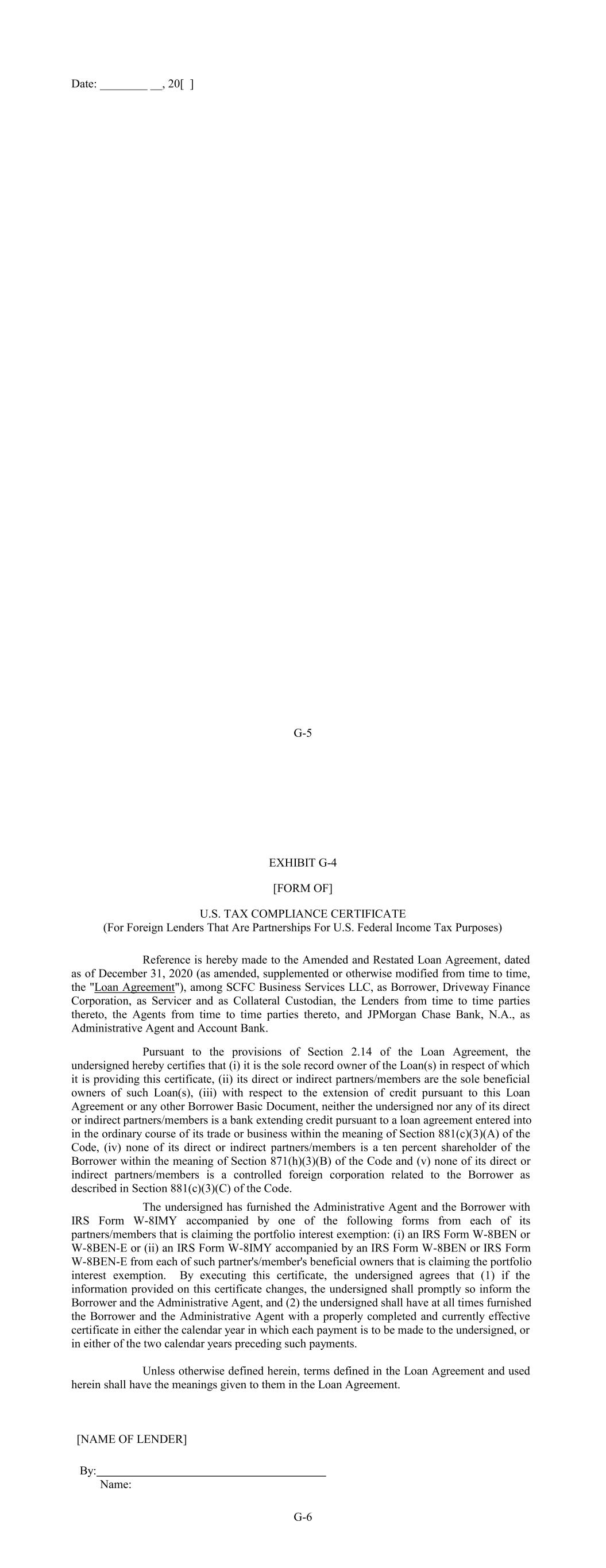 Date: ________ __, 20[ ] G-5 G-6 EXHIBIT G-4 [FORM OF] U.S. TAX COMPLIANCE CERTIFICATE (For Foreign Lenders That Are Partnerships For U.S. Federal Income Tax Purposes) Reference is hereby made to the Amended and Restated Loan Agreement, dated as of December 31, 2020 (as amended, supplemented or otherwise modified from time to time, the "Loan Agreement"), among SCFC Business Services LLC, as Borrower, Driveway Finance Corporation, as Servicer and as Collateral Custodian, the Lenders from time to time parties thereto, the Agents from time to time parties thereto, and JPMorgan Chase Bank, N.A., as Administrative Agent and Account Bank. Pursuant to the provisions of Section 2.14 of the Loan Agreement, the undersigned hereby certifies that (i) it is the sole record owner of the Loan(s) in respect of which it is providing this certificate, (ii) its direct or indirect partners/members are the sole beneficial owners of such Loan(s), (iii) with respect to the extension of credit pursuant to this Loan Agreement or any other Borrower Basic Document, neither the undersigned nor any of its direct or indirect partners/members is a bank extending credit pursuant to a loan agreement entered into in the ordinary course of its trade or business within the meaning of Section 881(c)(3)(A) of the Code, (iv) none of its direct or indirect partners/members is a ten percent shareholder of the Borrower within the meaning of Section 871(h)(3)(B) of the Code and (v) none of its direct or indirect partners/members is a controlled foreign corporation related to the Borrower as described in Section 881(c)(3)(C) of the Code. The undersigned has furnished the Administrative Agent and the Borrower with IRS Form W-8IMY accompanied by one of the following forms from each of its partners/members that is claiming the portfolio interest exemption: (i) an IRS Form W-8BEN or W-8BEN-E or (ii) an IRS Form W-8IMY accompanied by an IRS Form W-8BEN or IRS Form W-8BEN-E from each of such partner's/member's beneficial owners that is claiming the portfolio interest exemption. By executing this certificate, the undersigned agrees that (1) if the information provided on this certificate changes, the undersigned shall promptly so inform the Borrower and the Administrative Agent, and (2) the undersigned shall have at all times furnished the Borrower and the Administrative Agent with a properly completed and currently effective certificate in either the calendar year in which each payment is to be made to the undersigned, or in either of the two calendar years preceding such payments. Unless otherwise defined herein, terms defined in the Loan Agreement and used herein shall have the meanings given to them in the Loan Agreement. By: [NAME OF LENDER] Name: