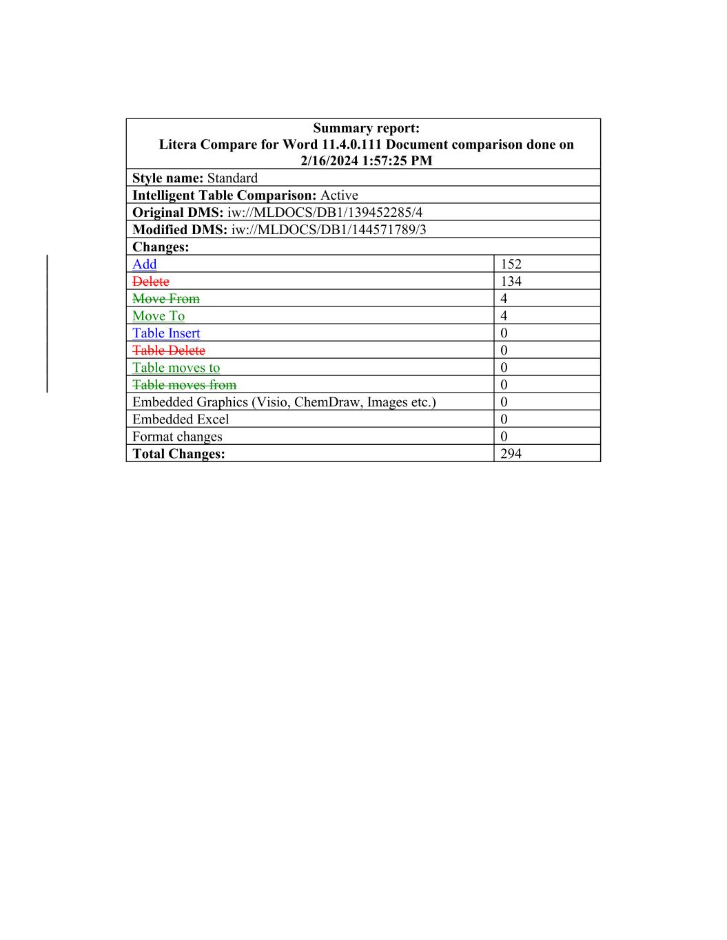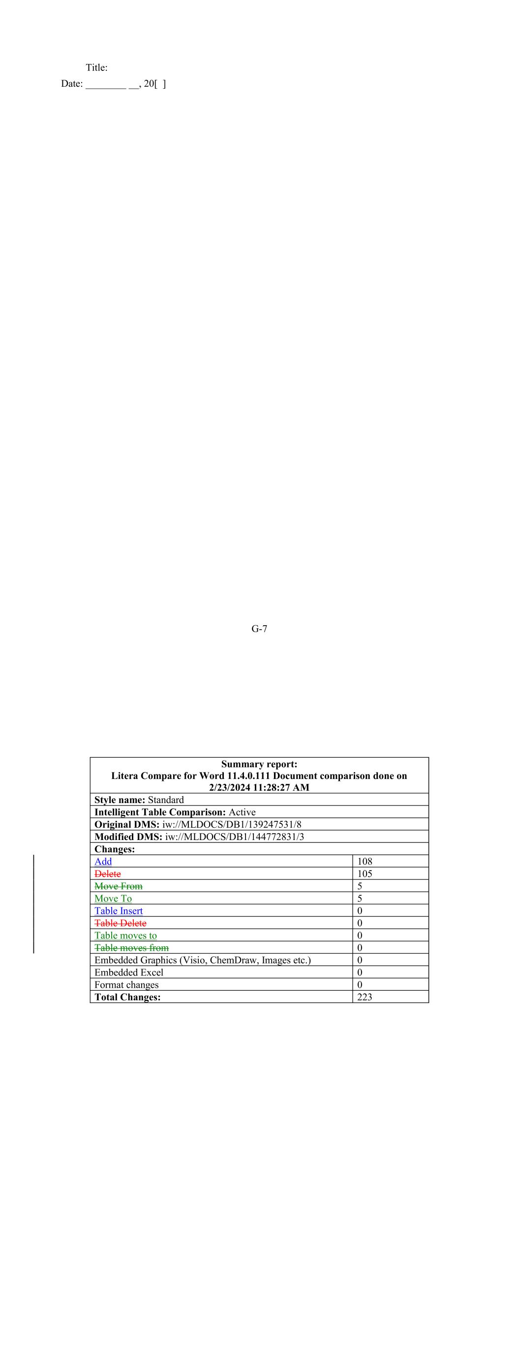 G-7 Title: Date: ________ __, 20[ ] 5 Table Insert Changes: 0 Table Delete 0 Add Intelligent Table Comparison: Active Table moves to 108 0 Summary report: Litera Compare for Word 11.4.0.111 Document comparison done on 2/23/2024 11:28:27 AM Table moves from 0 Delete Embedded Graphics (Visio, ChemDraw, Images etc.) 105 0 Original DMS: iw://MLDOCS/DB1/139247531/8 Embedded Excel 0 Move From Format changes 5 0 Total Changes: Modified DMS: iw://MLDOCS/DB1/144772831/3 223 Move To Style name: Standard