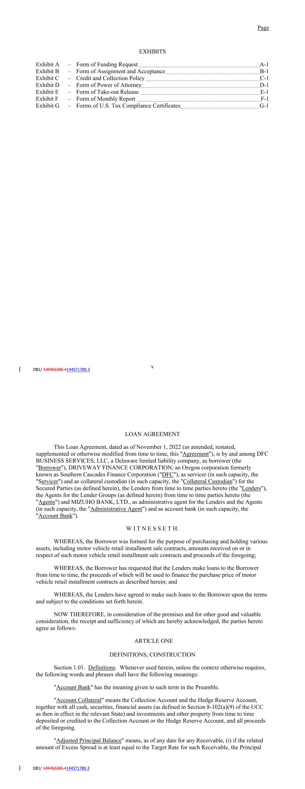 Page EXHIBITS Exhibit A – Form of Funding Request A-1 Exhibit B – Form of Assignment and Acceptance B-1 Exhibit C – Credit and Collection Policy C-1 Exhibit D – Form of Power of Attorney D-1 Exhibit E – Form of Take-out Release E-1 Exhibit F – Form of Monthly Report F-1 Exhibit G – Forms of U.S. Tax Compliance Certificates G-1 v AMENDED AND RESTATED LOAN AGREEMENT This Amended and Restated Loan Agreement, dated as of December 31, 2020 (as amended, restated, supplemented or otherwise modified from time to time, this "Agreement"), is among SCFC BUSINESS SERVICES LLC, a Delaware limited liability company, as borrower (the "Borrower"), DRIVEWAY FINANCE CORPORATION, an Oregon corporation formerly known as Southern Cascades Finance Corporation ("DFC"), as servicer (in such capacity, the "Servicer") and as collateral custodian (in such capacity, the "Collateral Custodian") for the Secured Parties (as defined herein), the Lenders from time to time parties hereto (the "Lenders"), the Agents for the Lender Groups (as defined herein) from time to time parties hereto (the "Agents") and JPMORGAN CHASE BANK, N.A., as administrative agent for the Lenders and the Agents (in such capacity, the "Administrative Agent") and as Account Bank. W I T N E S S E T H: WHEREAS, the Borrower was formed for the purpose of purchasing and holding various assets, including motor vehicle retail installment sale contracts, amounts received on or in respect of such motor vehicle retail installment sale contracts and proceeds of the foregoing; WHEREAS, the Borrower has requested that the Lenders make loans to the Borrower from time to time, the proceeds of which will be used to finance the purchase price of motor vehicle retail installment contracts as described herein; WHEREAS, the Lenders have agreed to make such loans to the Borrower upon the terms and subject to the conditions set forth herein; WHEREAS, the parties hereto are parties to that certain Loan Agreement, dated as of July 31, 2020 (as amended prior to the date hereof, the "Existing Loan Agreement") pursuant to which, among other things, the foregoing purposes are effected; and WHEREAS, the parties hereto wish to amend and restate the terms of the Existing Loan Agreement (but not to enter into a novation of the Existing Loan Agreement) by entry into this Agreement. NOW THEREFORE, in consideration of the premises and for other good and valuable consideration, the receipt and sufficiency of which are hereby acknowledged, the parties hereto agree as follows: ARTICLE ONE DEFINITIONS; CONSTRUCTION Section 1.01. Definitions. Whenever used herein, unless the context otherwise requires, the following words and phrases shall have the following meanings: