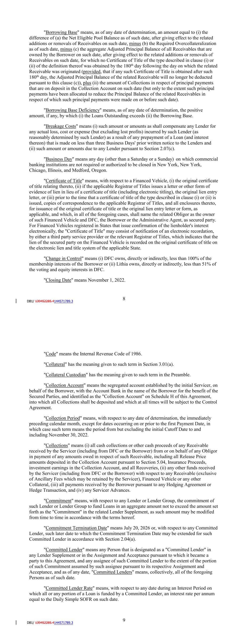 then-current Benchmark for all purposes hereunder and under any Basic Document in accordance with Section 2.17 and (ii) ending at the time that a Benchmark Replacement has replaced such then-current Benchmark for all purposes hereunder and under any Basic Document in accordance with Section 2.17. "Beneficial Ownership Certification" means a certification regarding beneficial ownership as required by the Beneficial Ownership Rule. "Beneficial Ownership Rule" means 31 C.F.R. § 1010.230. "Benefit Plan" means each (i) employee pension benefit plan (as defined in Section 3(2) of ERISA) that are subject to Title I of ERISA, (ii) plan described in Section 4975(e)(1) of the Code, including individual retirement accounts or Keogh Plans that are not exempt under Section 4975(g) of the Code and (iii) any entity whose underlying assets include "plan assets" (as defined in Section 3(42) of ERISA and Department of Labor Regulations Section 2510.3-101) by reason of an employee benefit plan's or plans' investment in such entities. "Borrower" has the meaning given to such term in the Preamble. "Borrower Basic Documents" means all Basic Documents to which the Borrower is a party or by which it is bound. "Borrower's Account" means the bank account of the Borrower, as notified to the Administrative Agent from time to time in writing by the Borrower,. "Borrowing Base" means, as of any date of determination, an amount equal to (i) the difference of (a) the Net Eligible Pool Balance as of such date, after giving effect to the related additions or removals of Receivables on such date, minus (b) the Required Overcollateralization as of such date, minus (c) the aggregate Adjusted Principal Balance of all Receivables that are owned by the Borrower on such date, after giving effect to the related additions or removals of Receivables on such date, for which no Certificate of Title of the type described in clause (i) or (ii) of the definition thereof was obtained by the 180th day following the day on which the related Receivable was originated (provided, that if any such Certificate of Title is obtained after such 180th day, the Adjusted Principal Balance of the related Receivable will no longer be deducted pursuant to this clause (c)), plus (ii) the amount of Collections in respect of principal payments that are on deposit in the Collection Account on such. "Borrowing Base Deficiency" means, as of any date of determination, the positive amount, if any, by which (i) the Loans Outstanding exceeds (ii) the Borrowing Base. "Breakage Costs" means (i) such amount or amounts as shall compensate any Lender for any actual loss, cost or expense (but excluding lost profits) incurred by such Lender (as reasonably determined by such Lender) as a result of any prepayment of a Loan (and interest thereon) that is made on less than three Business Days' prior written notice to the Lenders and (ii) such amount or amounts due to any Lender pursuant to Section 2.07(c). 8 "Business Day" means any day (other than a Saturday or a Sunday) on which commercial banking institutions are not required or authorized to be closed in New York, New York, Chicago, Illinois, and Medford, Oregon. "Certificate of Title" means, with respect to a Financed Vehicle, (i) the original certificate of title relating thereto, (ii) if the applicable Registrar of Titles issues a letter or other form of evidence of lien in lieu of a certificate of title (including electronic titling), the original lien entry letter, or (iii) prior to the time that a certificate of title of the type described in clause (i) or (ii) is issued, copies of correspondence to the applicable Registrar of Titles, and all enclosures thereto, for issuance of the original certificate of title or the original lien entry letter or form, as applicable, and which, in all of the foregoing cases, shall name the related Obligor as the owner of such Financed Vehicle and DFC, the Borrower or the Administrative Agent, as secured party (provided, that 'Southern Cascades Finance Corporation' may be named as secured party on the Certificates of Title relating to those Receivables that are listed on Schedule A to Amendment No. 4 to the Loan Agreement, dated February 8, 2022, by and among the Borrower, Chariot, as a Conduit Lender, and JPMorgan, as the Administrative Agent, a Committed Lender, and Agent for the JPMorgan Lender Group, and acknowledged and agreed to by the Servicer and Collateral Custodian). For Financed Vehicles registered in States that issue confirmation of the lienholder's interest electronically, the 'Certificate of Title' may consist of notification of an electronic recordation, by either a third party service provider or the relevant Registrar of Titles, which indicates that the lien of the secured party on the Financed Vehicle is recorded on the original certificate of title on the electronic lien and title system of the applicable State. "Change in Control" means (i) DFC owns, directly or indirectly, less than 100% of the membership interests of the Borrower or (ii) Lithia owns, directly or indirectly, less than 51% of the voting and equity interests in DFC. "Citibank Agent" means Citibank, N.A., in its capacity as Agent for the Citibank Lender Group, and its successors in such capacity. "Citibank Lender Group" means the group of Lenders consisting of (a) the Conduit Lenders identified on the Lender Supplement attached hereto as Schedule A-2, (b) the Committed Lender identified on the Lender Supplement attached hereto as Schedule A-2, and (c) the Citibank Agent. "Closing Date" means July 31, 2020. "Code" means the Internal Revenue Code of 1986. "Collateral" has the meaning given to such term in Section 3.01(a). "Collateral Custodian" has the meaning given to such term in the Preamble. "Collection Account" means a segregated account established by the initial Servicer, on behalf of the Borrower, with the Account Bank in the name of the Administrative Agent for the benefit of the Secured