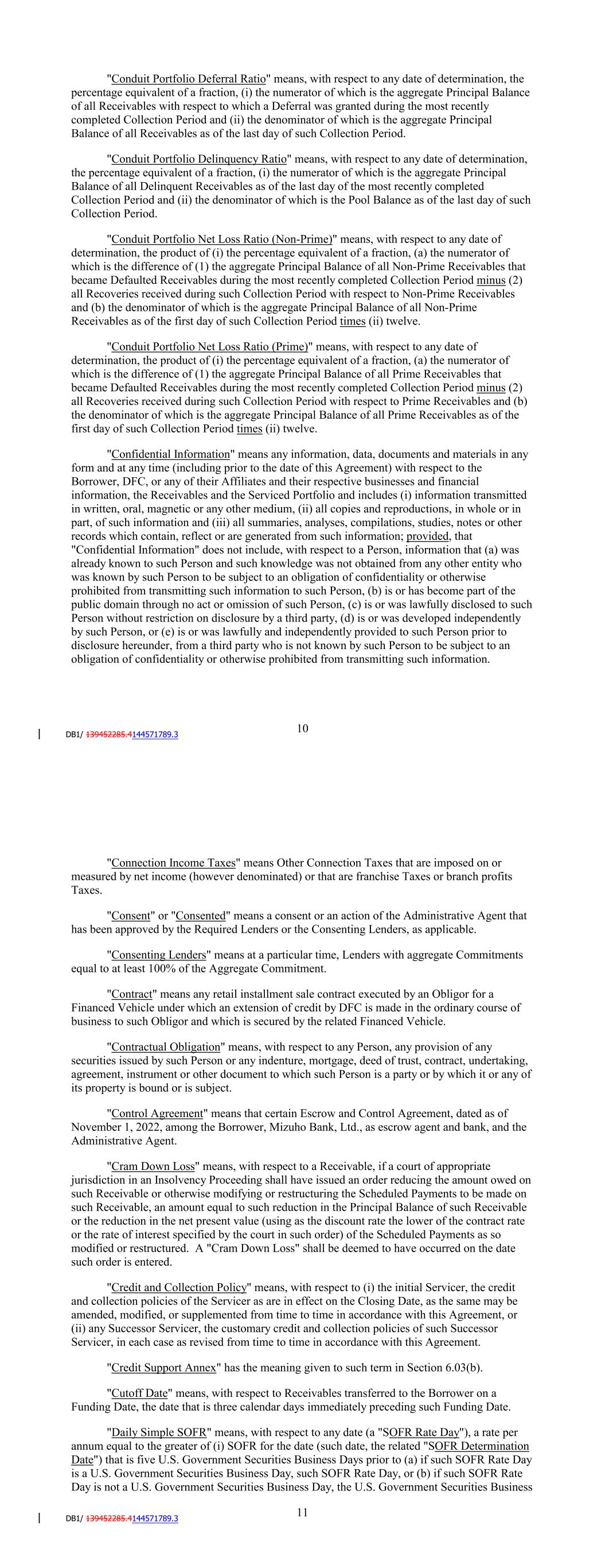 "Collection Period" means, with respect to any date of determination, the immediately preceding calendar month, except for dates occurring on or prior to the first Payment Date, in which case such term means the period from but excluding the initial Cutoff Date to and including August 31, 2020. "Collections" means (i) all cash collections or other cash proceeds of any Receivable received by the Servicer (including from DFC or the Borrower) from or on behalf of any Obligor in payment of any amounts owed in respect of such Receivable, including all Release Price amounts deposited in the Collection Account pursuant to Section 5.04, Insurance Proceeds, investment earnings in the Collection Account, and all Recoveries, (ii) any other funds received by the Servicer (including from DFC or the Borrower) with respect to any Receivable (exclusive of Ancillary Fees which may be retained by the Servicer), Financed Vehicle or any other Collateral, (iii) all payments received by the Borrower pursuant to any Hedging Agreement or Hedge Transaction, and (iv) any Servicer Advances. "Commercial Paper Notes" means any short-term promissory notes issued by a Conduit Lender with respect to financing any Loan hereunder. "Commitment" means, with respect to any Lender or Lender Group, the commitment of such Lender or Lender Group to fund Loans in an aggregate amount not to exceed the amount set forth as the "Commitment" in the related Lender Supplement, as such amount may be modified from time to time in accordance with the terms hereof. "Commitment Termination Date" means July 18, 2025 or, with respect to any Committed Lender, such later date to which the Commitment Termination Date may be extended for such Committed Lender in accordance with Section 2.04(a). "Committed Lender" means any Person that is designated as a "Committed Lender" in any Lender Supplement or in the Assignment and Acceptance pursuant to which it became a party to this Agreement, and any assignee of such Committed Lender to the extent of the portion of such Commitment assumed by such assignee pursuant to its respective Assignment and Acceptance, and as of any date, "Committed Lenders" means, collectively, all of the foregoing Persons as of such date. "Conduit Lender" means any Person that is designated as a "Conduit Lender" in any Lender Supplement or in the Assignment and Acceptance pursuant to which it became a party to this Agreement, and any assignee of such Conduit Lender to the extent of the portion of such Commitment assumed by such assignee pursuant to its respective Assignment and Acceptance, and as of any date, "Conduit Lenders" means, collectively, all of the foregoing Persons as of such date. "Conduit Portfolio Deferral Ratio" means, with respect to any date of determination, the percentage equivalent of a fraction, (i) the numerator of which is the aggregate Principal Balance of all Receivables with respect to which a Deferral was granted during the most recently completed Collection Period and (ii) the denominator of which is the aggregate Principal Balance of all Receivables as of the last day of such Collection Period. 10 "Conduit Portfolio Delinquency Ratio" means, with respect to any date of determination, the percentage equivalent of a fraction, (i) the numerator of which is the aggregate Principal Balance of all Delinquent Receivables as of the last day of the most recently completed Collection Period and (ii) the denominator of which is the Pool Balance as of the last day of such Collection Period. "Conduit Portfolio Net Loss Ratio (Non-Prime)" means, with respect to any date of determination, the product of (i) the percentage equivalent of a fraction, (a) the numerator of which is the difference of (1) the aggregate Principal Balance of all Non-Prime Receivables that became Defaulted Receivables during the most recently completed Collection Period minus (2) all Recoveries received during such Collection Period with respect to Non-Prime Receivables and (b) the denominator of which is the aggregate Principal Balance of all Non-Prime Receivables as of the last day of such Collection Period times (ii) twelve. "Conduit Portfolio Net Loss Ratio (Prime)" means, with respect to any date of determination, the product of (i) the percentage equivalent of a fraction, (a) the numerator of which is the difference of (1) the aggregate Principal Balance of all Prime Receivables that became Defaulted Receivables during the most recently completed Collection Period minus (2) all Recoveries received during such Collection Period with respect to Prime Receivables and (b) the denominator of which is the aggregate Principal Balance of all Prime Receivables as of the last day of such Collection Period times (ii) twelve. "Confidential Information" means any information, data, documents and materials in any form and at any time (including prior to the date of this Agreement) with respect to the Borrower, DFC, or any of their Affiliates and their respective businesses and financial information, the Receivables and the Serviced Portfolio and includes (i) information transmitted in written, oral, magnetic or any other medium, (ii) all copies and reproductions, in whole or in part, of such information and (iii) all summaries, analyses, compilations, studies, notes or other records which contain, reflect or are generated from such information; provided, that "Confidential Information" does not include, with respect to a Person, information that (a) was already known to such Person and such knowledge was not obtained from any other entity who was known by such Person to be subject to an obligation of confidentiality or otherwise prohibited from transmitting such information to such Person, (b) is or has become part of the public domain through no act or omission of such Person, (c) is or was lawfully disclosed to such Person without restriction on disclosure by a third party, (d) is or was developed independently by such Person, or (e) is or was law