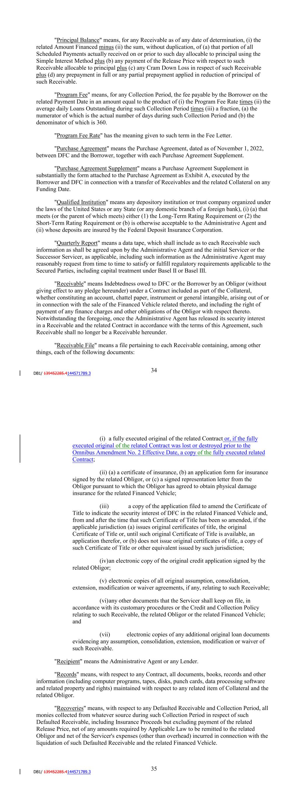"Person" means an individual, partnership, corporation, trust (including a business or statutory trust), limited liability company, joint stock company, unincorporated association, sole proprietorship, joint venture, government (or any agency or political subdivision thereof) or other entity. "Plan Event" means the occurrence of any of the following: (i) a notice of intent to terminate a Pension Plan has been filed; (ii) a Pension Plan termination under Section 4041(f) of ERISA; (iii) the Pension Benefit Guaranty Corporation institutes proceedings to terminate, or appoint a trustee to administer any Pension Plan; or (iv) the occurrence of an event or existence of any condition that might constitute grounds under Section 4042 of ERISA for the termination of, or the appointment of a trustee to administer, a Pension Plan. "Pool Balance" means, as of any date of determination, the sum of the Adjusted Principal Balances of all Receivables as of such date. "Posted Collateral" has the meaning given to such term in Section 6.03(b). "Prime Rate" means the rate of interest last quoted by The Wall Street Journal as the 'Prime Rate' in the U.S. or, if The Wall Street Journal ceases to quote such rate, the highest per annum interest rate published by the Federal Reserve Board in Federal Reserve Statistical Release H.15 (519) (Selected Interest Rates) as the 'bank prime loan' rate or, if such rate is no longer quoted therein, any similar rate quoted therein (as determined by the Administrative Agent) or any similar release by the Federal Reserve Board (as determined by the Administrative Agent). Each change in the Prime Rate shall be effective from and including the date such change is publicly announced or quoted as being effective. "Prime Receivable" means a Receivable (other thanincluding an Online Originated Receivable) for which, at the time of underwriting, the related FICO Score was 700 or greater. “Prime Receivable Collateral Percentage” means, as of any date of determination, a fraction, expressed as a percentage, the numerator of which is the aggregate Adjusted Principal Balances of all Prime Receivables on such date and the denominator of which is the Pool Balance on such date. "Prime Serviced Portfolio Receivable" means a Serviced Portfolio Receivable (other than a Serviced Portfolio Receivable originated via the Online Platform) for which, at the time of underwriting, the related FICO Score was 700 or greater. "Principal Amount" means, with respect to any Loan, the aggregate amount advanced by the Lenders on the Funding Date in respect of such Loan. "Principal Balance" means, for any Receivable as of any date of determination, (i) the related Amount Financed minus the sum, without duplication, of (a) that portion of all Scheduled Payments actually received on or prior to such day allocable to principal using the Simple Interest Method plus (b) any payment of the Release Price with respect to such Receivable allocable to principal plus (c) any Cram Down Loss in respect of such Receivable plus (d) any 36 prepayment in full or any partial prepayment applied in reduction of principal of such Receivable. "Purchase Agreement" means the Amended and Restated Purchase Agreement, dated as of December 31, 2020, between DFC and the Borrower, together with each Purchase Agreement Supplement. "Purchase Agreement Supplement" means a Purchase Agreement Supplement in substantially the form attached to the Purchase Agreement as Exhibit A, executed by the Borrower and DFC in connection with a transfer of Receivables and the related Collateral on any Funding Date. "Qualified Institution" means any depository institution or trust company organized under the laws of the United States or any State (or any domestic branch of a foreign bank), (i) (a) that meets (or the parent of which meets) either (1) the Long-Term Rating Requirement or (2) the Short-Term Rating Requirement or (b) is otherwise acceptable to the Administrative Agent and the Required Lenders and (ii) whose deposits are insured by the Federal Deposit Insurance Corporation. "Quarterly Report" means a data tape, which shall include as to each Receivable such information as shall be agreed upon by the Administrative Agent and the initial Servicer or the Successor Servicer, as applicable, including such information as the Administrative Agent may reasonably request from time to time to satisfy or fulfill regulatory requirements applicable to the Secured Parties, including capital treatment under Basel II or Basel III. "Receivable" means Indebtedness owed to DFC or the Borrower by an Obligor (without giving effect to any pledge hereunder) under a Contract included as part of the Collateral, whether constituting an account, chattel paper, instrument or general intangible, arising out of or in connection with the sale of the Financed Vehicle related thereto, and including the right of payment of any finance charges and other obligations of the Obligor with respect thereto. Notwithstanding the foregoing, once the Administrative Agent has released its security interest in a Receivable and the related Contract in accordance with the terms of this Agreement, such Receivable shall no longer be a Receivable hereunder. "Receivable File" means a file pertaining to each Receivable containing, among other things, each of the following documents: (i) a fully executed original of the related Contract; (ii) (a) a certificate of insurance, (b) an application form for insurance signed by the related Obligor, or (c) a signed representation letter from the Obligor pursuant to which the Obligor has agreed to obtain physical damage insurance for the related Financed Vehicle; (iii) a copy of the application filed to amend the Certificate of Title to indicate the security interest of DFC in the related Financed Vehicle and, from and after the time that such Certificate of Title has been so amended, if the applicable jurisdiction (a) issues original certificates of title, 