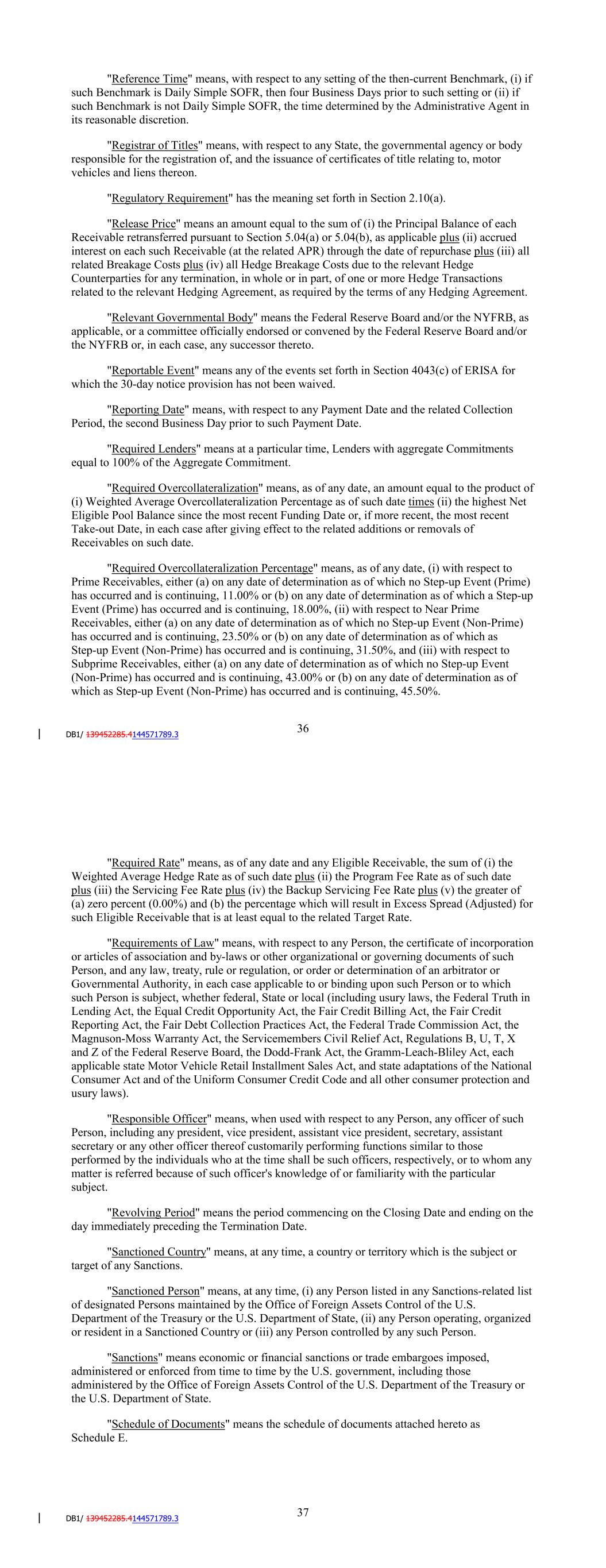 Certificate of Title or, until such original Certificate of Title is available, an application therefor, or (b) does not issue original certificates of title, a copy of such Certificate of Title or other equivalent issued by such jurisdiction; (iv) an electronic copy of the original credit application signed by the related Obligor; (v) electronic copies of all original assumption, consolidation, extension, modification or waiver agreements, if any, relating to such Receivable; (vi) any other documents that the Servicer shall keep on file, in accordance with its customary procedures or the Credit and Collection Policy relating to such Receivable, the related Obligor or the related Financed Vehicle; and (vii) electronic copies of any additional original loan documents evidencing any assumption, consolidation, extension, modification or waiver of such Receivable. "Recipient" means the Administrative Agent or any Lender. "Records" means, with respect to any Contract, all documents, books, records and other information (including computer programs, tapes, disks, punch cards, data processing software and related property and rights) maintained with respect to any related item of Collateral and the related Obligor. "Recoveries" means, with respect to any Defaulted Receivable and Collection Period, all monies collected from whatever source during such Collection Period in respect of such Defaulted Receivable, including Insurance Proceeds but excluding payment of the related Release Price, net of any amounts required by Applicable Law to be remitted to the related Obligor and net of the Servicer's expenses (other than overhead) incurred in connection with the liquidation of such Defaulted Receivable and the related Financed Vehicle. "Reference Time" means, with respect to any setting of the then-current Benchmark, (i) if such Benchmark is Daily Simple SOFR, then four Business Days prior to such setting or (ii) if such Benchmark is not Daily Simple SOFR, the time determined by the Administrative Agent in its reasonable discretion. "Registrar of Titles" means, with respect to any State, the governmental agency or body responsible for the registration of, and the issuance of certificates of title relating to, motor vehicles and liens thereon. "Regulatory Requirement" has the meaning set forth in Section 2.10(a). "Release Price" means an amount equal to the sum of (i) the Principal Balance of each Receivable retransferred pursuant to Section 5.04(a) or 5.04(b), as applicable plus (ii) accrued interest on each such Receivable (at the related APR) through the date of repurchase plus (iii) all related Breakage Costs plus (iv) all Hedge Breakage Costs due to the relevant Hedge 38 Counterparties for any termination, in whole or in part, of one or more Hedge Transactions related to the relevant Hedging Agreement, as required by the terms of any Hedging Agreement. "Relevant Governmental Body" means the Federal Reserve Board and/or the NYFRB, as applicable, or a committee officially endorsed or convened by the Federal Reserve Board and/or the NYFRB or, in each case, any successor thereto. "Reportable Event" means any of the events set forth in Section 4043(c) of ERISA for which the 30-day notice provision has not been waived. "Reporting Date" means, with respect to any Payment Date and the related Collection Period, the second Business Day prior to such Payment Date. "Required Lenders" means at a particular time, Lenders with aggregate Commitments equal to 100% of the Aggregate Commitment. "Required Overcollateralization" means, as of any date, an amount equal to the product of (i) Weighted Average Overcollateralization Percentage as of such date times (ii) the highest Net Eligible Pool Balance since the most recent Funding Date or, if more recent, the most recent Take-out Date, in each case after giving effect to the related additions or removals of Receivables on such date. "Required Overcollateralization Percentage" means, as of any date, (i) with respect to Prime Receivables, either (a) on any date of determination as of which no Step-up Event (Prime) has occurred and is continuing, 13.00% or (b) on any date of determination as of which a Step-up Event (Prime) has occurred and is continuing, 18.00% and (ii) with respect to Non-Prime Receivables, either (a) on any date of determination as of which no Step-up Event (Non-Prime) has occurred and is continuing, 24.00% or (b) on any date of determination as of which as Step-up Event (Non-Prime) has occurred and is continuing, 29.00%. "Required Rate" means, as of any date and any Eligible Receivable, the sum of (i) the Weighted Average Hedge Rate as of such date plus (ii) the Applicable Margin as of such date plus (iii) the Servicing Fee Rate plus (iv) the Backup Servicing Fee Rate plus (v) the greater of (a) zero percent (0.00%) and (b) the percentage which will result in Excess Spread (Adjusted) that is at least equal to the related Target Rate. "Requirements of Law" means, with respect to any Person, the certificate of incorporation or articles of association and by-laws or other organizational or governing documents of such Person, and any law, treaty, rule or regulation, or order or determination of an arbitrator or Governmental Authority, in each case applicable to or binding upon such Person or to which such Person is subject, whether federal, State or local (including usury laws, the Federal Truth in Lending Act, the Equal Credit Opportunity Act, the Fair Credit Billing Act, the Fair Credit Reporting Act, the Fair Debt Collection Practices Act, the Federal Trade Commission Act, the Magnuson-Moss Warranty Act, the Servicemembers Civil Relief Act, Regulations B, U, T, X and Z of the Federal Reserve Board, the Dodd-Frank Act, the Gramm-Leach-Bliley Act, each applicable state Motor Vehicle Retail Installment Sales Act, and state adaptations of the National 39