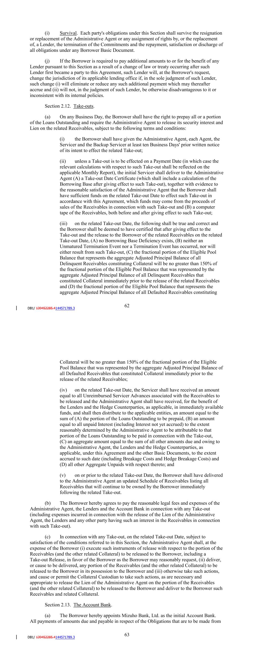 shall repay to such indemnified party the amount paid over pursuant to this paragraph (h) (plus any penalties, interest or other charges imposed by the relevant Governmental Authority) in the event that such indemnified party is required to repay such refund to such Governmental Authority. Notwithstanding anything to the contrary in this paragraph (h), in no event will the indemnified party be required to pay any amount to an indemnifying party pursuant to this paragraph (h) the payment of which would place the indemnified party in a less favorable net after-Tax position than the indemnified party would have been in if the Tax subject to indemnification and giving rise to such refund had not been deducted, withheld or otherwise imposed and the indemnification payments or additional amounts with respect to such Tax had never been paid. This paragraph shall not be construed to require any indemnified party to make available its Tax returns (or any other information relating to its Taxes that it deems confidential) to the indemnifying party or any other Person (i) Survival. Each party's obligations under this Section shall survive the resignation or replacement of the Administrative Agent or any assignment of rights by, or the replacement of, a Lender, the termination of the Commitments and the repayment, satisfaction or discharge of all obligations under any Borrower Basic Document. (j) If the Borrower is required to pay additional amounts to or for the benefit of any Lender or Credit Provider pursuant to this Section as a result of a change of law or treaty occurring after such Lender or Credit Provider first became a party to this Agreement, such Lender or Credit Provider will, at the Borrower's request, change the jurisdiction of its applicable lending office if, in the sole judgment of such Lender or Credit Provider, such change (i) will eliminate or reduce any such additional payment which may thereafter accrue and (ii) will not, in the judgment of such Lender or Credit Provider, be otherwise disadvantageous to it or inconsistent with its internal policies. Section 2.12. Take-outs. On any Business Day, the Borrower shall have the right to prepay all or a portion of the Loans Outstanding and require the Administrative Agent to release its security interest and Lien on the related Receivables, subject to the following terms and conditions: (i) the Borrower shall have given the Administrative Agent (who will notify each Agent), the Servicer and the Backup Servicer at least ten Business Days' prior written notice of its intent to effect the related Take-out; (ii) unless a Take-out is to be effected on a Payment Date (in which case the relevant calculations with respect to such Take-out shall be reflected on the applicable Monthly Report), the initial Servicer shall deliver to the Administrative Agent (A) a Take-out Date Certificate (which shall include a calculation of the Borrowing Base after giving effect to such Take-out), together with evidence to the reasonable satisfaction of the Administrative Agent that the Borrower shall have sufficient funds on the related Take-out Date to effect such Take-out in accordance with this Agreement, which funds may come from the proceeds of sales of the Receivables in connection with such Take-out and (B) a computer tape of the Receivables, both before and after giving effect to such Take-out; 66 (iii) on the related Take-out Date, the following shall be true and correct and the Borrower shall be deemed to have certified that after giving effect to the Take-out and the release to the Borrower of the related Receivables on the related Take-out Date, (A) no Borrowing Base Deficiency exists, (B) neither an Unmatured Termination Event nor a Termination Event has occurred, nor will either result from such Take-out, (C) the fractional portion of the Eligible Pool Balance that represents the aggregate Adjusted Principal Balance of all Delinquent Receivables constituting Collateral will be no greater than 175% of the fractional portion of the Eligible Pool Balance that was represented by the aggregate Adjusted Principal Balance of all Delinquent Receivables that constituted Collateral immediately prior to the release of the related Receivables and (D) the fractional portion of the Eligible Pool Balance that represents the aggregate Adjusted Principal Balance of all Defaulted Receivables constituting Collateral will be no greater than 150% of the fractional portion of the Eligible Pool Balance that was represented by the aggregate Adjusted Principal Balance of all Defaulted Receivables that constituted Collateral immediately prior to the release of the related Receivables; (iv) on the related Take-out Date, the Servicer shall have received an amount equal to all Unreimbursed Servicer Advances associated with the Receivables to be released and the Administrative Agent shall have received, for the benefit of the Lenders and the Hedge Counterparties, as applicable, in immediately available funds, and shall then distribute to the applicable entities, an amount equal to the sum of (A) the portion of the Loans Outstanding to be prepaid, (B) an amount equal to all unpaid Interest (including Interest not yet accrued) to the extent reasonably determined by the Administrative Agent to be attributable to that portion of the Loans Outstanding to be paid in connection with the Take-out, (C) an aggregate amount equal to the sum of all other amounts due and owing to the Administrative Agent, the Lenders and the Hedge Counterparties, as applicable, under this Agreement and the other Basic Documents, to the extent accrued to such date (including Breakage Costs and Hedge Breakage Costs) and (D) all other Aggregate Unpaids with respect thereto; and (v) on or prior to the related Take-out Date, the Borrower shall have delivered to the Administrative Agent an updated Schedule of Receivables listing all Receivables that will continue to be owned by the Borrower immediately followi