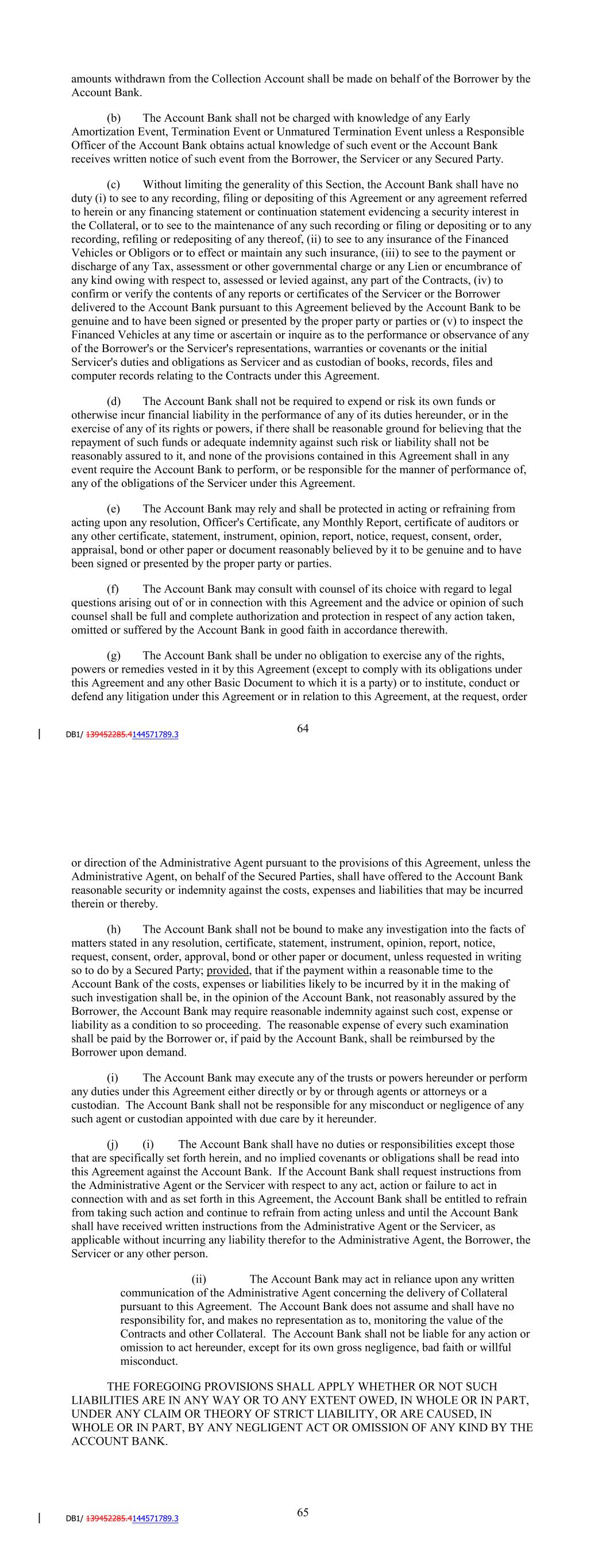 Receivables (and the other related Collateral) to be released to the Borrower, including a Take-out Release, in favor of the Borrower as the Borrower may reasonably request, (ii) deliver, or cause to be delivered, any portion of the Receivables (and the other related Collateral) to be released to the Borrower in its possession to the Borrower and (iii) otherwise take such actions, and cause or permit the Collateral Custodian to take such actions, as are necessary and appropriate to release the Lien of the Administrative Agent on the portion of the Receivables (and the other related Collateral) to be released to the Borrower and deliver to the Borrower such Receivables and related Collateral. Section 2.13. The Account Bank. (a) The Borrower hereby appoints JPMorgan Chase Bank, N.A. as the initial Account Bank. All payments of amounts due and payable in respect of the Obligations that are to be made from amounts withdrawn from the Collection Account shall be made on behalf of the Borrower by the Account Bank. (b) The Account Bank shall not be charged with knowledge of any Early Amortization Event, Termination Event or Unmatured Termination Event unless a Responsible Officer of the Account Bank obtains actual knowledge of such event or the Account Bank receives written notice of such event from the Borrower, the Servicer or any Secured Party. (c) Without limiting the generality of this Section, the Account Bank shall have no duty (i) to see to any recording, filing or depositing of this Agreement or any agreement referred to herein or any financing statement or continuation statement evidencing a security interest in the Collateral, or to see to the maintenance of any such recording or filing or depositing or to any recording, refiling or redepositing of any thereof, (ii) to see to any insurance of the Financed Vehicles or Obligors or to effect or maintain any such insurance, (iii) to see to the payment or discharge of any Tax, assessment or other governmental charge or any Lien or encumbrance of any kind owing with respect to, assessed or levied against, any part of the Contracts, (iv) to confirm or verify the contents of any reports or certificates of the Servicer or the Borrower delivered to the Account Bank pursuant to this Agreement believed by the Account Bank to be genuine and to have been signed or presented by the proper party or parties or (v) to inspect the Financed Vehicles at any time or ascertain or inquire as to the performance or observance of any of the Borrower's or the Servicer's representations, warranties or covenants or the initial Servicer's duties and obligations as Servicer and as custodian of books, records, files and computer records relating to the Contracts under this Agreement. (d) The Account Bank shall not be required to expend or risk its own funds or otherwise incur financial liability in the performance of any of its duties hereunder, or in the exercise of any of its rights or powers, if there shall be reasonable ground for believing that the repayment of such funds or adequate indemnity against such risk or liability shall not be reasonably assured to it, and none of the provisions contained in this Agreement shall in any event require the Account Bank to perform, or be responsible for the manner of performance of, any of the obligations of the Servicer under this Agreement. (e) The Account Bank may rely and shall be protected in acting or refraining from acting upon any resolution, Officer's Certificate, any Monthly Report, certificate of auditors or 68 any other certificate, statement, instrument, opinion, report, notice, request, consent, order, appraisal, bond or other paper or document reasonably believed by it to be genuine and to have been signed or presented by the proper party or parties. (f) The Account Bank may consult with counsel of its choice with regard to legal questions arising out of or in connection with this Agreement and the advice or opinion of such counsel shall be full and complete authorization and protection in respect of any action taken, omitted or suffered by the Account Bank in good faith in accordance therewith. (g) The Account Bank shall be under no obligation to exercise any of the rights, powers or remedies vested in it by this Agreement (except to comply with its obligations under this Agreement and any other Basic Document to which it is a party) or to institute, conduct or defend any litigation under this Agreement or in relation to this Agreement, at the request, order or direction of the Administrative Agent pursuant to the provisions of this Agreement, unless the Administrative Agent, on behalf of the Secured Parties, shall have offered to the Account Bank reasonable security or indemnity against the costs, expenses and liabilities that may be incurred therein or thereby. (h) The Account Bank shall not be bound to make any investigation into the facts of matters stated in any resolution, certificate, statement, instrument, opinion, report, notice, request, consent, order, approval, bond or other paper or document, unless requested in writing so to do by a Secured Party; provided, that if the payment within a reasonable time to the Account Bank of the costs, expenses or liabilities likely to be incurred by it in the making of such investigation shall be, in the opinion of the Account Bank, not reasonably assured by the Borrower, the Account Bank may require reasonable indemnity against such cost, expense or liability as a condition to so proceeding. The reasonable expense of every such examination shall be paid by the Borrower or, if paid by the Account Bank, shall be reimbursed by the Borrower upon demand. (i) The Account Bank may execute any of the trusts or powers hereunder or perform any duties under this Agreement either directly or by or through agents or attorneys or a custodian. The Account Bank shall not be responsible for any misconduct or negligence of any such agent or custodian appointed with due care by