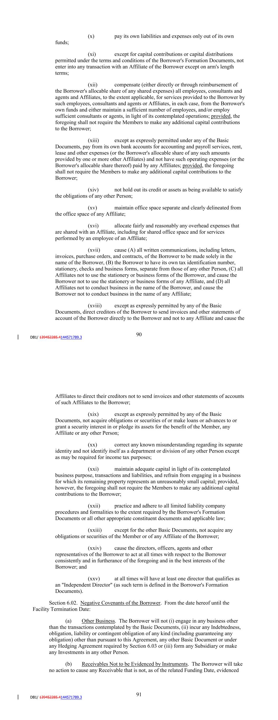 Affiliates to direct their creditors not to send invoices and other statements of accounts of such Affiliates to the Borrower; (xix) except as expressly permitted by any of the Basic Documents, not acquire obligations or securities of or make loans or advances to or grant a security interest in or pledge its assets for the benefit of the Member, any Affiliate or any other Person; (xx) correct any known misunderstanding regarding its separate identity and not identify itself as a department or division of any other Person except as may be required for income tax purposes; (xxi) maintain adequate capital in light of its contemplated business purpose, transactions and liabilities, and refrain from engaging in a business for which its remaining property represents an unreasonably small capital; provided, however, the foregoing shall not require the Members to make any additional capital contributions to the Borrower; (xxii) practice and adhere to all limited liability company procedures and formalities to the extent required by the Borrower's Formation Documents or all other appropriate constituent documents and applicable law; (xxiii) except for the other Basic Documents, not acquire any obligations or securities of the Member or of any Affiliate of the Borrower; (xxiv) cause the directors, officers, agents and other representatives of the Borrower to act at all times with respect to the Borrower consistently and in furtherance of the foregoing and in the best interests of the Borrower; and (xxv) at all times will have at least one director that qualifies as an "Independent Director" (as such term is defined in the Borrower's Formation Documents). Section 6.02. Negative Covenants of the Borrower. From the date hereof until the Facility Termination Date: (a) Other Business. The Borrower will not (i) engage in any business other than the transactions contemplated by the Basic Documents, (ii) incur any Indebtedness, obligation, liability or contingent obligation of any kind (including guaranteeing any obligation) other than pursuant to this Agreement, any other Basic Document or under any Hedging Agreement required by Section 6.03 or (iii) form any Subsidiary or make any Investments in any other Person. (b) Receivables Not to be Evidenced by Instruments. The Borrower will take no action to cause any Receivable that is not, as of the related Funding Date, evidenced 96 by an Instrument, to be so evidenced except in connection with the enforcement or collection of such Receivable. (c) Security Interests. The Borrower will not sell, pledge, assign or transfer to any other Person, or grant, create, incur, assume or suffer to exist any Lien (other than Permitted Liens) on any portion of the Collateral, whether now existing or hereafter transferred hereunder, or any interest therein, and the Borrower will not sell, pledge, assign or suffer to exist any Lien on its interest, if any, hereunder. The Borrower will promptly notify the Administrative Agent of the existence of any Lien (other than a Permitted Lien) on any portion of the Collateral and the Borrower shall defend the right, title and interest of the Administrative Agent in, to and under such Collateral, against all claims of third parties; provided, that nothing in this subsection shall prevent or be deemed to prohibit the Borrower from suffering to exist Permitted Liens upon any portion of the Collateral. (d) Mergers, Acquisitions, Sales, Etc. The Borrower will not be a party to any merger or consolidation, or purchase or otherwise acquire all or substantially all of the assets or any stock or membership interests of any class of, or any partnership or joint venture interest in, any other Person, or, sell, transfer, convey or lease all or any substantial part of its assets, or sell or assign with or without recourse any portion of the Collateral or any interest therein (other than pursuant hereto). (e) Distributions. The Borrower shall not declare or pay, directly or indirectly, any dividend or make any other distribution (whether in cash or other property) with respect to the profits, assets or capital of the Borrower or any Person's interest therein, or purchase, redeem or otherwise acquire for value any of its capital stock now or hereafter outstanding, except that so long as no Termination Event or Unmatured Termination Event has occurred and is continuing or would result therefrom, the Borrower may distribute to holders of its membership interest funds distributed to the Borrower pursuant to Section 2.06(xi), subject to Applicable Law. (f) Change of Name or Location of Receivable Files. The Borrower shall not (i) change its name or state of organization, move the location of its principal place of business and chief executive office, and the offices where it keeps the Records from the location referred to in Section 13.02 or (ii) move, or consent to the Collateral Custodian or the Servicer moving, the Receivable Files from the location thereof on the Closing Date, unless the Borrower has given at least 30 days' written notice to the Administrative Agent and has taken all actions required under the UCC of each relevant jurisdiction in order to continue the first priority perfected security interest of the Administrative Agent in the Collateral. (g) True Sale. Except for purposes of GAAP, the Borrower will not account for or treat the transactions contemplated by the Purchase Agreement in any manner other than as the sale, or absolute assignment, of the Receivables and other Collateral by DFC to the Borrower. 97