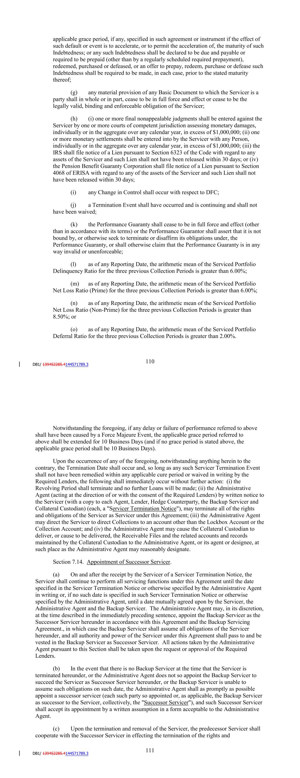 (m) as of any Reporting Date, the arithmetic mean of the Serviced Portfolio Net Loss Ratio for the three previous Collection Periods is greater than 7.25%; (n) [Reserved]; (o) as of any Reporting Date, the arithmetic mean of the Serviced Portfolio Deferral Ratio for the three previous Collection Periods is greater than 2.00%; or (p) the audit described in Section 7.07(d) for calendar year 2021 is not completed to the reasonable satisfaction of the Administrative Agent by November 5, 2021. Notwithstanding the foregoing, if any delay or failure of performance referred to above shall have been caused by a Force Majeure Event, the applicable grace period referred to above shall be extended for 10 Business Days (and if no grace period is stated above, the applicable grace period shall be 10 Business Days). Upon the occurrence of any of the foregoing, notwithstanding anything herein to the contrary, the Termination Date shall occur and, so long as any such Servicer Termination Event shall not have been remedied within any applicable cure period or waived in writing by the Required Lenders, the following shall immediately occur without further action: (i) the Revolving Period shall terminate and no further Loans will be made; (ii) the Administrative Agent (acting at the direction of or with the consent of the Required Lenders) by written notice to the Servicer (with a copy to each Agent, Lender, Hedge Counterparty, the Backup Servicer and Collateral Custodian) (each, a "Servicer Termination Notice"), may terminate all of the rights and obligations of the Servicer as Servicer under this Agreement; (iii) the Administrative Agent may direct the Servicer to direct Collections to an account other than the Lockbox Account or the Collection Account; and (iv) the Administrative Agent may cause the Collateral Custodian to deliver, or cause to be delivered, the Receivable Files and the related accounts and records maintained by the Collateral Custodian to the Administrative Agent, or its agent or designee, at such place as the Administrative Agent may reasonably designate. Section 7.14. Appointment of Successor Servicer. (a) On and after the receipt by the Servicer of a Servicer Termination Notice, the Servicer shall continue to perform all servicing functions under this Agreement until the date specified in the Servicer Termination Notice or otherwise specified by the Administrative Agent in writing or, if no such date is specified in such Servicer Termination Notice or otherwise specified by the Administrative Agent, until a date mutually agreed upon by the Servicer, the Administrative Agent and the Backup Servicer. The Administrative Agent may, in its discretion, at the time described in the immediately preceding sentence, appoint the Backup Servicer as the Successor Servicer hereunder in accordance with this Agreement and the Backup Servicing Agreement., in which case the Backup Servicer shall assume all obligations of the Servicer hereunder, and all authority and power of the Servicer under this Agreement shall pass to and be vested in the Backup Servicer as Successor Servicer. All actions taken by the Administrative 116 Agent pursuant to this Section shall be taken upon the request or approval of the Required Lenders. (b) In the event that there is no Backup Servicer at the time that the Servicer is terminated hereunder, or the Administrative Agent does not so appoint the Backup Servicer to succeed the Servicer as Successor Servicer hereunder, or the Backup Servicer is unable to assume such obligations on such date, the Administrative Agent shall as promptly as possible appoint a successor servicer (each such party so appointed or, as applicable, the Backup Servicer as successor to the Servicer, collectively, the "Successor Servicer"), and such Successor Servicer shall accept its appointment by a written assumption in a form acceptable to the Administrative Agent. (c) Upon the termination and removal of the Servicer, the predecessor Servicer shall cooperate with the Successor Servicer in effecting the termination of the rights and responsibilities of the predecessor Servicer under this Agreement, including the transfer to the Successor Servicer for administration by it of all cash amounts that shall at the time be held by the predecessor Servicer for deposit, or shall thereafter be received, with respect to a Receivable, and the related accounts and records maintained by the Servicer. In the case that the Successor Servicer shall not agree to perform any duties or obligations of the Servicer hereunder, such duties or obligations may be performed or delegated by the Administrative Agent. (d) The Administrative Agent shall have the same rights of removal and termination for cause with respect to the Successor Servicer as with respect to DFC as the Servicer. (e) The Successor Servicer shall act as Servicer hereunder and shall, subject to the availability of sufficient funds in the Collection Account pursuant to Section 2.06 (up to the Servicing Fee), receive as compensation therefor the Servicing Fee pursuant to Section 2.06. (f) All reasonable out-of-pocket costs and expenses (including attorneys' fees and disbursements) incurred in connection with the transferring of Receivables to the Successor Servicer, converting the Servicer's data to the computer system of the Successor Servicer, and amending this Agreement to reflect such succession as Servicer pursuant to this Section shall be paid by the predecessor Servicer upon presentation of reasonable transition expenses (the "Transition Expenses"). In no event shall the Successor Servicer be responsible for any Transition Expenses. If the predecessor Servicer fails to pay the Transition Expenses, the Transition Expenses shall be payable pursuant to Section 2.06. (g) Upon its appointment, the Successor Servicer shall be the successor in all respects to the Servicer with respect to servicing functions under this Agreement and shall be subject to all the 