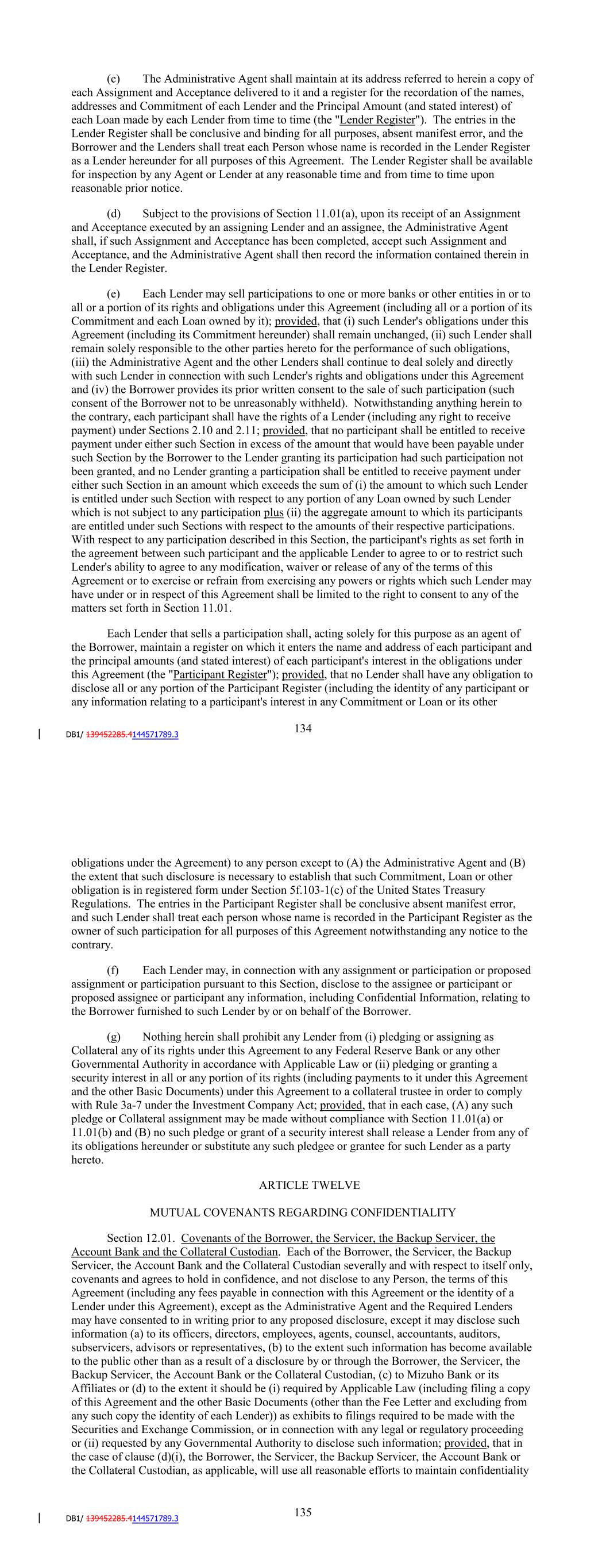 payment) under Sections 2.10 and 2.11; provided, that no participant shall be entitled to receive payment under either such Section in excess of the amount that would have been payable under such Section by the Borrower to the Lender granting its participation had such participation not been granted, and no Lender granting a participation shall be entitled to receive payment under either such Section in an amount which exceeds the sum of (i) the amount to which such Lender is entitled under such Section with respect to any portion of any Loan owned by such Lender which is not subject to any participation plus (ii) the aggregate amount to which its participants are entitled under such Sections with respect to the amounts of their respective participations. With respect to any participation described in this Section, the participant's rights as set forth in the agreement between such participant and the applicable Lender to agree to or to restrict such Lender's ability to agree to any modification, waiver or release of any of the terms of this Agreement or to exercise or refrain from exercising any powers or rights which such Lender may have under or in respect of this Agreement shall be limited to the right to consent to any of the matters set forth in Section 11.01. Each Lender that sells a participation shall, acting solely for this purpose as an agent of the Borrower, maintain a register on which it enters the name and address of each participant and the principal amounts (and stated interest) of each participant's interest in the obligations under this Agreement (the "Participant Register"); provided, that no Lender shall have any obligation to disclose all or any portion of the Participant Register (including the identity of any participant or any information relating to a participant's interest in any Commitment or Loan or its other obligations under the Agreement) to any person except to (A) the Administrative Agent and (B) the extent that such disclosure is necessary to establish that such Commitment, Loan or other obligation is in registered form under Section 5f.103-1(c) of the United States Treasury Regulations. The entries in the Participant Register shall be conclusive absent manifest error, and such Lender shall treat each person whose name is recorded in the Participant Register as the owner of such participation for all purposes of this Agreement notwithstanding any notice to the contrary. (f) Each Lender may, in connection with any assignment or participation or proposed assignment or participation pursuant to this Section, disclose to the assignee or participant or proposed assignee or participant any information, including Confidential Information, relating to the Borrower furnished to such Lender by or on behalf of the Borrower. (g) Nothing herein shall prohibit any Lender from (i) pledging or assigning as Collateral any of its rights under this Agreement to any Federal Reserve Bank or any other Governmental Authority in accordance with Applicable Law or (ii) pledging or granting a security interest in all or any portion of its rights (including payments to it under this Agreement and the other Basic Documents) under this Agreement to a collateral trustee in order to comply with Rule 3a-7 under the Investment Company Act; provided, that in each case, (A) any such pledge or Collateral assignment may be made without compliance with Section 11.01(a) or 11.01(b) and (B) no such pledge or grant of a security interest shall release a Lender from any of its obligations hereunder or substitute any such pledgee or grantee for such Lender as a party hereto. 140 ARTICLE TWELVE MUTUAL COVENANTS REGARDING CONFIDENTIALITY Section 12.01. Covenants of the Borrower, the Servicer, the Backup Servicer, the Account Bank and the Collateral Custodian. Each of the Borrower, the Servicer, the Backup Servicer, the Account Bank and the Collateral Custodian severally and with respect to itself only, covenants and agrees to hold in confidence, and not disclose to any Person, the terms of this Agreement (including any fees payable in connection with this Agreement or the identity of a Lender under this Agreement), except as the Administrative Agent and the Required Lenders may have consented to in writing prior to any proposed disclosure, except it may disclose such information (a) to its officers, directors, employees, agents, counsel, accountants, auditors, subservicers, advisors or representatives, (b) to the extent such information has become available to the public other than as a result of a disclosure by or through the Borrower, the Servicer, the Backup Servicer, the Account Bank or the Collateral Custodian, (c) to JPMorgan Chase Bank or its Affiliates or (d) to the extent it should be (i) required by Applicable Law (including filing a copy of this Agreement and the other Basic Documents (other than the Fee Letter and excluding from any such copy the identity of each Lender)) as exhibits to filings required to be made with the Securities and Exchange Commission, or in connection with any legal or regulatory proceeding or (ii) requested by any Governmental Authority to disclose such information; provided, that in the case of clause (d)(i), the Borrower, the Servicer, the Backup Servicer, the Account Bank or the Collateral Custodian, as applicable, will use all reasonable efforts to maintain confidentiality and will (unless otherwise prohibited by law) notify the Agent or Lender of its intention to make any such disclosure prior to making such disclosure. Section 12.02. Covenants of the Administrative Agent, the Agents and the Lenders. (a) Each of the Administrative Agent, each Agent and each Lender covenants and agrees that it will not disclose any of the Confidential Information at any time received or obtained by it without the Borrower's prior written consent; provided, that it may disclose any such Confidential Information (i) in connection with participations and assignments pursuant to