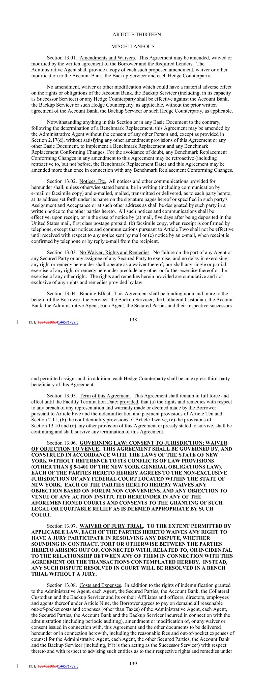 Section 13.02. Notices, Etc. All notices and other communications provided for hereunder shall, unless otherwise stated herein, be in writing (including communication by e-mail) and e-mailed, mailed or delivered, as to each party hereto, at its address set forth under its name on the signature pages hereof or specified in such party's Assignment and Acceptance or at such other address as shall be designated by such party in a written notice to the other parties hereto. Notices sent by hand or overnight courier service, or mailed by certified or registered mail, shall be deemed to have been given when received. Notices and other communications sent to an e-mail address shall be deemed received upon the sender’s receipt of an acknowledgement from the intended recipient (such as by the “return receipt requested” function, as available, return e-mail or other written acknowledgement); provided that if such notice, email or other communication is not sent during the normal business hours of the recipient, such notice or communication shall be deemed to have been sent at the opening of business on the next business day for the recipient. Section 13.03. No Waiver, Rights and Remedies. No failure on the part of any Agent or any Secured Party or any assignee of any Secured Party to exercise, and no delay in exercising, any right or remedy hereunder shall operate as a waiver thereof; nor shall any single or partial exercise of any right or remedy hereunder preclude any other or further exercise thereof or the exercise of any other right. The rights and remedies herein provided are cumulative and not exclusive of any rights and remedies provided by law. Section 13.04. Binding Effect. This Agreement shall be binding upon and inure to the benefit of the Borrower, the Servicer, the Backup Servicer, the Collateral Custodian, the Account Bank, the Administrative Agent, each Agent, the Secured Parties and their respective successors and permitted assigns and, in addition, each Hedge Counterparty shall be an express third-party beneficiary of this Agreement. Section 13.05. Term of this Agreement. This Agreement shall remain in full force and effect until the Facility Termination Date; provided, that (a) the rights and remedies with respect to any breach of any representation and warranty made or deemed made by the Borrower pursuant to Article Five and the indemnification and payment provisions of Article Ten and Section 2.11, (b) the confidentiality provisions of Article Twelve, (c) the provisions of Section 13.10 and (d) any other provision of this Agreement expressly stated to survive, shall be continuing and shall survive any termination of this Agreement. Section 13.06. GOVERNING LAW; CONSENT TO JURISDICTION; WAIVER OF OBJECTION TO VENUE. THIS AGREEMENT SHALL BE GOVERNED BY, AND CONSTRUED IN ACCORDANCE WITH, THE LAWS OF THE STATE OF NEW YORK WITHOUT REFERENCE TO ITS CONFLICTS OF LAW PROVISIONS (OTHER THAN § 5-1401 OF THE NEW YORK GENERAL OBLIGATIONS LAW). EACH OF THE PARTIES HERETO HEREBY AGREES TO THE NON-EXCLUSIVE JURISDICTION OF ANY FEDERAL COURT LOCATED WITHIN THE STATE OF NEW YORK. EACH OF THE PARTIES HERETO HEREBY WAIVES ANY OBJECTION BASED ON FORUM NON CONVENIENS, AND ANY OBJECTION TO VENUE OF ANY ACTION INSTITUTED HEREUNDER IN ANY OF THE AFOREMENTIONED COURTS AND CONSENTS TO THE GRANTING OF SUCH 144 LEGAL OR EQUITABLE RELIEF AS IS DEEMED APPROPRIATE BY SUCH COURT. Section 13.07. WAIVER OF JURY TRIAL. TO THE EXTENT PERMITTED BY APPLICABLE LAW, EACH OF THE PARTIES HERETO WAIVES ANY RIGHT TO HAVE A JURY PARTICIPATE IN RESOLVING ANY DISPUTE, WHETHER SOUNDING IN CONTRACT, TORT OR OTHERWISE BETWEEN THE PARTIES HERETO ARISING OUT OF, CONNECTED WITH, RELATED TO, OR INCIDENTAL TO THE RELATIONSHIP BETWEEN ANY OF THEM IN CONNECTION WITH THIS AGREEMENT OR THE TRANSACTIONS CONTEMPLATED HEREBY. INSTEAD, ANY SUCH DISPUTE RESOLVED IN COURT WILL BE RESOLVED IN A BENCH TRIAL WITHOUT A JURY. Section 13.08. Costs and Expenses. In addition to the rights of indemnification granted to the Administrative Agent, each Agent, the Secured Parties, the Account Bank, the Collateral Custodian and the Backup Servicer and its or their Affiliates and officers, directors, employees and agents thereof under Article Nine, the Borrower agrees to pay on demand all reasonable out-of-pocket costs and expenses (other than Taxes) of the Administrative Agent, each Agent, the Secured Parties, the Account Bank and the Backup Servicer incurred in connection with the administration (including periodic auditing), amendment or modification of, or any waiver or consent issued in connection with, this Agreement and the other documents to be delivered hereunder or in connection herewith, including the reasonable fees and out-of-pocket expenses of counsel for the Administrative Agent, each Agent, the other Secured Parties, the Account Bank and the Backup Servicer (including, if it is then acting as the Successor Servicer) with respect thereto and with respect to advising such entities as to their respective rights and remedies under this Agreement and the other documents to be delivered hereunder or in connection herewith, and all costs and expenses, if any (including reasonable counsel fees and expenses), incurred by such entities in connection with the enforcement of this Agreement and the other documents to be delivered hereunder or in connection herewith. Section 13.09. No Insolvency Proceedings. (a) Notwithstanding any prior termination of this Agreement, no Lender shall, prior to the date which is one year and one day after the final payment of the Aggregate Unpaids, petition, cooperate with or encourage any other Person in petitioning or otherwise invoke the process of any Governmental Authority for the purpose of commencing or sustaining an Insolvency Proceeding against the Borrower under any United States federal or State Insolvency Laws or appointing a receiver, liquidator, assignee, trustee, custodian, sequestrator or other simi
