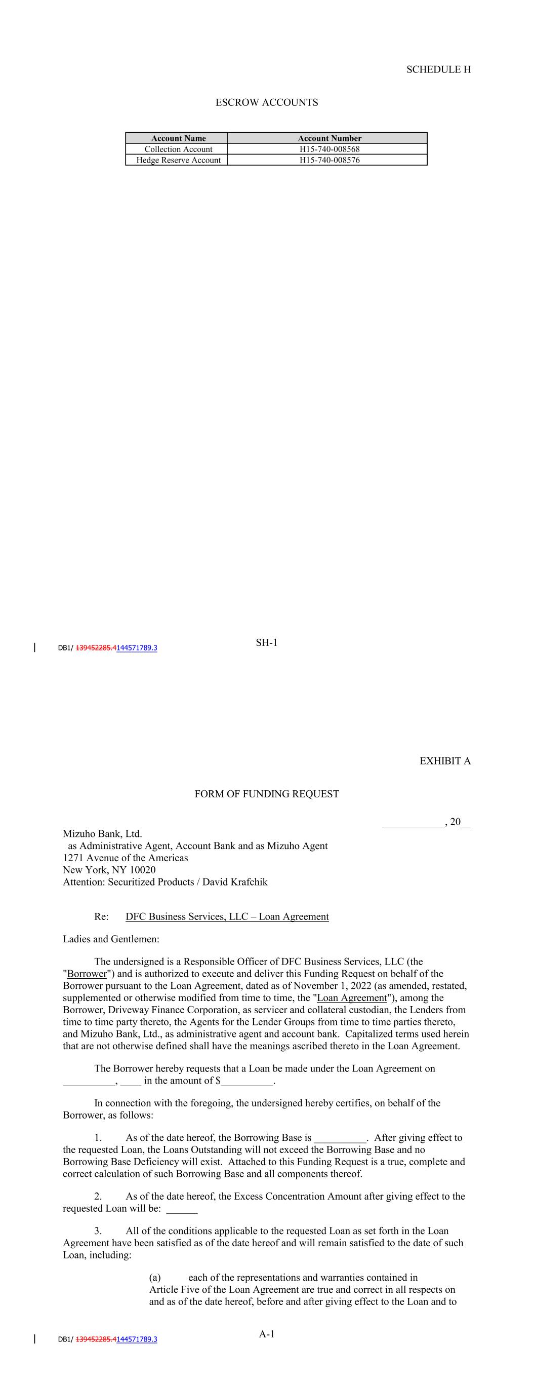 EXHIBIT A FORM OF FUNDING REQUEST ____________, 20__ JPMorgan Chase Bank, N.A., as Administrative Agent, Account Bank and as JPMorgan Agent Chase Tower, 7th Floor 10 South Dearborn Street Mail Code IL1-0079 Chicago, Illinois 60603 Attention: Asset-Backed Securities Portfolio Management Citibank, N.A., as Citibank Agent [Address] Attention: [__] Re: SCFC Business Services LLC – Loan Agreement Ladies and Gentlemen: The undersigned is a Responsible Officer of SCFC Business Services LLC (the "Borrower") and is authorized to execute and deliver this Funding Request on behalf of the Borrower pursuant to the Amended and Restated Loan Agreement, dated as of December 31, 2020 (as amended, restated, supplemented or otherwise modified from time to time, the "Loan Agreement"), among the Borrower, Driveway Finance Corporation, as servicer and collateral custodian, the Lenders from time to time party thereto, the Agents for the Lender Groups from time to time parties thereto, and JPMorgan Chase Bank, N.A., as administrative agent and account bank. Capitalized terms used herein that are not otherwise defined shall have the meanings ascribed thereto in the Loan Agreement. The Borrower hereby requests that a Loan be made under the Loan Agreement on __________, ____ in the amount of $__________. In connection with the foregoing, the undersigned hereby certifies, on behalf of the Borrower, as follows: 1. As of the date hereof, the Borrowing Base is __________. After giving effect to the requested Loan, the Loans Outstanding will not exceed the Borrowing Base and no Borrowing Base Deficiency will exist. Attached to this Funding Request is a true, complete and correct calculation of such Borrowing Base and all components thereof. A-1 2. As of the date hereof, the Excess Concentration Amount after giving effect to the requested Loan will be: ______ 3. All of the conditions applicable to the requested Loan as set forth in the Loan Agreement have been satisfied as of the date hereof and will remain satisfied to the date of such Loan, including: (a) each of the representations and warranties contained in Article Five of the Loan Agreement are true and correct in all respects on and as of the date hereof, before and after giving effect to the Loan and to the application of the proceeds therefrom as though made on and as of the date hereof; (b) no event has occurred and is continuing, or would result from such Loan or from the application of the proceeds therefrom, which constitutes a Termination Event or Unmatured Termination Event; (c) the Borrower is in material compliance with each of its agreements set forth in the Loan Agreement; (d) no Servicer Termination Event or Unmatured Servicer Termination Event has occurred; and (e) no adverse selection procedures were used by the Borrower with respect to the Receivables which will become a part of the Collateral on the Funding Date. 4. The requested Loan will not, on the Funding Date, exceed the Available Amount and after giving effect to the requested Loan, the Loans Outstanding will not exceed the Borrowing Base. 5. The Hedging Agreement is in effect as required by Section 6.03 of the Loan Agreement. 6. Attached hereto is a true, correct and complete Schedule A to the Purchase Agreement, reflecting all Receivables which will become part of the Collateral on the Funding Date, each Receivable reflected thereon being an Eligible Receivable. 7. The Cutoff Date with respect to the Receivables is , 20_ . SCFC BUSINESS SERVICES LLC By: Name: Title: A-2