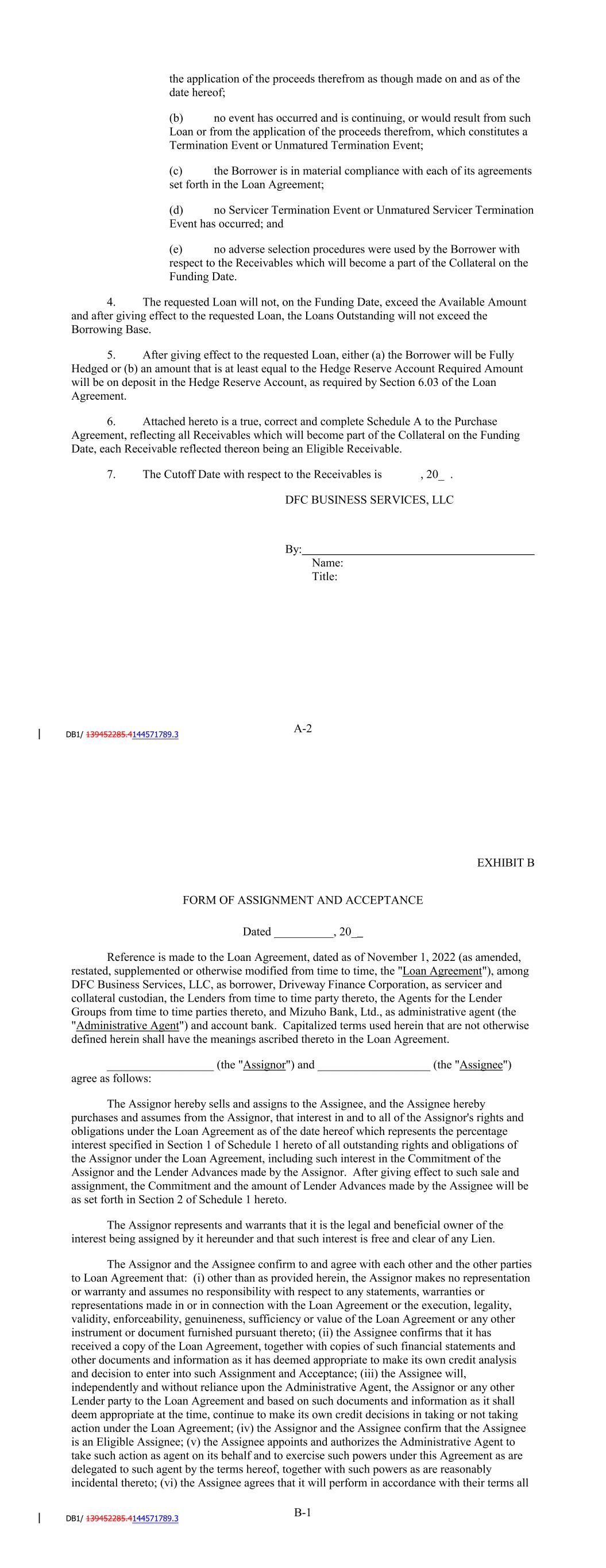 EXHIBIT B FORM OF ASSIGNMENT AND ACCEPTANCE Dated __________, 20_ Reference is made to the Amended and Restated Loan Agreement, dated as of December 31, 2020 (as amended, restated, supplemented or otherwise modified from time to time, the "Loan Agreement"), among SCFC Business Services LLC, as borrower, Driveway Finance Corporation, as servicer and collateral custodian, the Lenders from time to time party thereto, the Agents for the Lender Groups from time to time parties thereto, and JPMorgan Chase Bank, N.A., as administrative agent (the "Administrative Agent") and account bank. Capitalized terms used herein that are not otherwise defined herein shall have the meanings ascribed thereto in the Loan Agreement. __________________ (the "Assignor") and ___________________ (the "Assignee") agree as follows: The Assignor hereby sells and assigns to the Assignee, and the Assignee hereby purchases and assumes from the Assignor, that interest in and to all of the Assignor's rights and obligations under the Loan Agreement as of the date hereof which represents the percentage interest specified in Section 1 of Schedule 1 hereto of all outstanding rights and obligations of the Assignor under the Loan Agreement, including such interest in the Commitment of the Assignor and the Lender Advances made by the Assignor. After giving effect to such sale and assignment, the Commitment and the amount of Lender Advances made by the Assignee will be as set forth in Section 2 of Schedule 1 hereto. The Assignor represents and warrants that it is the legal and beneficial owner of the interest being assigned by it hereunder and that such interest is free and clear of any Lien. The Assignor and the Assignee confirm to and agree with each other and the other parties to Loan Agreement that: (i) other than as provided herein, the Assignor makes no representation or warranty and assumes no responsibility with respect to any statements, warranties or representations made in or in connection with the Loan Agreement or the execution, legality, validity, enforceability, genuineness, sufficiency or value of the Loan Agreement or any other instrument or document furnished pursuant thereto; (ii) the Assignee confirms that it has received a copy of the Loan Agreement, together with copies of such financial statements and other documents and information as it has deemed appropriate to make its own credit analysis and decision to enter into such Assignment and Acceptance; (iii) the Assignee will, independently and without reliance upon the Administrative Agent, the Assignor or any other Lender party to the Loan Agreement and based on such documents and information as it shall deem appropriate at the time, continue to make its own credit decisions in taking or not taking action under the Loan Agreement; (iv) the Assignor and the Assignee confirm that the Assignee is an Eligible Assignee; (v) the Assignee appoints and authorizes the Administrative Agent to take such action as agent on its behalf and to exercise such powers under this Agreement as are delegated to such agent by the terms hereof, together with such powers as are reasonably B-1 incidental thereto; (vi) the Assignee agrees that it will perform in accordance with their terms all of the obligations which by the terms of the Loan Agreement are required to be performed by it as a Lender, including the confidentiality provisions of Article Twelve; and (vii) this Assignment and Acceptance meets all other requirements for such an Assignment and Acceptance set forth in Article Eleven of the Loan Agreement. Following the execution of this Assignment and Acceptance by the Assignor and the Assignee, it will be delivered to the Administrative Agent for acceptance. The effective date of this Assignment and Acceptance (the "Assignment Date") shall be the date of acceptance thereof by the Administrative Agent, unless a later date is specified in Section 3 of Schedule 1 hereto. The Assignor and the Assignee agree to reimburse the Administrative Agent for all reasonable fees, costs and expenses (including reasonable fees and out-of-pocket expenses of counsel for the Administrative Agent) incurred by the Administrative Agent in connection with this Assignment and Acceptance. Upon such acceptance by the Administrative Agent, the Assignee shall be a party to the Loan Agreement and, to the extent provided in this Assignment and Acceptance, have the rights and obligations of a Lender thereunder, provided, that the Assignor shall, to the extent such rights have been assigned by it under this Assignment and Acceptance, relinquish its assigned rights and be released from its assigned obligations under the Loan Agreement (and, in the case of an Assignment and Acceptance coving all or the remaining portion of an assigning Assignor's rights and obligations under the Loan Agreement, Assignor shall cease to be a party thereto). Upon such acceptance by the Administrative Agent, from and after the Assignment Date, the Administrative Agent shall make, or cause to be made, all payments under the Loan Agreement in respect of the interest assigned hereby (including, without limitation, all payments of principal, interest and fees with respect thereto) to the Assignee. The Assignor and Assignee shall make all appropriate adjustments in payments under the Loan Agreement for periods prior to the Assignment Date directly between themselves. THIS ASSIGNMENT AND ACCEPTANCE SHALL BE GOVERNED BY, AND CONSTRUED IN ACCORDANCE WITH, THE LAWS OF THE STATE OF NEW YORK. B-2